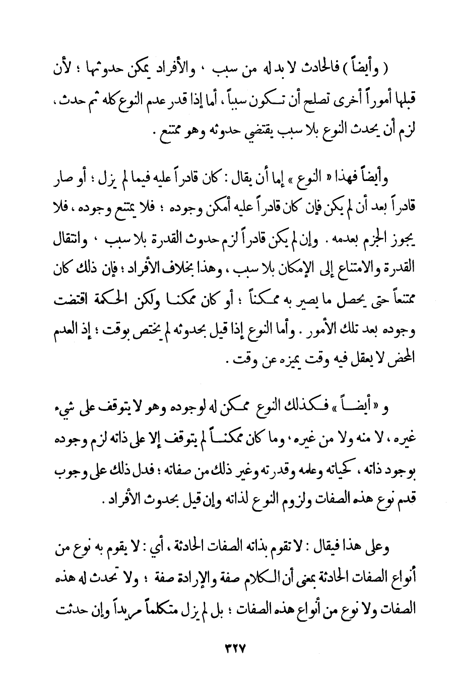 وَأَيْضًا فَالْحَادِثُ لَا بُدَّ لَهُ مِنْ سَبَبٍ وَالْأَفْرَادُ يُمْكِنُ حُدُوثُهَا؛ لِأَنَّ قَبْلَهَا أُمُورًا أُخْرَى تَصْلُحُ أَنْ تَكُونَ سَبَبًا أَمَّا إذَا قُدِّرَ عَدَمُ النَّوْعِ كُلِّهِ ثُمَّ حَدَثَ لَزِمَ أَنْ يَحْدُثَ النَّوْعُ بِلَا سَبَبٍ يَقْتَضِي حُدُوثَهُ وَهُوَ مُمْتَنِعٌ. وَأَيْضًا فَهَذَا " النَّوْعُ " إمَّا أَنْ يُقَالَ: كَانَ قَادِرًا عَلَيْهِ فِيمَا لَمْ يَزَلْ؛ أَوْ صَارَ قَادِرًا بَعْدَ أَنْ لَمْ يَكُنْ فَإِنْ كَانَ قَادِرًا عَلَيْهِ أَمْكَنَ وُجُودُهُ؛ فَلَا يَمْتَنِعُ وُجُودُهُ فَلَا يَجُوزُ الْجَزْمُ بِعَدَمِهِ. وَإِنْ لَمْ يَكُنْ قَادِرًا لَزِمَ حُدُوثُ الْقُدْرَةِ بِلَا سَبَبٍ وَانْتِقَالُ الْقُدْرَةِ وَالِامْتِنَاعُ إلَى الْإِمْكَانِ بِلَا سَبَبٍ وَهَذَا بِخِلَافِ الْأَفْرَادِ؛ فَإِنَّ ذَلِكَ كَانَ مُمْتَنِعًا حَتَّى يَحْصُلَ مَا يَصِيرُ بِهِ مُمْكِنًا؛ أَوْ كَانَ مُمْكِنًا وَلَكِنَّ الْحِكْمَةَ اقْتَضَتْ وُجُودَهُ بَعْدَ تِلْكَ الْأُمُورِ. وَأَمَّا النَّوْعُ إذَا قِيلَ بِحُدُوثِهِ لَمْ يَخْتَصَّ بِوَقْتِ؛ إذْ الْعَدَمُ الْمَحْضُ لَا يُعْقَلُ فِيهِ وَقْتٌ يُمَيِّزُهُ عَنْ وَقْتٍ. وَ " أَيْضًا " فَكَذَلِكَ النَّوْعُ مُمْكِنٌ لَهُ لِوُجُودِهِ وَهُوَ لَا يَتَوَقَّفُ عَلَى شَيْءٍ غَيْرِهِ لَا مِنْهُ وَلَا مِنْ غَيْرِهِ وَمَا كَانَ مُمْكِنًا لَمْ يَتَوَقَّفْ إلَّا عَلَى ذَاتِهِ لَزِمَ وُجُودُهُ بِوُجُودِ ذَاتِهِ كَحَيَاتِهِ وَعِلْمِهِ وَقُدْرَتِهِ وَغَيْرِ ذَلِكَ مِنْ صِفَاتِهِ؛ فَدَلَّ ذَلِكَ عَلَى وُجُوبِ قِدَمِ نَوْعِ هَذِهِ الصِّفَات وَلُزُومِ النَّوْعِ لِذَاتِهِ وَإِنْ قِيلَ بِحُدُوثِ الْأَفْرَادِ. وَعَلَى هَذَا فَيُقَالُ: لَا تَقُومُ بِذَاتِهِ الصِّفَات الْحَادِثَةُ أَيْ: لَا يَقُومُ بِهِ نَوْعٌ مِنْ أَنْوَاعِ الصِّفَات الْحَادِثَةِ بِمَعْنَى أَنَّ الْكَلَامَ صِفَةٌ وَالْإِرَادَةَ صِفَةٌ؛ وَلَا تَحْدُثُ لَهُ هَذِهِ الصِّفَات وَلَا نَوْعٌ مِنْ أَنْوَاعِ هَذِهِ الصِّفَات؛ بَلْ لَمْ يَزَلْ مُتَكَلِّمًا مُرِيدًا وَإِنْ حَدَثَتْ
