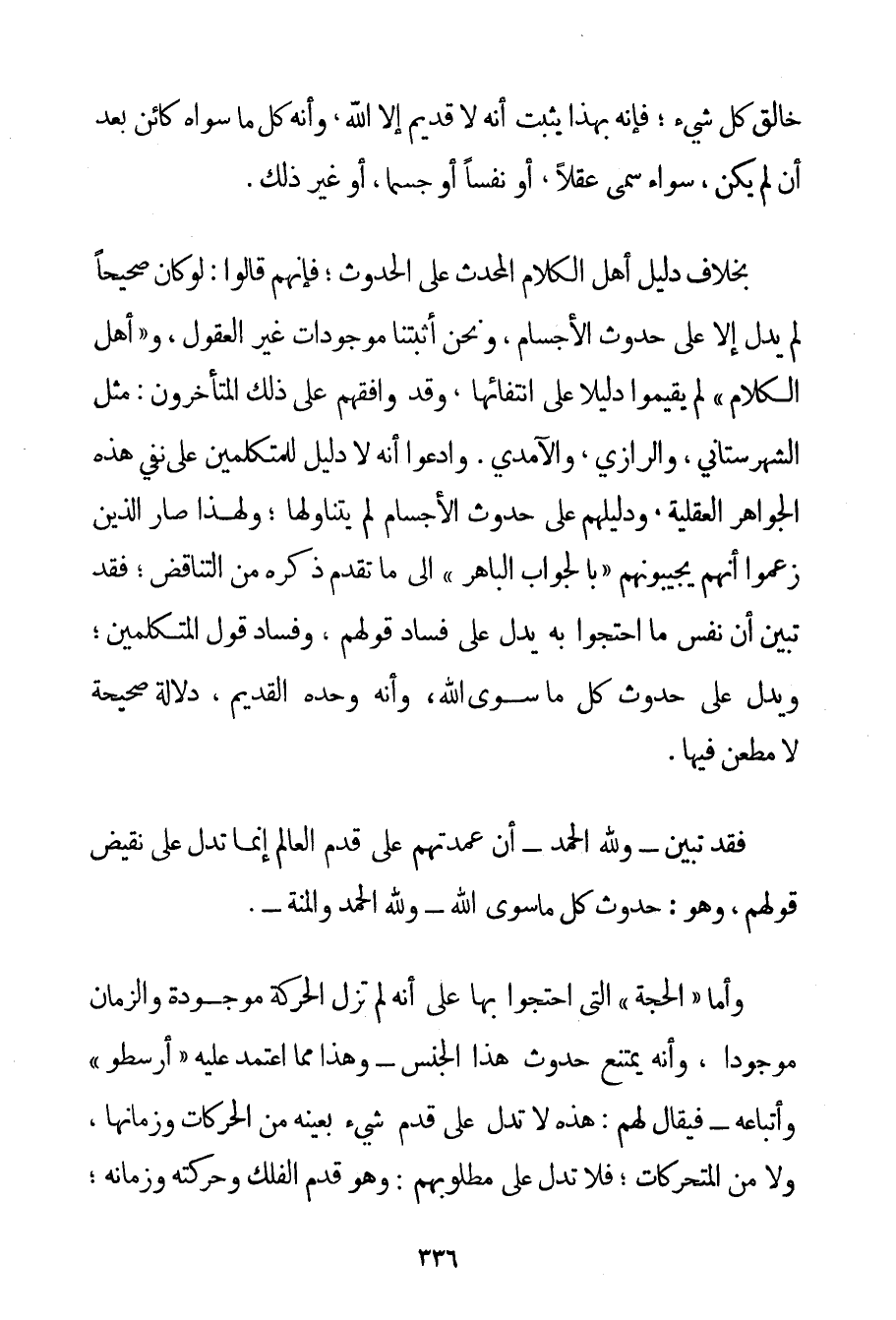 خَالِقُ كُلِّ شَيْءٍ؛ فَإِنَّهُ بِهَذَا يَثْبُتُ أَنَّهُ لَا قَدِيمَ إلَّا اللَّهُ وَأَنَّهُ كُلُّ مَا سِوَاهُ كَائِنٌ بَعْدَ أَنْ لَمْ يَكُنْ سَوَاءٌ سُمِّيَ عَقْلًا أَوْ نَفْسًا أَوْ جِسْمًا أَوْ غَيْرَ ذَلِكَ. بِخِلَافِ دَلِيلِ أَهْلِ الْكَلَامِ الْمُحْدَثِ عَلَى الْحُدُوثِ؛ فَإِنَّهُمْ قَالُوا: لَوْ كَانَ صَحِيحًا لَمْ يَدُلَّ إلَّا عَلَى حُدُوثِ الْأَجْسَامِ وَنَحْنُ أَثْبَتْنَا مَوْجُودَاتٍ غَيْرَ الْعُقُولِ وَ " أَهْلُ الْكَلَامِ " لَمْ يُقِيمُوا دَلِيلًا عَلَى انْتِفَائِهَا وَقَدْ وَافَقَهُمْ عَلَى ذَلِكَ الْمُتَأَخِّرُونَ: مِثْلُ الشِّهْرِسْتَانِيّ وَالرَّازِي والآمدي. وَادَّعَوْا أَنَّهُ لَا دَلِيلَ لِلْمُتَكَلِّمِينَ عَلَى نَفْيِ هَذِهِ الْجَوَاهِرِ الْعَقْلِيَّةِ وَدَلِيلُهُمْ عَلَى حُدُوثِ الْأَجْسَامِ لَمْ يَتَنَاوَلْهَا؛ وَلِهَذَا صَارَ الَّذِينَ زَعَمُوا أَنَّهُمْ يُجِيبُونَهُمْ " بِالْجَوَابِ الْبَاهِرِ " إلَى مَا تَقَدَّمَ ذِكْرُهُ مِنْ التَّنَاقُضِ؛ فَقَدْ تَبَيَّنَ أَنَّ نَفْسَ مَا احْتَجُّوا بِهِ يَدُلُّ عَلَى فَسَادِ قَوْلِهِمْ وَفَسَادِ قَوْلِ الْمُتَكَلِّمِينَ؛ وَيَدُلُّ عَلَى حُدُوثِ كُلِّ مَا سِوَى اللَّهِ وَأَنَّهُ وَحْدَهُ الْقَدِيمُ دَلَالَةً صَحِيحَةً لَا مَطْعَنَ فِيهَا. فَقَدْ تَبَيَّنَ - وَلِلَّهِ الْحَمْدُ - أَنَّ عُمْدَتَهُمْ عَلَى قِدَمِ الْعَالَمِ إنَّمَا تَدُلُّ عَلَى نَقِيضِ قَوْلِهِمْ وَهُوَ: حُدُوثُ كُلِّ مَا سِوَى اللَّهِ - وَلِلَّهِ الْحَمْدُ وَالْمِنَّةُ -. وَأَمَّا " الْحُجَّةُ " الَّتِي احْتَجُّوا بِهَا عَلَى أَنَّهُ لَمْ تَزَلْ الْحَرَكَةُ مَوْجُودَةً وَالزَّمَانُ مَوْجُودًا وَأَنَّهُ يَمْتَنِعُ حُدُوثُ هَذَا الْجِنْسِ - وَهَذَا مِمَّا اعْتَمَدَ عَلَيْهِ أَرِسْطُو " وَأَتْبَاعُهُ - فَيُقَالُ لَهُمْ: هَذِهِ لَا تَدُلُّ عَلَى قِدَمِ شَيْءٍ بِعَيْنِهِ مِنْ الْحَرَكَاتِ وَزَمَانِهَا وَلَا مِنْ الْمُتَحَرِّكَاتِ؛ فَلَا تَدُلُّ عَلَى مَطْلُوبِهِمْ: وَهُوَ قِدَمُ الْفَلَكِ وَحَرَكَتُهُ وَزَمَانُهُ؛