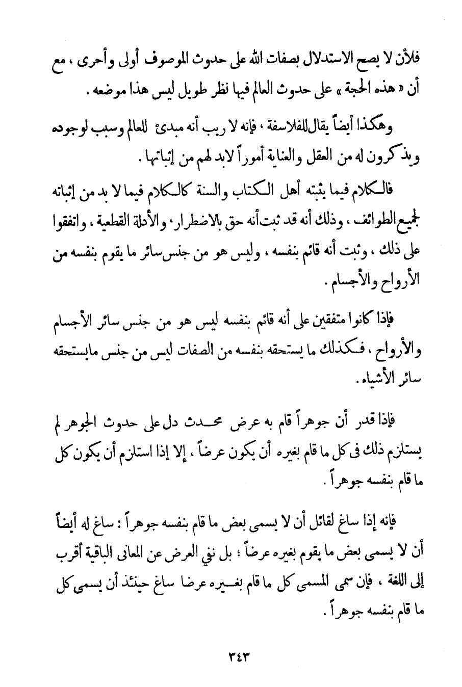 فَلَأَنْ لَا يَصِحَّ الِاسْتِدْلَالُ بِصِفَاتِ اللَّهِ عَلَى حُدُوثِ الْمَوْصُوفِ أَوْلَى وَأَحْرَى مَعَ أَنَّ " هَذِهِ الْحُجَّةَ " عَلَى حُدُوثِ الْعَالَمِ فِيهَا نَظَرٌ طَوِيلٌ لَيْسَ هَذَا مَوْضِعَهُ. وَهَكَذَا أَيْضًا يُقَالُ لِلْفَلَاسِفَةِ فَإِنَّهُ لَا رَيْبَ أَنَّهُ مُبْدِئٌ لِلْعَالَمِ وَسَبَبٌ لِوُجُودِهِ وَيَذْكُرُونَ لَهُ مِنْ الْعَقْلِ وَالْعِنَايَةِ أُمُورًا لَا بُدَّ لَهُمْ مِنْ إثْبَاتِهَا. فَالْكَلَامُ فِيمَا يُثْبِتُهُ أَهْلُ الْكِتَابِ وَالسُّنَّةِ كَالْكَلَامِ فِيمَا لَا بُدَّ مِنْ إثْبَاتِهِ لِجَمِيعِ الطَّوَائِفِ وَذَلِكَ أَنَّهُ قَدْ ثَبَتَ أَنَّهُ حَقٌّ بِالِاضْطِرَارِ وَالْأَدِلَّةِ الْقَطْعِيَّةِ وَاتَّفَقُوا عَلَى ذَلِكَ وَثَبَتَ أَنَّهُ قَائِمٌ بِنَفْسِهِ وَلَيْسَ هُوَ مِنْ جِنْسِ سَائِرِ مَا يَقُومُ بِنَفْسِهِ مِنْ الْأَرْوَاحِ وَالْأَجْسَامِ. فَإِذَا كَانُوا مُتَّفِقِينَ عَلَى أَنَّهُ قَائِمٌ بِنَفْسِهِ لَيْسَ هُوَ مِنْ جِنْسِ سَائِرِ الْأَجْسَامِ وَالْأَرْوَاحِ فَكَذَلِكَ مَا يَسْتَحِقُّهُ بِنَفْسِهِ مِنْ الصِّفَاتِ لَيْسَ مِنْ جِنْسِ مَا يَسْتَحِقُّهُ سَائِرُ الْأَشْيَاءِ. فَإِذَا قُدِّرَ أَنَّ جَوْهَرًا قَامَ بِهِ عَرَضٌ مُحْدَثٌ دَلَّ عَلَى حُدُوثِ الْجَوْهَرِ لَمْ يَسْتَلْزِمْ ذَلِكَ فِي كُلِّ مَا قَامَ بِغَيْرِهِ أَنْ يَكُونَ عَرَضًا إلَّا إذَا اسْتَلْزَمَ أَنْ يَكُونَ كُلُّ مَا قَامَ بِنَفْسِهِ جَوْهَرًا. فَإِنَّهُ إذَا سَاغَ لِقَائِلِ أَنْ لَا يُسَمِّيَ بَعْضَ مَا قَامَ بِنَفْسِهِ جَوْهَرًا: سَاغَ لَهُ أَيْضًا أَنْ لَا يُسَمِّيَ بَعْضَ مَا يَقُومُ بِغَيْرِهِ عَرَضًا؛ بَلْ نَفْيُ الْعَرَضِ عَنْ الْمَعَانِي الْبَاقِيَةِ أَقْرَبُ إلَى اللُّغَةِ فَإِنْ سَمَّى الْمُسَمِّي كُلَّ مَا قَامَ بِغَيْرِهِ عَرَضًا سَاغَ حِينَئِذٍ أَنْ يُسَمِّيَ كُلَّ مَا قَامَ بِنَفْسِهِ جَوْهَرًا.
