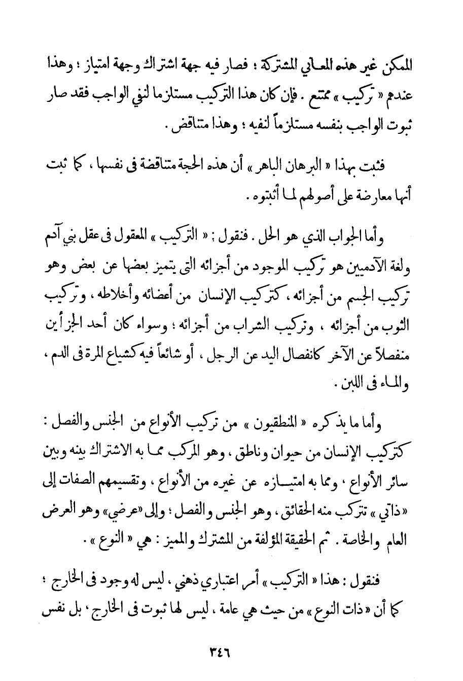 الْمُمْكِنِ غَيْرُ هَذِهِ الْمَعَانِي الْمُشْتَرَكَةِ؛ فَصَارَ فِيهِ جِهَةُ اشْتِرَاكٍ وَجِهَةُ امْتِيَازٍ؛ وَهَذَا عِنْدَهُمْ " تَرْكِيبٌ " مُمْتَنِعٌ. فَإِنْ كَانَ هَذَا التَّرْكِيبُ مُسْتَلْزِمًا لِنَفْيِ الْوَاجِبِ فَقَدْ صَارَ ثُبُوتُ الْوَاجِبِ بِنَفْسِهِ مُسْتَلْزِمًا لِنَفْيِهِ؛ وَهَذَا مُتَنَاقِضٌ. فَثَبَتَ بِهَذَا " الْبُرْهَانِ الْبَاهِرِ " أَنَّ هَذِهِ الْحُجَّةَ مُتَنَاقِضَةٌ فِي نَفْسِهَا كَمَا ثَبَتَ أَنَّهَا مُعَارَضَةٌ عَلَى أُصُولِهِمْ لِمَا أَثْبَتُوهُ. وَأَمَّا الْجَوَابُ الَّذِي هُوَ الْحَلُّ. فَنَقُولُ: " التَّرْكِيبُ " الْمَعْقُولُ فِي عَقْلِ بَنِي آدَمَ وَلُغَةِ الْآدَمِيِّينَ هُوَ تَرْكِيبُ الْمَوْجُودِ مِنْ أَجْزَائِهِ الَّتِي يَتَمَيَّزُ بَعْضُهَا عَنْ بَعْضٍ وَهُوَ تَرْكِيبُ الْجِسْمِ مِنْ أَجْزَائِهِ كَتَرْكِيبِ الْإِنْسَانِ مِنْ أَعْضَائِهِ وَأَخْلَاطِهِ وَتَرْكِيبِ الثَّوْبِ مِنْ أَجْزَائِهِ وَتَرْكِيبِ الشَّرَابِ مِنْ أَجْزَائِهِ؛ وَسَوَاءٌ كَانَ أَحَدُ الْجُزْأَيْنِ مُنْفَصِلًا عَنْ الْآخَرِ كَانْفِصَالِ الْيَدِ عَنْ الرِّجْلِ أَوْ شَائِعًا فِيهِ كَشِيَاعِ الْمَرَّةِ فِي الدَّمِ وَالْمَاءِ فِي اللَّبَنِ. وَأَمَّا مَا يَذْكُرُهُ " الْمَنْطِقِيُّونَ " مِنْ تَرْكِيبِ الْأَنْوَاعِ مِنْ الْجِنْسِ وَالْفَصْلِ: كَتَرْكِيبِ الْإِنْسَانِ مِنْ حَيَوَانٍ وَنَاطِقٍ وَهُوَ الْمُرَكَّبُ مِمَّا بِهِ الِاشْتِرَاكُ بَيْنَهُ وَبَيْنَ سَائِرِ الْأَنْوَاعِ وَمِمَّا بِهِ امْتِيَازُهُ عَنْ غَيْرِهِ مِنْ الْأَنْوَاعِ وَتَقْسِيمُهُمْ الصِّفَاتِ إلَى " ذَاتِيٍّ " تَتَرَكَّبُ مِنْهُ الْحَقَائِقُ وَهُوَ الْجِنْسُ وَالْفَصْلُ؛ وَإِلَى " عَرَضِيٍّ " وَهُوَ الْعَرَضُ الْعَامُّ وَالْخَاصَّةُ. ثُمَّ الْحَقِيقَةُ الْمُؤَلَّفَةُ مِنْ الْمُشْتَرَكِ وَالْمُمَيَّزِ: هِيَ " النَّوْعُ ". فَنَقُولُ: هَذَا " التَّرْكِيبُ " أَمْرٌ اعْتِبَارِيٌّ ذِهْنِيٌّ لَيْسَ لَهُ وُجُودٌ فِي الْخَارِجِ؛ كَمَا أَنَّ " ذَاتَ النَّوْعِ " مِنْ حَيْثُ هِيَ عَامَّةٌ لَيْسَ لَهَا ثُبُوتٌ فِي الْخَارِجِ بَلْ نَفْسُ