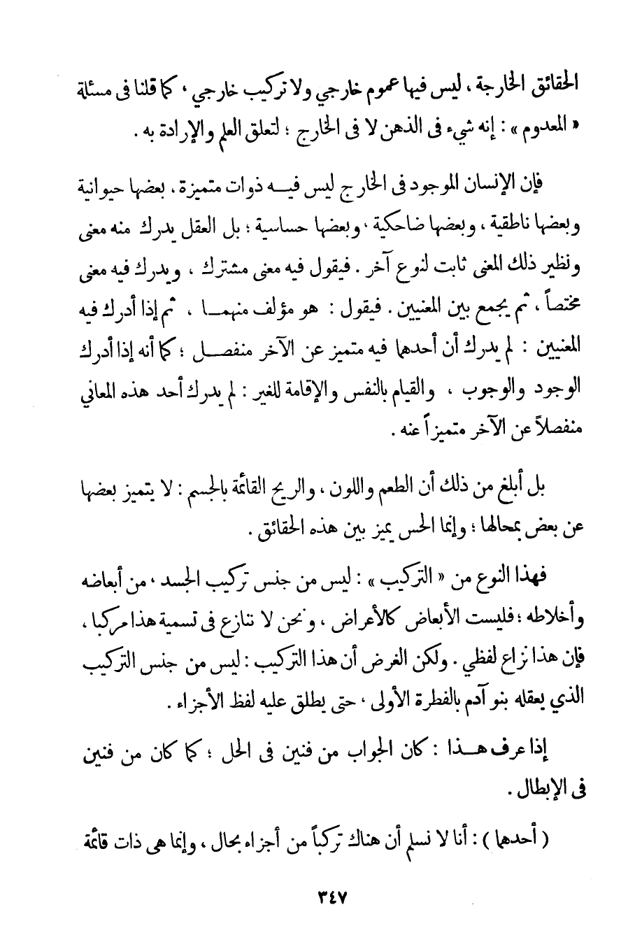 الْحَقَائِقِ الْخَارِجَةِ لَيْسَ فِيهَا عُمُومٌ خَارِجِيٌّ وَلَا تَرْكِيبٌ خَارِجِيٌّ كَمَا قُلْنَا فِي مَسْأَلَةِ " الْمَعْدُومِ ": إنَّهُ شَيْءٌ فِي الذِّهْنِ لَا فِي الْخَارِجِ؛ لِتَعَلُّقِ الْعِلْمِ وَالْإِرَادَةِ بِهِ. فَإِنَّ الْإِنْسَانَ الْمَوْجُودَ فِي الْخَارِجِ لَيْسَ فِيهِ ذَوَاتٌ مُتَمَيِّزَةٌ بَعْضُهَا حَيَوَانِيَّةٌ وَبَعْضُهَا ناطقية وَبَعْضُهَا ضاحكية وَبَعْضُهَا حَسَّاسِيَّةٌ؛ بَلْ الْعَقْلُ يُدْرِكُ مِنْهُ مَعْنًى وَنَظِيرُ ذَلِكَ الْمَعْنَى ثَابِتٌ لِنَوْعِ آخَرَ. فَيَقُولُ فِيهِ مَعْنًى مُشْتَرَكٌ وَيُدْرِكُ فِيهِ مَعْنًى مُخْتَصًّا ثُمَّ يَجْمَعُ بَيْنَ الْمَعْنَيَيْنِ. فَيَقُولُ: هُوَ مُؤَلَّفٌ مِنْهُمَا ثُمَّ إذَا أَدْرَكَ فِيهِ الْمَعْنَيَيْنِ: لَمْ يُدْرِكْ أَنَّ أَحَدَهُمَا فِيهِ مُتَمَيِّزٌ عَنْ الْآخَرِ مُنْفَصِلٌ؛ كَمَا أَنَّهُ إذَا أَدْرَكَ الْوُجُودَ وَالْوُجُوبَ وَالْقِيَامَ بِالنَّفْسِ وَالْإِقَامَةَ لِلْغَيْرِ: لَمْ يُدْرِكْ أَحَدَ هَذِهِ الْمَعَانِي مُنْفَصِلًا عَنْ الْآخَرِ مُتَمَيِّزًا عَنْهُ. بَلْ أَبْلَغُ مِنْ ذَلِكَ أَنَّ الطَّعْمَ وَاللَّوْنَ وَالرِّيحَ الْقَائِمَةَ بِالْجِسْمِ: لَا يَتَمَيَّزُ بَعْضُهَا عَنْ بَعْضٍ بِمَحَالِّهَا؛ وَإِنَّمَا الْحِسُّ يُمَيِّزُ بَيْنَ هَذِهِ الْحَقَائِقِ. فَهَذَا النَّوْعُ مِنْ " التَّرْكِيبِ ": لَيْسَ مِنْ جِنْسِ تَرْكِيبِ الْجَسَدِ مِنْ أَبْعَاضِهِ وَأَخْلَاطِهِ؛ فَلَيْسَتْ الْأَبْعَاضُ كَالْأَعْرَاضِ وَنَحْنُ لَا نُنَازِعُ فِي تَسْمِيَةِ هَذَا مُرَكَّبًا فَإِنَّ هَذَا نِزَاعٌ لَفْظِيٌّ. وَلَكِنَّ الْغَرَضَ أَنَّ هَذَا التَّرْكِيبَ: لَيْسَ مِنْ جِنْسِ التَّرْكِيبِ الَّذِي يَعْقِلُهُ بَنُو آدَمَ بِالْفِطْرَةِ الْأُولَى حَتَّى يُطْلَقَ عَلَيْهِ لَفْظُ الْأَجْزَاءِ. إذَا عُرِفَ هَذَا: كَانَ الْجَوَابُ مِنْ فَنَّيْنِ فِي الْحَلِّ؛ كَمَا كَانَ مَنْ فَنَّيْنِ فِي الْإِبْطَالِ. (أَحَدُهُمَا: أَنَّا لَا نُسَلِّمُ أَنَّ هُنَاكَ تَرَكُّبًا مِنْ أَجْزَاءٍ بِحَالِ وَإِنَّمَا هِيَ ذَاتٌ قَائِمَةٌ