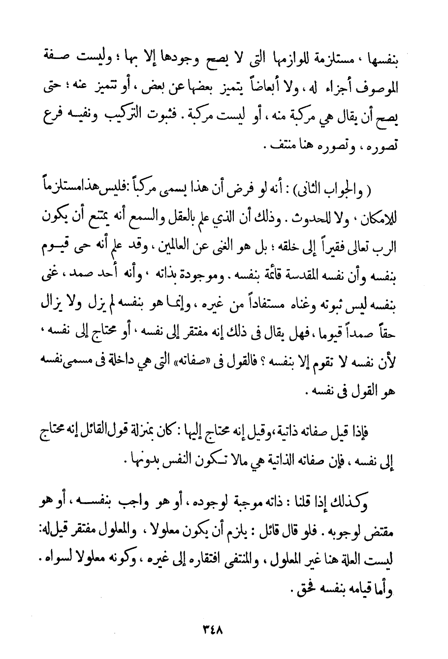 بِنَفْسِهَا مُسْتَلْزِمَةٌ لِلَوَازِمِهَا الَّتِي لَا يَصِحُّ وُجُودُهَا إلَّا بِهَا؛ وَلَيْسَتْ صِفَةُ الْمَوْصُوفِ أَجْزَاءً لَهُ وَلَا أَبْعَاضًا يَتَمَيَّزُ بَعْضُهَا عَنْ بَعْضٍ أَوْ تَتَمَيَّزُ عَنْهُ؛ حَتَّى يَصِحَّ أَنْ يُقَالَ هِيَ مُرَكَّبَةٌ مِنْهُ أَوْ لَيْسَتْ مُرَكَّبَةً. فَثُبُوتُ التَّرْكِيبِ وَنَفْيُهُ فَرْعُ تَصَوُّرِهِ وَتَصَوُّرُهُ هُنَا مُنْتَفٍ. وَالْجَوَابُ الثَّانِي: أَنَّهُ لَوْ فُرِضَ أَنَّ هَذَا يُسَمَّى مُرَكَّبًا: فَلَيْسَ هَذَا مُسْتَلْزِمًا لِلْإِمْكَانِ وَلَا لِلْحُدُوثِ. وَذَلِكَ أَنَّ الَّذِي عُلِمَ بِالْعَقْلِ وَالسَّمْعِ أَنَّهُ يَمْتَنِعُ أَنْ يَكُونَ الرَّبُّ تَعَالَى فَقِيرًا إلَى خَلْقِهِ؛ بَلْ هُوَ الْغَنِيُّ عَنْ الْعَالَمِينَ وَقَدْ عُلِمَ أَنَّهُ حَيٌّ قَيُّومٌ بِنَفْسِهِ وَأَنَّ نَفْسَهُ الْمُقَدَّسَةَ قَائِمَةٌ بِنَفْسِهِ وَمَوْجُودَةٌ بِذَاتِهِ وَأَنَّهُ أَحَدٌ صَمَدٌ غَنِيٌّ بِنَفْسِهِ لَيْسَ ثُبُوتُهُ وَغِنَاهُ مُسْتَفَادًا مِنْ غَيْرِهِ وَإِنَّمَا هُوَ بِنَفْسِهِ لَمْ يَزَلْ وَلَا يَزَالُ حَقًّا صَمَدًا قَيُّومًا فَهَلْ يُقَالُ فِي ذَلِكَ إنَّهُ مُفْتَقِرٌ إلَى نَفْسِهِ أَوْ مُحْتَاجٌ إلَى نَفْسِهِ لِأَنَّ نَفْسَهُ لَا تَقُومُ إلَّا بِنَفْسِهِ؟ فَالْقَوْلُ فِي " صِفَاتِهِ " الَّتِي هِيَ دَاخِلَةٌ فِي مُسَمَّى نَفْسِهِ هُوَ الْقَوْلُ فِي نَفْسِهِ. فَإِذَا قِيلَ صِفَاتُهُ ذَاتِيَّةٌ وَقِيلَ إنَّهُ مُحْتَاجٌ إلَيْهَا: كَانَ بِمَنْزِلَةِ قَوْلِ الْقَائِلِ إنَّهُ مُحْتَاجٌ إلَى نَفْسِهِ فَإِنَّ صِفَاتِهِ الذَّاتِيَّةَ هِيَ مَا لَا تَكُونُ النَّفْسُ بِدُونِهَا. وَكَذَلِكَ إذَا قُلْنَا: ذَاتُهُ مُوجِبَةٌ لِوُجُودِهِ أَوْ هُوَ وَاجِبٌ بِنَفْسِهِ أَوْ هُوَ مُقْتَضٍ لِوُجُوبِهِ. فَلَوْ قَالَ قَائِلٌ: يَلْزَمُ أَنْ يَكُونَ مَعْلُولًا وَالْمَعْلُولُ مُفْتَقِرٌ قِيلَ لَهُ: لَيْسَتْ الْعِلَّةُ هُنَا غَيْرَ الْمَعْلُولِ وَالْمُنْتَفِي افْتِقَارُهُ إلَى غَيْرِهِ وَكَوْنُهُ مَعْلُولًا لِسِوَاهُ. وَأَمَّا قِيَامُهُ بِنَفْسِهِ فَحَقٌّ.