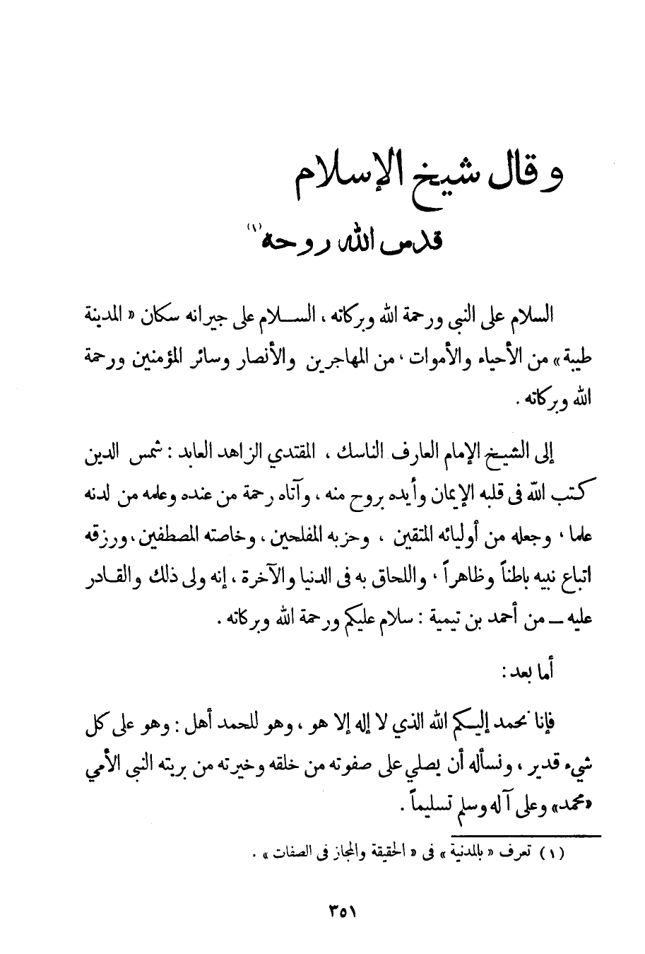 إلَى الشِّيحِ الْإِمَامِ الْعَارِفِ النَّاسِكِ الْمُقْتَدِي الزَّاهِدِ الْعَابِدِ: شَمْسِ الدِّينِ كَتَبَ اللَّهُ فِي قَلْبِهِ الْإِيمَانَ وَأَيَّدَهُ بِرُوحِ مِنْهُ وَآتَاهُ رَحْمَةً مِنْ عِنْدِهِ وَعَلَّمَهُ مِنْ لَدُنْهُ عِلْمًا وَجَعَلَهُ مِنْ أَوْلِيَائِهِ الْمُتَّقِينَ وَحِزْبِهِ الْمُفْلِحِينَ وَخَاصَّتِهِ الْمُصْطَفَيْنَ وَرَزَقَهُ اتِّبَاعَ نَبِيِّهِ بَاطِنًا وَظَاهِرًا وَاللَّحَاقَ بِهِ فِي الدُّنْيَا وَالْآخِرَةِ إنَّهُ وَلِيُّ ذَلِكَ وَالْقَادِرُ عَلَيْهِ - مِنْ أَحْمَد بْنِ تَيْمِيَّة: سَلَامٌ عَلَيْكُمْ وَرَحْمَةُ اللَّهِ وَبَرَكَاتُهُ. أَمَّا بَعْدُ: فَإِنَّا نَحْمَدُ إلَيْكُمْ اللَّهَ الَّذِي لَا إلَهَ إلَّا هُوَ وَهُوَ لِلْحَمْدِ أَهْلٌ: وَهُوَ عَلَى كُلِّ شَيْءٍ قَدِيرٌ وَنَسْأَلُهُ أَنْ يُصَلِّيَ عَلَى صَفْوَتِهِ مِنْ خَلْقِهِ وَخِيرَتِهِ مِنْ بَرِيَّتِهِ النَّبِيِّ الْأُمِّيِّ " مُحَمَّدٍ " وَعَلَى آلِهِ وَسَلَّمَ تَسْلِيمًا.