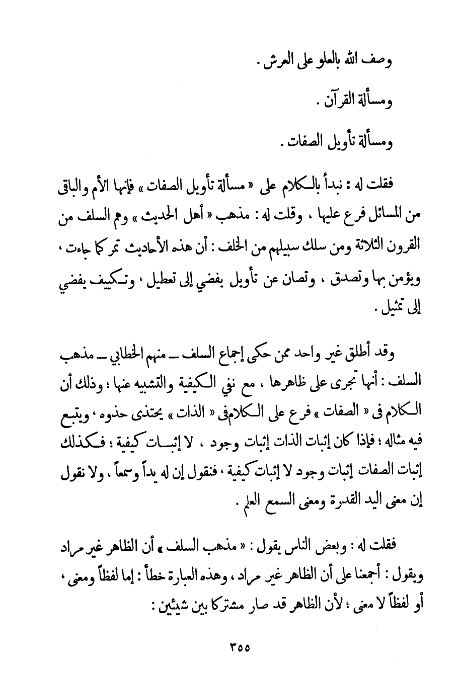 فَقُلْت لَهُ: نَبْدَأُ بِالْكَلَامِ عَلَى " مَسْأَلَةِ تَأْوِيلِ الصِّفَاتِ " فَإِنَّهَا الْأُمُّ وَالْبَاقِي مِنْ الْمَسَائِلِ فَرْعٌ عَلَيْهَا وَقُلْت لَهُ: مَذْهَبُ " أَهْلِ الْحَدِيثِ " وَهُمْ السَّلَفُ مِنْ الْقُرُونِ الثَّلَاثَةِ وَمَنْ سَلَكَ سَبِيلَهُمْ مِنْ الْخَلَفِ: أَنَّ هَذِهِ الْأَحَادِيثَ تُمَرُّ كَمَا جَاءَتْ وَيُؤْمَنُ بِهَا وَتُصَدَّقُ وَتُصَانُ عَنْ تَأْوِيلٍ يُفْضِي إلَى تَعْطِيلٍ وَتَكْيِيفٍ يُفْضِي إلَى تَمْثِيلٍ. وَقَدْ أَطْلَقَ غَيْرُ وَاحِدٍ مِمَّنْ حَكَى إجْمَاعَ السَّلَفِ - مِنْهُمْ الخطابي - مَذْهَبَ السَّلَفِ: أَنَّهَا تَجْرِي عَلَى ظَاهِرِهَا مَعَ نَفْيِ الْكَيْفِيَّةِ وَالتَّشْبِيهِ عَنْهَا؛ وَذَلِكَ أَنَّ الْكَلَامَ فِي " الصِّفَاتِ " فَرْعٌ عَلَى الْكَلَامِ فِي " الذَّاتِ " يُحْتَذَى حَذْوُهُ وَيُتَّبَعُ فِيهِ مِثَالُهُ؛ فَإِذَا كَانَ إثْبَاتُ الذَّاتِ إثْبَاتَ وُجُودٍ لَا إثْبَاتَ كَيْفِيَّةٍ؛ فَكَذَلِكَ إثْبَاتُ الصِّفَاتِ إثْبَاتُ وُجُودٍ لَا إثْبَاتُ كَيْفِيَّةٍ فَنَقُولُ إنَّ لَهُ يَدًا وَسَمْعًا وَلَا نَقُولُ إنَّ مَعْنَى الْيَدِ الْقُدْرَةُ وَمَعْنَى السَّمْعِ الْعِلْمُ. فَقُلْت لَهُ: وَبَعْضُ النَّاسِ يَقُولُ: " مَذْهَبُ السَّلَفِ " أَنَّ الظَّاهِرَ غَيْرُ مُرَادٍ وَيَقُولُ: أَجْمَعْنَا عَلَى أَنَّ الظَّاهِرَ غَيْرُ مُرَادٍ وَهَذِهِ الْعِبَارَةُ خَطَأٌ: إمَّا لَفْظًا وَمَعْنًى أَوْ لَفْظًا لَا مَعْنًى؛ لِأَنَّ الظَّاهِرَ قَدْ صَارَ مُشْتَرِكًا بَيْنَ شَيْئَيْنِ: