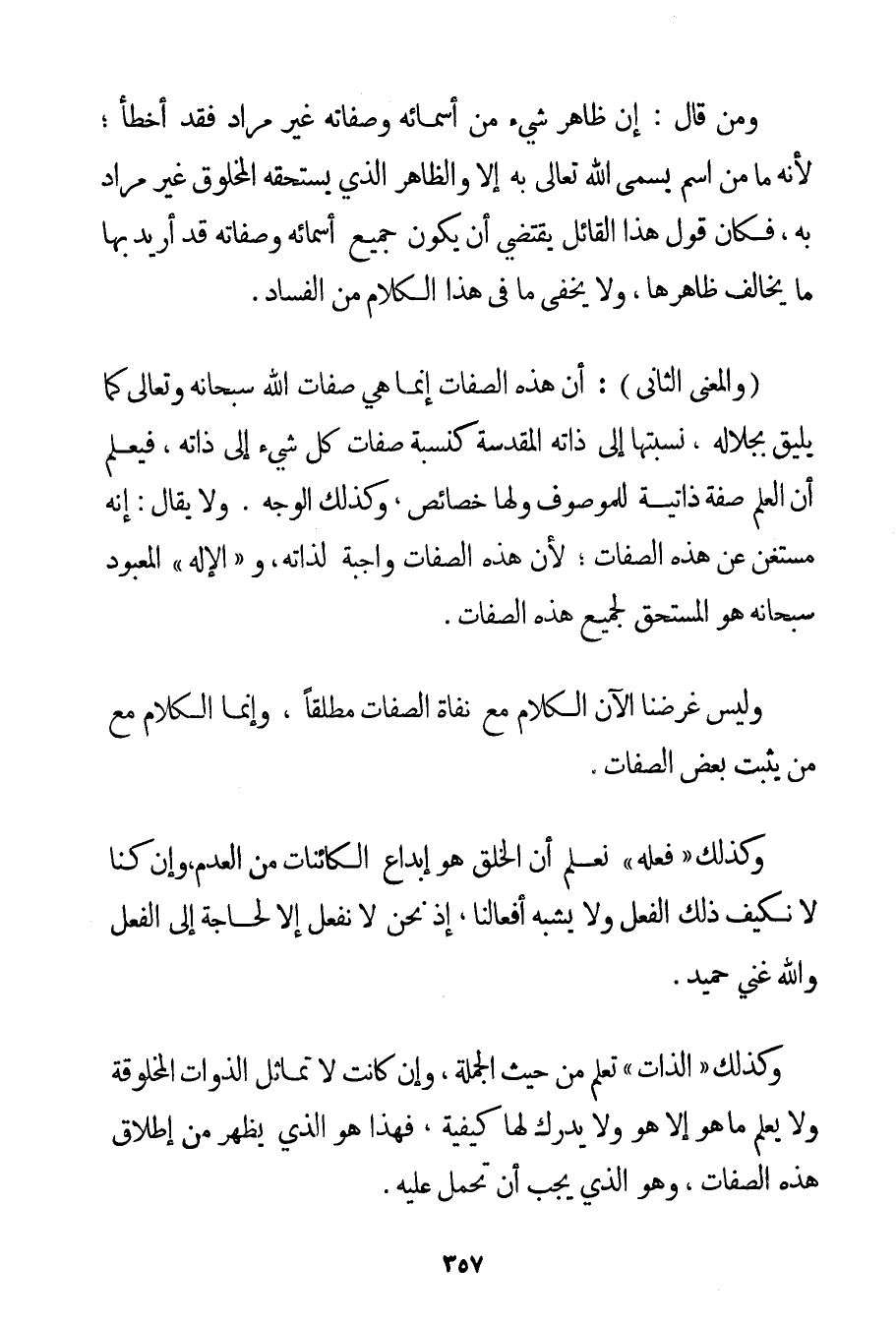 وَمَنْ قَالَ: إنَّ ظَاهَرَ شَيْءٍ مِنْ أَسْمَائِهِ وَصِفَاتِهِ غَيْرُ مُرَادٍ فَقَدْ أَخْطَأَ؛ لِأَنَّهُ مَا مِنْ اسْمٍ يُسَمَّى اللَّهُ تَعَالَى بِهِ إلَّا وَالظَّاهِرُ الَّذِي يَسْتَحِقُّهُ الْمَخْلُوقُ غَيْرُ مُرَادٍ بِهِ فَكَانَ قَوْلُ هَذَا الْقَائِلِ يَقْتَضِي أَنْ يَكُونَ جَمِيعُ أَسْمَائِهِ وَصِفَاتِهِ قَدْ أُرِيدَ بِهَا مَا يُخَالِفُ ظَاهِرَهَا وَلَا يَخْفَى مَا فِي هَذَا الْكَلَامِ مِنْ الْفَسَادِ. (وَالْمَعْنَى الثَّانِي: أَنَّ هَذِهِ الصِّفَاتِ إنَّمَا هِيَ صِفَاتُ اللَّهِ سُبْحَانَهُ وَتَعَالَى كَمَا يَلِيقُ بِجَلَالِهِ نِسْبَتُهَا إلَى ذَاتِهِ الْمُقَدَّسَةِ كَنِسْبَةِ صِفَاتِ كُلِّ شَيْءٍ إلَى ذَاتِهِ فَيُعْلَمُ أَنَّ الْعِلْمَ صِفَةٌ ذَاتِيَّةٌ لِلْمَوْصُوفِ وَلَهَا خَصَائِصُ وَكَذَلِكَ الْوَجْهُ. وَلَا يُقَالُ: إنَّهُ مُسْتَغْنٍ عَنْ هَذِهِ الصِّفَاتِ؛ لِأَنَّ هَذِهِ الصِّفَاتِ وَاجِبَةٌ لِذَاتِهِ وَ " الْإِلَهُ " الْمَعْبُودُ سُبْحَانَهُ هُوَ الْمُسْتَحِقُّ لِجَمِيعِ هَذِهِ الصِّفَاتِ. وَلَيْسَ غَرَضُنَا الْآنَ الْكَلَامَ مَعَ نفاة الصِّفَاتِ مُطْلَقًا وَإِنَّمَا الْكَلَامُ مَعَ مَنْ يُثْبِتُ بَعْضَ الصِّفَاتِ. وَكَذَلِكَ " فِعْلُهُ " نَعْلَمُ أَنَّ الْخَلْقَ هُوَ إبْدَاعُ الْكَائِنَاتِ مِنْ الْعَدَمِ وَإِنْ كُنَّا لَا نُكَيِّفُ ذَلِكَ الْفِعْلَ وَلَا يُشْبِهُ أَفْعَالَنَا إذْ نَحْنُ لَا نَفْعَلُ إلَّا لِحَاجَةِ إلَى الْفِعْلِ وَاَللَّهُ غَنِيٌّ حَمِيدٌ. وَكَذَلِكَ " الذَّاتُ " تُعْلَمُ مِنْ حَيْثُ الْجُمْلَةِ وَإِنْ كَانَتْ لَا تُمَاثِلُ الذَّوَاتَ الْمَخْلُوقَةَ وَلَا يَعْلَمُ مَا هُوَ إلَّا هُوَ وَلَا يُدْرِكُ لَهَا كَيْفِيَّةً فَهَذَا هُوَ الَّذِي يَظْهَرُ مِنْ إطْلَاقِ هَذِهِ الصِّفَاتِ وَهُوَ الَّذِي يَجِبُ أَنْ تُحْمَلَ عَلَيْهِ.