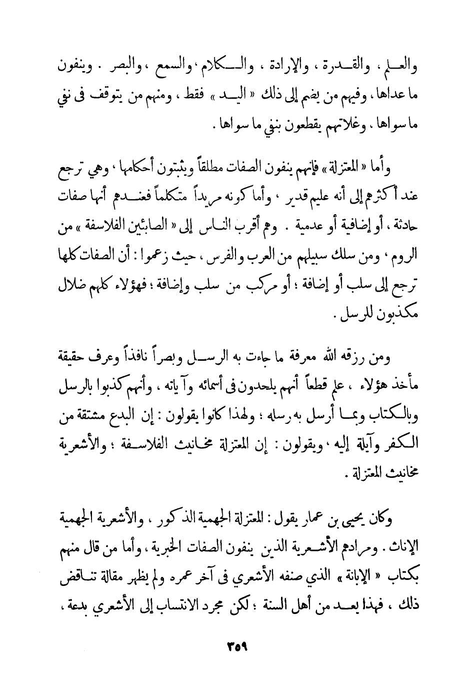 وَالْعِلْمَ وَالْقُدْرَةَ وَالْإِرَادَةَ وَالْكَلَامَ وَالسَّمْعَ وَالْبَصَرَ. وَيَنْفُونَ مَا عَدَاهَا وَفِيهِمْ مَنْ يَضُمُّ إلَى ذَلِكَ " الْيَدَ " فَقَطْ وَمِنْهُمْ مَنْ يَتَوَقَّفُ فِي نَفْيِ مَا سِوَاهَا وَغُلَاتُهُمْ يَقْطَعُونَ بِنَفْيِ مَا سِوَاهَا. وَأَمَّا " الْمُعْتَزِلَةُ " فَإِنَّهُمْ يَنْفُونَ الصِّفَاتِ مُطْلَقًا وَيُثْبِتُونَ أَحْكَامَهَا وَهِيَ تَرْجِعُ عِنْدَ أَكْثَرِهِمْ إلَى أَنَّهُ عَلِيمٌ قَدِيرٌ وَأَمَّا كَوْنُهُ مُرِيدًا مُتَكَلِّمًا فَعِنْدَهُمْ أَنَّهَا صِفَاتٌ حَادِثَةٌ أَوْ إضَافِيَّةٌ أَوْ عَدَمِيَّةٌ. وَهُمْ أَقْرَبُ النَّاسِ إلَى " الصَّابِئِينَ الْفَلَاسِفَةِ " مِنْ الرُّومِ وَمَنْ سَلَكَ سَبِيلَهُمْ مِنْ الْعَرَبِ وَالْفُرْسِ حَيْثُ زَعَمُوا: أَنَّ الصِّفَاتِ كُلَّهَا تَرْجِعُ إلَى سَلْبٍ أَوْ إضَافَةٍ؛ أَوْ مُرَكَّبٍ مِنْ سَلْبٍ وَإِضَافَةٍ؛ فَهَؤُلَاءِ كُلُّهُمْ ضُلَّالٌ مُكَذِّبُونَ لِلرُّسُلِ. وَمَنْ رَزَقَهُ اللَّهُ مَعْرِفَةَ مَا جَاءَتْ بِهِ الرُّسُلُ وَبَصَرًا نَافِذًا وَعَرَفَ حَقِيقَةَ مَأْخَذِ هَؤُلَاءِ عَلِمَ قَطْعًا أَنَّهُمْ يُلْحِدُونَ فِي أَسْمَائِهِ وَآيَاتِهِ وَأَنَّهُمْ كَذَّبُوا بِالرُّسُلِ وَبِالْكِتَابِ وَبِمَا أُرْسِلَ بِهِ رُسُلُهُ؛ وَلِهَذَا كَانُوا يَقُولُونَ: إنَّ الْبِدَعَ مُشْتَقَّةٌ مِنْ الْكُفْرِ وَآيِلَةٌ إلَيْهِ وَيَقُولُونَ: إنَّ الْمُعْتَزِلَةَ مَخَانِيثُ الْفَلَاسِفَةِ؛ وَالْأَشْعَرِيَّةُ مَخَانِيثُ الْمُعْتَزِلَةِ. وَكَانَ يَحْيَى بْنُ عَمَّارٍ يَقُولُ: الْمُعْتَزِلَةُ الْجَهْمِيَّة الذُّكُورُ وَالْأَشْعَرِيَّةُ الْجَهْمِيَّة الْإِنَاثُ. وَمُرَادُهُمْ الْأَشْعَرِيَّةُ الَّذِينَ يَنْفُونَ الصِّفَاتِ الْخَبَرِيَّةَ وَأَمَّا مَنْ قَالَ مِنْهُمْ بِكِتَابِ " الْإِبَانَةِ " الَّذِي صَنَّفَهُ الْأَشْعَرِيُّ فِي آخِرِ عُمْرِهِ وَلَمْ يُظْهِرْ مَقَالَةً تُنَاقِضُ ذَلِكَ فَهَذَا يُعَدُّ مِنْ أَهْلِ السُّنَّةِ؛ لَكِنَّ مُجَرَّدَ الِانْتِسَابِ إلَى الْأَشْعَرِيِّ بِدْعَةٌ