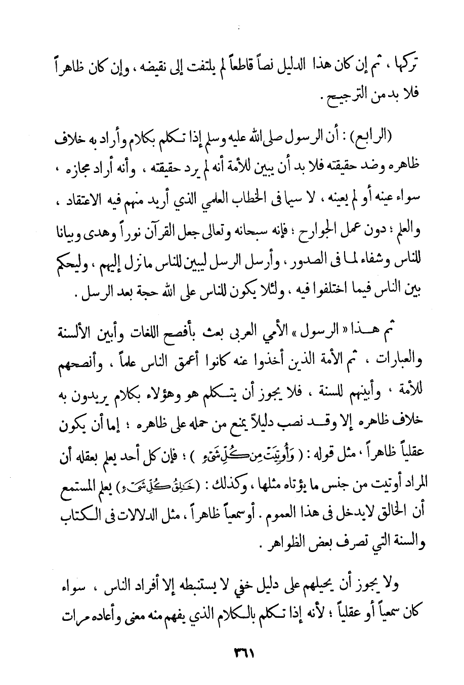 تَرْكُهَا ثُمَّ إنْ كَانَ هَذَا الدَّلِيلُ نَصًّا قَاطِعًا لَمْ يُلْتَفَتْ إلَى نَقِيضِهِ وَإِنْ كَانَ ظَاهِرًا فَلَا بُدَّ مِنْ التَّرْجِيحِ. (الرَّابِعُ: أَنَّ الرَّسُولَ صَلَّى اللَّهُ عَلَيْهِ وَسَلَّمَ إذَا تَكَلَّمَ بِكَلَامِ وَأَرَادَ بِهِ خِلَافَ ظَاهِرِهِ وَضِدَّ حَقِيقَتِهِ فَلَا بُدَّ أَنْ يُبَيِّنَ لِلْأُمَّةِ أَنَّهُ لَمْ يُرِدْ حَقِيقَتَهُ وَأَنَّهُ أَرَادَ مَجَازَهُ سَوَاءٌ عَيَّنَهُ أَوْ لَمْ يُعَيِّنْهُ لَا سِيَّمَا فِي الْخِطَابِ الْعِلْمِيِّ الَّذِي أُرِيدَ مِنْهُمْ فِيهِ الِاعْتِقَادُ وَالْعِلْمُ؛ دُونَ عَمَلِ الْجَوَارِحِ؛ فَإِنَّهُ سُبْحَانَهُ وَتَعَالَى جَعَلَ الْقُرْآنَ نُورًا وَهُدًى وَبَيَانًا لِلنَّاسِ وَشِفَاءً لِمَا فِي الصُّدُورِ وَأَرْسَلَ الرُّسُلَ لِيُبَيِّنَ لِلنَّاسِ مَا نَزَّلَ إلَيْهِمْ وَلِيَحْكُمَ بَيْنَ النَّاسِ فِيمَا اخْتَلَفُوا فِيهِ وَلِئَلَّا يَكُونَ لِلنَّاسِ عَلَى اللَّهِ حُجَّةٌ بَعْدَ الرُّسُلِ. ثُمَّ هَذَا " الرَّسُولُ " الْأُمِّيُّ الْعَرَبِيُّ بُعِثَ بِأَفْصَحِ اللُّغَاتِ وَأَبْيَنِ الْأَلْسِنَةِ وَالْعِبَارَاتِ ثُمَّ الْأُمَّةُ الَّذِينَ أَخَذُوا عَنْهُ كَانُوا أَعْمَقَ النَّاسِ عِلْمًا وَأَنْصَحَهُمْ لِلْأُمَّةِ وَأَبْيَنَهُمْ لِلسُّنَّةِ فَلَا يَجُوزُ أَنْ يَتَكَلَّمَ هُوَ وَهَؤُلَاءِ بِكَلَامِ يُرِيدُونَ بِهِ خِلَافَ ظَاهِرِهِ إلَّا وَقَدْ نُصِبَ دَلِيلًا يَمْنَعُ مِنْ حَمْلِهِ عَلَى ظَاهِرِهِ؛ إمَّا أَنْ يَكُونَ عَقْلِيًّا ظَاهِرًا مِثْلُ قَوْلِهِ: {وَأُوتِيَتْ مِنْ كُلِّ شَيْءٍ} فَإِنَّ كُلَّ أَحَدٍ يَعْلَمُ بِعَقْلِهِ أَنَّ الْمُرَادَ أُوتِيَتْ مِنْ جِنْسِ مَا يُؤْتَاهُ مِثْلُهَا وَكَذَلِكَ: {خَالِقُ كُلِّ شَيْءٍ} يَعْلَمُ الْمُسْتَمِعُ أَنَّ الْخَالِقَ لَا يَدْخُلُ فِي هَذَا الْعُمُومِ. أَوْ سَمْعِيًّا ظَاهِرًا مِثْلُ الدَّلَالَاتِ فِي الْكِتَابِ وَالسُّنَّةِ الَّتِي تَصْرِفُ بَعْضَ الظَّوَاهِرِ. وَلَا يَجُوزُ أَنْ يُحِيلَهُمْ عَلَى دَلِيلٍ خَفِيٍّ لَا يَسْتَنْبِطُهُ إلَّا أَفْرَادُ النَّاسِ سَوَاءٌ كَانَ سَمْعِيًّا أَوْ عَقْلِيًّا؛ لِأَنَّهُ إذَا تَكَلَّمَ بِالْكَلَامِ الَّذِي يُفْهَمُ مِنْهُ مَعْنًى وَأَعَادَهُ مَرَّاتٍ