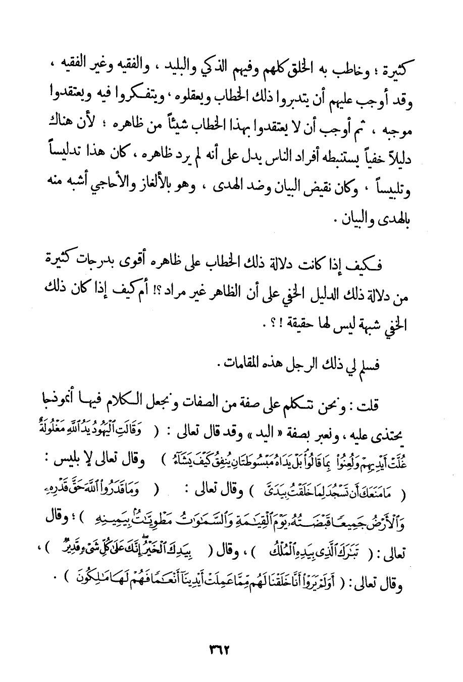 كَثِيرَةً؛ وَخَاطَبَ بِهِ الْخَلْقَ كُلَّهُمْ وَفِيهِمْ الذَّكِيُّ وَالْبَلِيدُ وَالْفَقِيهُ وَغَيْرُ الْفَقِيهِ وَقَدْ أَوْجَبَ عَلَيْهِمْ أَنْ يَتَدَبَّرُوا ذَلِكَ الْخِطَابَ وَيَعْقِلُوهُ وَيَتَفَكَّرُوا فِيهِ وَيَعْتَقِدُوا مُوجَبَهُ ثُمَّ أَوْجَبَ أَنْ لَا يَعْتَقِدُوا بِهَذَا الْخِطَابِ شَيْئًا مِنْ ظَاهِرِهِ؛ لِأَنَّ هُنَاكَ دَلِيلًا خَفِيًّا يَسْتَنْبِطُهُ أَفْرَادُ النَّاسِ يَدُلُّ عَلَى أَنَّهُ لَمْ يُرِدْ ظَاهِرَهُ كَانَ هَذَا تَدْلِيسًا وَتَلْبِيسًا وَكَانَ نَقِيضَ الْبَيَانِ وَضِدَّ الْهُدَى وَهُوَ بِالْأَلْغَازِ وَالْأَحَاجِيِّ أَشْبَهُ مِنْهُ بِالْهُدَى وَالْبَيَانِ. فَكَيْفَ إذَا كَانَتْ دَلَالَةُ ذَلِكَ الْخِطَابِ عَلَى ظَاهِرِهِ أَقْوَى بِدَرَجَاتِ كَثِيرَةٍ مِنْ دَلَالَةِ ذَلِكَ الدَّلِيلِ الْخَفِيِّ عَلَى أَنَّ الظَّاهِرَ غَيْرُ مُرَادٍ أَمْ كَيْفَ إذَا كَانَ ذَلِكَ الْخَفِيُّ شُبْهَةً لَيْسَ لَهَا حَقِيقَةٌ؟ . فَسَلَّمَ لِي ذَلِكَ الرَّجُلُ هَذِهِ الْمَقَامَاتِ.