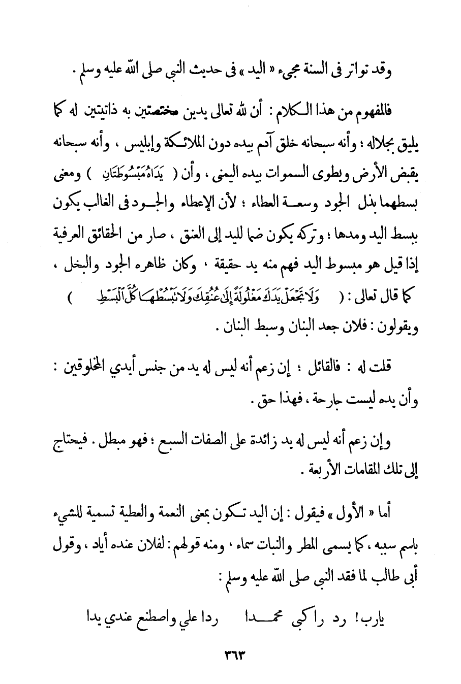 وَقَدْ تَوَاتَرَ فِي السُّنَّةِ مَجِيءُ " الْيَدِ " فِي حَدِيثِ النَّبِيِّ صَلَّى اللَّهُ عَلَيْهِ وَسَلَّمَ. فَالْمَفْهُومُ مِنْ هَذَا الْكَلَامِ: أَنَّ لِلَّهِ تَعَالَى يَدَيْنِ مُخْتَصَّتَيْنِ بِهِ ذَاتِيَّتَيْنِ لَهُ كَمَا يَلِيقُ بِجَلَالِهِ؛ وَأَنَّهُ سُبْحَانَهُ خَلَقَ آدَمَ بِيَدِهِ دُونَ الْمَلَائِكَةِ وَإِبْلِيسَ وَأَنَّهُ سُبْحَانَهُ يَقْبِضُ الْأَرْضَ وَيَطْوِي السَّمَوَاتِ بِيَدِهِ الْيُمْنَى وَأَنَّ {يَدَاهُ مَبْسُوطَتَانِ} وَمَعْنَى بَسْطِهِمَا بَذْلُ الْجُودِ وَسَعَةُ الْعَطَاءِ؛ لِأَنَّ الْإِعْطَاءَ وَالْجُودَ فِي الْغَالِبِ يَكُونُ بِبَسْطِ الْيَدِ وَمَدِّهَا؛ وَتَرْكُهُ يَكُونُ ضَمًّا لِلْيَدِ إلَى الْعُنُقِ صَارَ مِنْ الْحَقَائِقِ الْعُرْفِيَّةِ إذَا قِيلَ هُوَ مَبْسُوطُ الْيَدِ فُهِمَ مِنْهُ يَدٌ حَقِيقَةً وَكَانَ ظَاهِرُهُ الْجُودَ وَالْبُخْلَ كَمَا قَالَ تَعَالَى: {وَلَا تَجْعَلْ يَدَكَ مَغْلُولَةً إلَى عُنُقِكَ وَلَا تَبْسُطْهَا كُلَّ الْبَسْطِ} وَيَقُولُونَ: فُلَانٌ جَعْدُ الْبَنَانِ وَسَبْطُ الْبَنَانِ. قُلْت لَهُ: فَالْقَائِلُ؛ إنْ زَعَمَ أَنَّهُ لَيْسَ لَهُ يَدٌ مِنْ جِنْسِ أَيْدِي الْمَخْلُوقِينَ: وَأَنَّ يَدَهُ لَيْسَتْ جَارِحَةً فَهَذَا حَقٌّ. وَإِنْ زَعَمَ أَنَّهُ لَيْسَ لَهُ يَدٌ زَائِدَةٌ عَلَى الصِّفَاتِ السَّبْعِ؛ فَهُوَ مُبْطِلٌ. فَيَحْتَاجُ إلَى تِلْكَ الْمَقَامَاتِ الْأَرْبَعَةِ. أَمَّا " الْأَوَّلُ " فَيَقُولُ: إنَّ الْيَدَ تَكُونُ بِمَعْنَى النِّعْمَةِ وَالْعَطِيَّةِ تَسْمِيَةً لِلشَّيْءِ بِاسْمِ سَبَبِهِ كَمَا يُسَمَّى الْمَطَرُ وَالنَّبَاتُ سَمَاءً وَمِنْهُ قَوْلُهُمْ: لِفُلَانِ عِنْدَهُ أَيَادٍ وَقَوْلُ أَبِي طَالِبٍ لَمَّا فَقَدَ النَّبِيَّ صَلَّى اللَّهُ عَلَيْهِ وَسَلَّمَ: