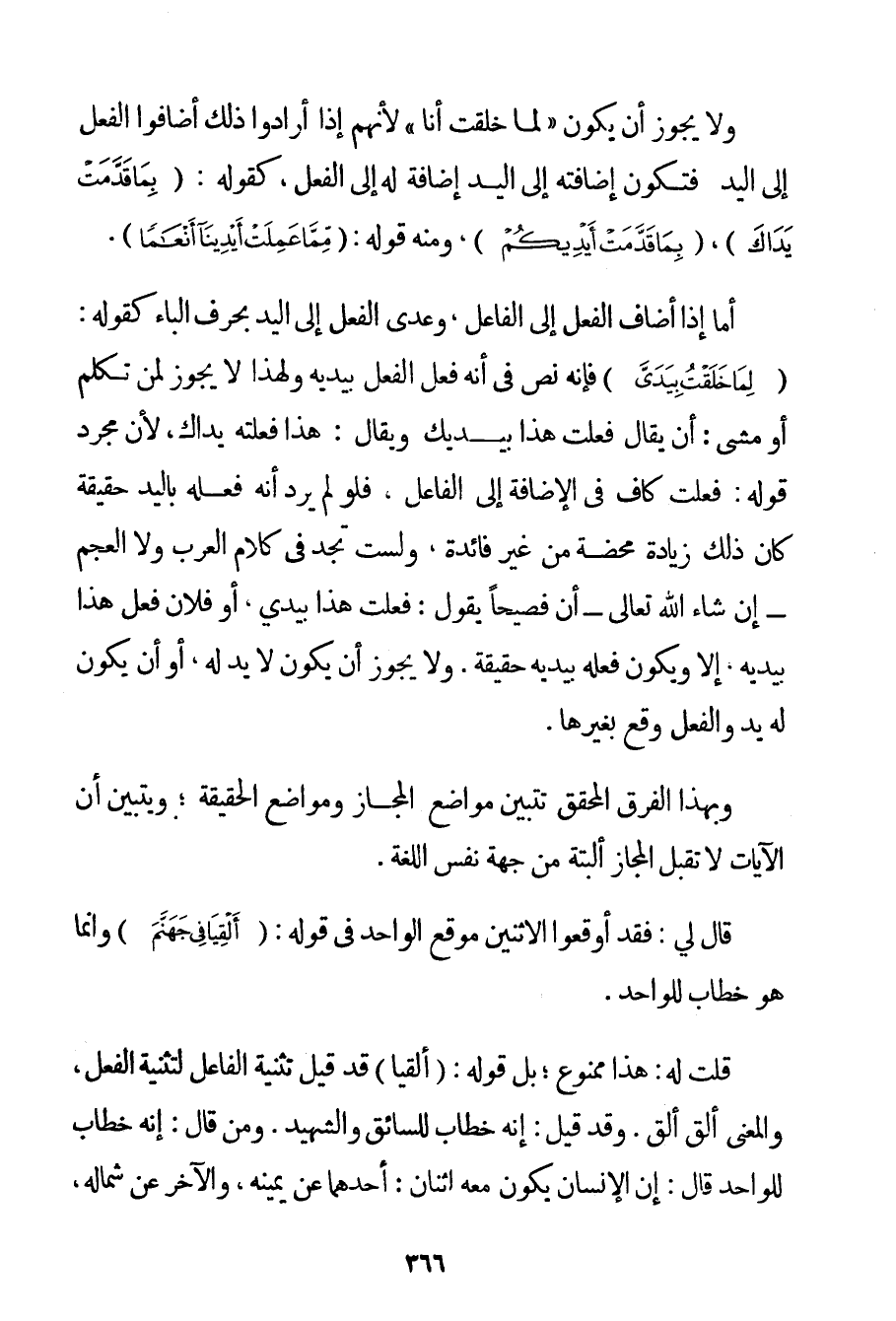 وَلَا يَجُوزُ أَنْ يَكُونَ " لِمَا خَلَقْت أَنَا " لِأَنَّهُمْ إذَا أَرَادُوا ذَلِكَ أَضَافُوا الْفِعْلَ إلَى الْيَدِ فَتَكُونُ إضَافَتُهُ إلَى الْيَدِ إضَافَةً لَهُ إلَى الْفِعْلِ كَقَوْلِهِ: {بِمَا قَدَّمَتْ يَدَاكَ} {بِمَا قَدَّمَتْ أَيْدِيكُمْ} وَمِنْهُ قَوْلُهُ: {مِمَّا عَمِلَتْ أَيْدِينَا أَنْعَامًا} . أَمَّا إذَا أَضَافَ الْفِعْلَ إلَى الْفَاعِلِ وَعَدَّى الْفِعْلَ إلَى الْيَدِ بِحَرْفِ الْبَاءِ كَقَوْلِهِ: {لِمَا خَلَقْتُ بِيَدَيَّ} فَإِنَّهُ نَصٌّ فِي أَنَّهُ فَعَلَ الْفِعْلَ بِيَدَيْهِ وَلِهَذَا لَا يَجُوزُ لِمَنْ تَكَلَّمَ أَوْ مَشَى: أَنْ يُقَالَ فَعَلْت هَذَا بِيَدَيْك وَيُقَالُ: هَذَا فَعَلَتْهُ يَدَاك لِأَنَّ مُجَرَّدَ قَوْلِهِ: فَعَلْت كَافٍ فِي الْإِضَافَةِ إلَى الْفَاعِلِ فَلَوْ لَمْ يُرِدْ أَنَّهُ فَعَلَهُ بِالْيَدِ حَقِيقَةً كَانَ ذَلِكَ زِيَادَةً مَحْضَةً مِنْ غَيْرِ فَائِدَةٍ وَلَسْت تَجِدُ فِي كَلَامِ الْعَرَبِ وَلَا الْعَجَمِ - إنْ شَاءَ اللَّهُ تَعَالَى - أَنَّ فَصِيحًا يَقُولُ: فَعَلْت هَذَا بِيَدَيَّ أَوْ فُلَانٌ فَعَلَ هَذَا بِيَدَيْهِ إلَّا وَيَكُونُ فَعَلَهُ بِيَدَيْهِ حَقِيقَةً. وَلَا يَجُوزُ أَنْ يَكُونَ لَا يَدَ لَهُ أَوْ أَنْ يَكُونَ لَهُ يَدٌ وَالْفِعْلُ وَقَعَ بِغَيْرِهَا. وَبِهَذَا الْفَرْقِ الْمُحَقَّقِ تَتَبَيَّنُ مَوَاضِعُ الْمَجَازِ وَمَوَاضِعُ الْحَقِيقَةِ؛ وَيَتَبَيَّنُ أَنَّ الْآيَاتِ لَا تَقْبَلُ الْمَجَازَ أَلْبَتَّةَ مِنْ جِهَةِ نَفْسِ اللُّغَةِ. قَالَ لِي: فَقَدْ أَوْقَعُوا الِاثْنَيْنِ مَوْقِعَ الْوَاحِدِ فِي قَوْلِهِ: {أَلْقِيَا فِي جَهَنَّمَ} وَإِنَّمَا هُوَ خِطَابٌ لِلْوَاحِدِ. قُلْت لَهُ: هَذَا مَمْنُوعٌ؛ بَلْ قَوْلُهُ: {أَلْقِيَا} قَدْ قِيلَ تَثْنِيَةُ الْفَاعِلِ لِتَثْنِيَةِ الْفِعْلِ وَالْمَعْنَى أَلْقِ أَلْقِ. وَقَدْ قِيلَ: إنَّهُ خِطَابٌ لِلسَّائِقِ وَالشَّهِيدِ. وَمَنْ قَالَ: إنَّهُ خِطَابٌ لِلْوَاحِدِ قَالَ: إنَّ الْإِنْسَانَ يَكُونُ مَعَهُ اثْنَانِ: أَحَدُهُمَا عَنْ يَمِينِهِ وَالْآخَرُ عَنْ شِمَالِهِ