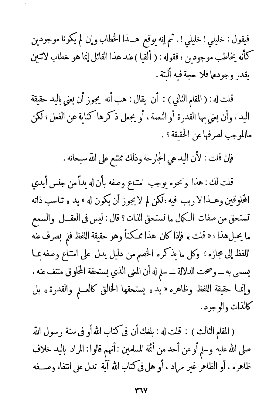 فَيَقُولُ: خَلِيلَيَّ خَلِيلَيَّ ثُمَّ إنَّهُ يُوقِعُ هَذَا الْخِطَابَ وَإِنْ لَمْ يَكُونَا مَوْجُودَيْنِ كَأَنَّهُ يُخَاطِبُ مَوْجُودَيْنِ؛ فَقَوْلُهُ: {أَلْقِيَا} عِنْدَ هَذَا الْقَائِلِ إنَّمَا هُوَ خِطَابٌ لِاثْنَيْنِ يُقَدَّرُ وُجُودُهُمَا فَلَا حُجَّةَ فِيهِ أَلْبَتَّةَ. قُلْت لَهُ: (الْمَقَامُ الثَّانِي: أَنْ يُقَالَ: هَبْ أَنَّهُ يَجُوزُ أَنْ يَعْنِيَ بِالْيَدِ حَقِيقَةَ الْيَدِ وَأَنْ يَعْنِيَ بِهَا الْقُدْرَةَ أَوْ النِّعْمَةَ أَوْ يَجْعَلَ ذِكْرَهَا كِنَايَةً عَنْ الْفِعْلِ؛ لَكِنْ مَا الْمُوجِبُ لِصَرْفِهَا عَنْ الْحَقِيقَةِ؟ . فَإِنْ قُلْت: لِأَنَّ الْيَدَ هِيَ الْجَارِحَةُ وَذَلِكَ مُمْتَنِعٌ عَلَى اللَّهِ سُبْحَانَهُ. قُلْت لَك: هَذَا وَنَحْوُهُ يُوجِبُ امْتِنَاعَ وَصْفِهِ بِأَنَّ لَهُ يَدًا مِنْ جِنْسِ أَيْدِي الْمَخْلُوقِينَ وَهَذَا لَا رَيْبَ فِيهِ؛ لَكِنْ لِمَ لَا يَجُوزُ أَنْ يَكُونَ لَهُ " يَدٌ " تُنَاسِبُ ذَاتَهُ تَسْتَحِقُّ مِنْ صِفَاتِ الْكَمَالِ مَا تَسْتَحِقُّ الذَّاتُ؟ قَالَ: لَيْسَ فِي الْعَقْلِ وَالسَّمْعِ مَا يُحِيلُ هَذَا؛ " قُلْت " فَإِذَا كَانَ هَذَا مُمْكِنًا وَهُوَ حَقِيقَةُ اللَّفْظِ فَلِمَ يُصْرَفُ عَنْهُ اللَّفْظُ إلَى مَجَازِهِ؟ وَكُلُّ مَا يَذْكُرُهُ الْخَصْمُ مِنْ دَلِيلٍ يَدُلُّ عَلَى امْتِنَاعِ وَصْفِهِ بِمَا يُسَمَّى بِهِ - وَصَحَّتْ الدَّلَالَةُ - سُلِّمَ لَهُ أَنَّ الْمَعْنَى الَّذِي يَسْتَحِقُّهُ الْمَخْلُوقُ مُنْتَفٍ عَنْهُ وَإِنَّمَا حَقِيقَةُ اللَّفْظِ وَظَاهِرُهُ " يَدٌ " يَسْتَحِقُّهَا الْخَالِقُ كَالْعِلْمِ وَالْقُدْرَةِ بَلْ كَالذَّاتِ وَالْوُجُودِ. (الْمَقَامُ الثَّالِثُ: قُلْت لَهُ: بَلَغَك أَنَّ فِي كِتَابِ اللَّهِ أَوْ فِي سُنَّةِ رَسُولِ اللَّهِ صَلَّى اللَّهُ عَلَيْهِ وَسَلَّمَ أَوْ عَنْ أَحَدٍ مِنْ أَئِمَّةِ الْمُسْلِمِينَ: أَنَّهُمْ قَالُوا: الْمُرَادُ بِالْيَدِ خِلَافُ ظَاهِرِهِ أَوْ الظَّاهِرُ غَيْرُ مُرَادٍ أَوْ هَلْ فِي كِتَابِ اللَّهِ آيَةٌ تَدُلُّ عَلَى انْتِفَاءِ وَصْفِهِ