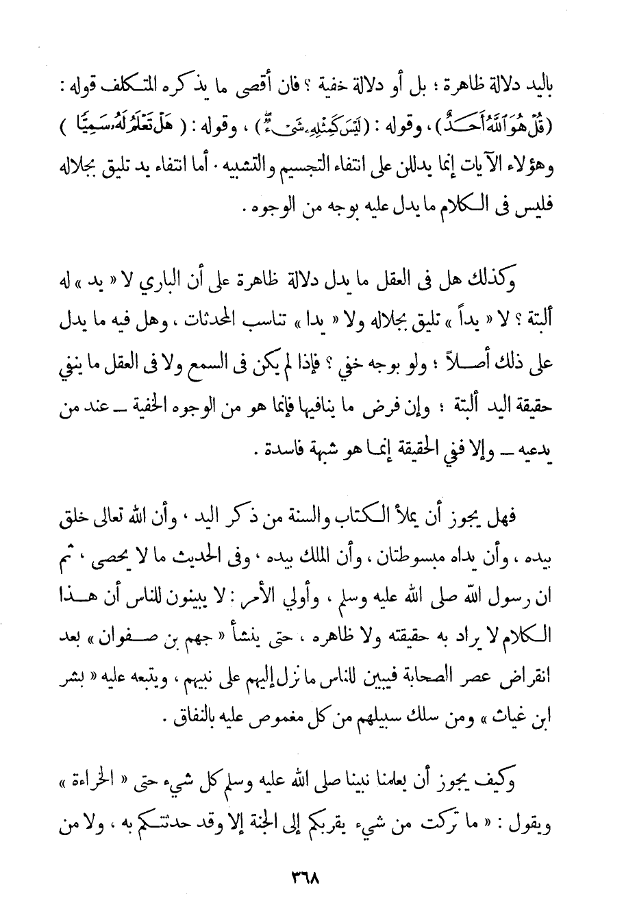 بِالْيَدِ دَلَالَةً ظَاهِرَةً؛ بَلْ أَوْ دَلَالَةً خَفِيَّةً؟ فَإِنَّ أَقْصَى مَا يَذْكُرُهُ الْمُتَكَلِّفُ قَوْلُهُ: {قُلْ هُوَ اللَّهُ أَحَدٌ} وَقَوْلُهُ: {لَيْسَ كَمِثْلِهِ شَيْءٌ} وَقَوْلُهُ: {هَلْ تَعْلَمُ لَهُ سَمِيًّا} وَهَؤُلَاءِ الْآيَاتُ إنَّمَا يَدْلُلْنَ عَلَى انْتِفَاءِ التَّجْسِيمِ وَالتَّشْبِيهِ. أَمَّا انْتِفَاءُ يَدٍ تَلِيقُ بِجَلَالِهِ فَلَيْسَ فِي الْكَلَامِ مَا يَدُلُّ عَلَيْهِ بِوَجْهِ مِنْ الْوُجُوهِ. وَكَذَلِكَ هَلْ فِي الْعَقْلِ مَا يَدُلُّ دَلَالَةً ظَاهِرَةً عَلَى أَنَّ الْبَارِيَ لَا " يَدَ " لَهُ أَلْبَتَّةَ؟ لَا " يَدًا " تَلِيقُ بِجَلَالِهِ وَلَا " يَدًا " تُنَاسِبُ الْمُحْدَثَاتِ وَهَلْ فِيهِ مَا يَدُلُّ عَلَى ذَلِكَ أَصْلًا؛ وَلَوْ بِوَجْهِ خَفِيٍّ؟ فَإِذَا لَمْ يَكُنْ فِي السَّمْعِ وَلَا فِي الْعَقْلِ مَا يَنْفِي حَقِيقَةَ الْيَدِ أَلْبَتَّةَ؛ وَإِنْ فُرِضَ مَا يُنَافِيهَا فَإِنَّمَا هُوَ مِنْ الْوُجُوهِ الْخَفِيَّةِ - عِنْدَ مَنْ يَدَّعِيهِ - وَإِلَّا فَفِي الْحَقِيقَةِ إنَّمَا هُوَ شُبْهَةٌ فَاسِدَةٌ. فَهَلْ يَجُوزُ أَنْ يُمْلَأَ الْكِتَابُ وَالسُّنَّةُ مِنْ ذِكْرِ الْيَدِ وَأَنَّ اللَّهَ تَعَالَى خَلَقَ بِيَدِهِ وَأَنَّ {يَدَاهُ مَبْسُوطَتَانِ} وَأَنَّ الْمُلْكَ بِيَدِهِ وَفِي الْحَدِيثِ مَا لَا يُحْصَى ثُمَّ إنَّ رَسُولَ اللَّهِ صَلَّى اللَّهُ عَلَيْهِ وَسَلَّمَ وَأُولِي الْأَمْرِ: لَا يُبَيِّنُونَ لِلنَّاسِ أَنَّ هَذَا الْكَلَامَ لَا يُرَادُ بِهِ حَقِيقَتُهُ وَلَا ظَاهِرُهُ حَتَّى يَنْشَأَ " جَهْمُ بْنُ صَفْوَانَ " بَعْدَ انْقِرَاضِ عَصْرِ الصَّحَابَةِ فَيُبَيِّنَ لِلنَّاسِ مَا نُزِّلَ إلَيْهِمْ عَلَى نَبِيِّهِمْ وَيَتْبَعَهُ عَلَيْهِ " بِشْرُ بْنُ غِيَاثٍ " وَمَنْ سَلَكَ سَبِيلَهُمْ مِنْ كُلِّ مَغْمُوصٍ عَلَيْهِ بِالنِّفَاقِ. وَكَيْفَ يَجُوزُ أَنْ يُعَلِّمَنَا نَبِيُّنَا صَلَّى اللَّهُ عَلَيْهِ وَسَلَّمَ كُلَّ شَيْءٍ حَتَّى " الْخِرَاءَةَ " وَيَقُولَ: {مَا تَرَكْت مِنْ شَيْءٍ يُقَرِّبُكُمْ إلَى الْجَنَّةِ إلَّا وَقَدْ حَدَّثْتُكُمْ بِهِ وَلَا مِنْ