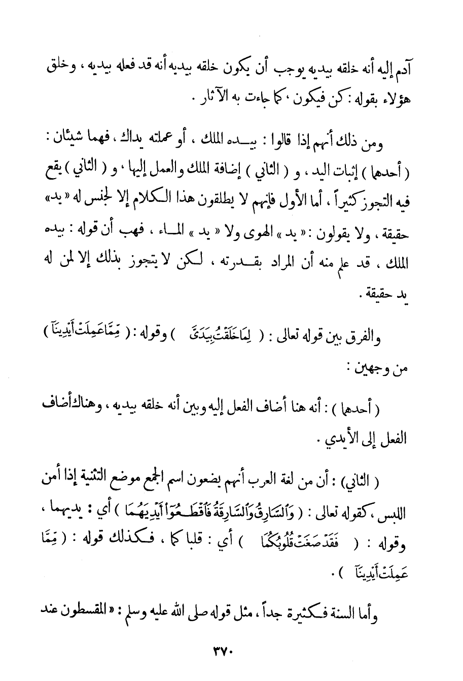 آدَمَ إلَيْهِ أَنَّهُ خَلَقَهُ بِيَدَيْهِ يُوجِبُ أَنْ يَكُونَ خَلَقَهُ بِيَدَيْهِ أَنَّهُ قَدْ فَعَلَهُ بِيَدَيْهِ وَخَلَقَ هَؤُلَاءِ بِقَوْلِهِ: كُنْ فَيَكُونُ كَمَا جَاءَتْ بِهِ الْآثَارُ. وَمِنْ ذَلِكَ أَنَّهُمْ إذَا قَالُوا: بِيَدِهِ الْمُلْكُ أَوْ عَمِلَتْهُ يَدَاك فَهُمَا شَيْئَانِ: (أَحَدُهُمَا) إثْبَاتُ الْيَدِ وَ (الثَّانِي) إضَافَةُ الْمُلْكِ وَالْعَمَلِ إلَيْهَا وَ (الثَّانِي) يَقَعُ فِيهِ التَّجَوُّزُ كَثِيرًا أَمَّا الْأَوَّلُ فَإِنَّهُمْ لَا يُطْلِقُونَ هَذَا الْكَلَامَ إلَّا لِجِنْسِ لَهُ " يَدٌ " حَقِيقَةً وَلَا يَقُولُونَ: " يَدُ " الْهَوَى وَلَا " يَدُ " الْمَاءِ فَهَبْ أَنَّ قَوْلَهُ: بِيَدِهِ الْمُلْكُ قَدْ عُلِمَ مِنْهُ أَنَّ الْمُرَادَ بِقُدْرَتِهِ لَكِنْ لَا يُتَجَوَّزُ بِذَلِكَ إلَّا لِمَنْ لَهُ يَدٌ حَقِيقَةً وَالْفَرْقُ بَيْنَ قَوْله تَعَالَى {لِمَا خَلَقْتُ بِيَدَيَّ} وَقَوْلِهِ: {مِمَّا عَمِلَتْ أَيْدِينَا} مِنْ وَجْهَيْنِ: (أَحَدُهُمَا) : أَنَّهُ هُنَا أَضَافَ الْفِعْلَ إلَيْهِ وَبَيَّنَ أَنَّهُ خَلَقَهُ بِيَدَيْهِ وَهُنَاكَ أَضَافَ الْفِعْلَ إلَى الْأَيْدِي. (الثَّانِي) : أَنَّ مِنْ لُغَةِ الْعَرَبِ أَنَّهُمْ يَضَعُونَ اسْمَ الْجَمْعِ مَوْضِعَ التَّثْنِيَةِ إذَا أُمِنَ اللَّبْسُ كَقَوْلِهِ تَعَالَى: {وَالسَّارِقُ وَالسَّارِقَةُ فَاقْطَعُوا أَيْدِيَهُمَا} أَيْ: يَدَيْهِمَا وَقَوْلِهِ: {فَقَدْ صَغَتْ قُلُوبُكُمَا} أَيْ: قَلْبَاكُمَا فَكَذَلِكَ قَوْلُهُ: {مِمَّا عَمِلَتْ أَيْدِينَا} . وَأَمَّا السُّنَّةُ فَكَثِيرَةٌ جِدًّا مِثْلُ قَوْلِهِ صَلَّى اللَّهُ عَلَيْهِ وَسَلَّمَ {الْمُقْسِطُونَ عِنْدَ