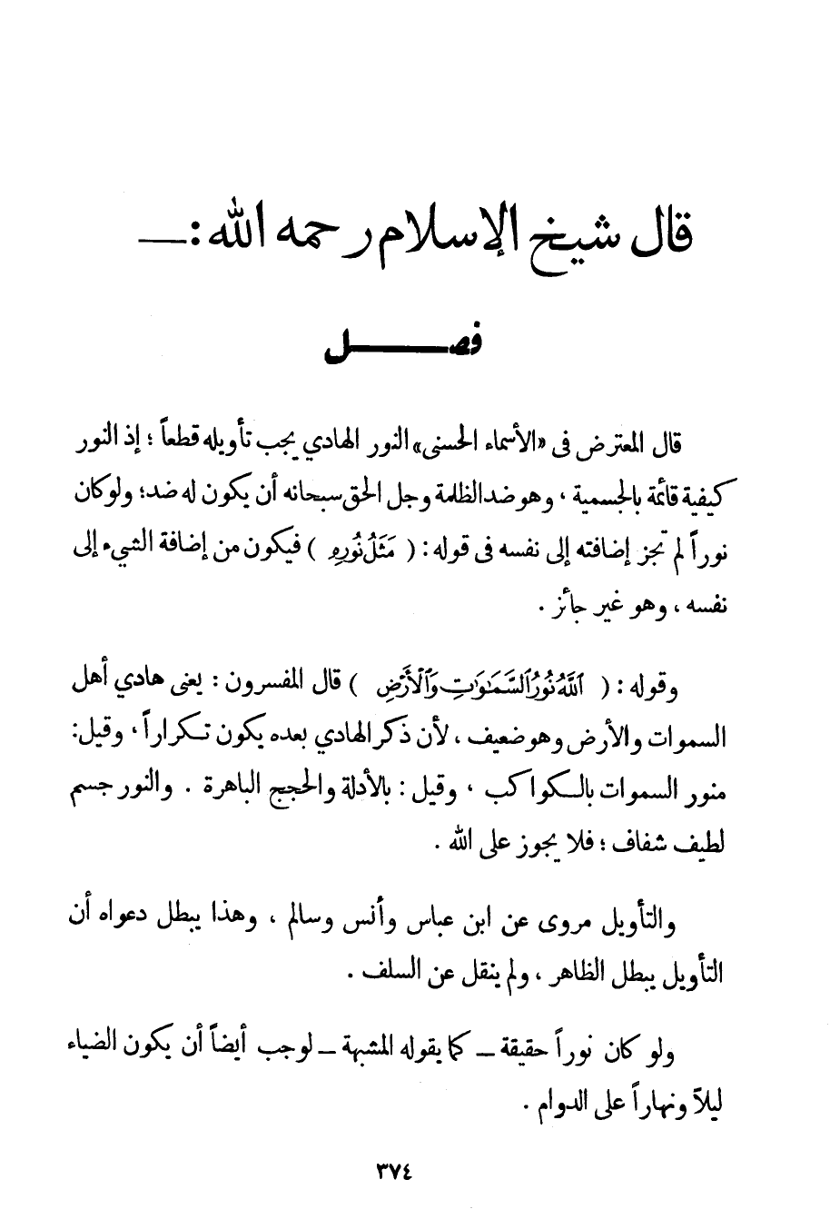قَالَ الْمُعْتَرِضُ فِي " الْأَسْمَاءِ الْحُسْنَى " النُّورُ الْهَادِي يَجِبُ تَأْوِيلُهُ قَطْعًا؛ إذْ النُّورُ كَيْفِيَّةٌ قَائِمَةٌ بِالْجِسْمِيَّةِ وَهُوَ ضِدُّ الظُّلْمَةِ وَجَلَّ الْحَقُّ سُبْحَانَهُ أَنْ يَكُونَ لَهُ ضِدٌّ؛ وَلَوْ كَانَ نُورًا لَمْ تَجُزْ إضَافَتُهُ إلَى نَفْسِهِ فِي قَوْلِهِ: {مَثَلُ نُورِهِ} فَيَكُونُ مِنْ إضَافَةِ الشَّيْءِ إلَى نَفْسِهِ وَهُوَ غَيْرُ جَائِزٍ. وَقَوْلُهُ: {اللَّهُ نُورُ السَّمَاوَاتِ وَالْأَرْضِ} قَالَ الْمُفَسِّرُونَ: يَعْنِي هَادِيَ أَهْلِ السَّمَوَاتِ وَالْأَرْضِ وَهُوَ ضَعِيفٌ لِأَنَّ ذِكْرَ الْهَادِي بَعْدَهُ يَكُونُ تَكْرَارًا وَقِيلَ: مُنَوِّرُ السَّمَوَاتِ بِالْكَوَاكِبِ وَقِيلَ: بِالْأَدِلَّةِ وَالْحُجَجِ الْبَاهِرَةِ. وَالنُّورُ جِسْمٌ لَطِيفٌ شَفَّافٌ؛ فَلَا يَجُوزُ عَلَى اللَّهِ. وَالتَّأْوِيلُ مَرْوِيٌّ عَنْ ابْنِ عَبَّاسٍ وَأَنَسٍ وَسَالِمٍ وَهَذَا يُبْطِلُ دَعْوَاهُ أَنَّ التَّأْوِيلَ يُبْطِلُ الظَّاهِرَ وَلَمْ يُنْقَلْ عَنْ السَّلَفِ. وَلَوْ كَانَ نُورًا حَقِيقَةً - كَمَا يَقُولُهُ الْمُشَبِّهَةُ - لَوَجَبَ أَيْضًا أَنْ يَكُونَ الضِّيَاءُ لَيْلًا وَنَهَارًا عَلَى الدَّوَامِ.