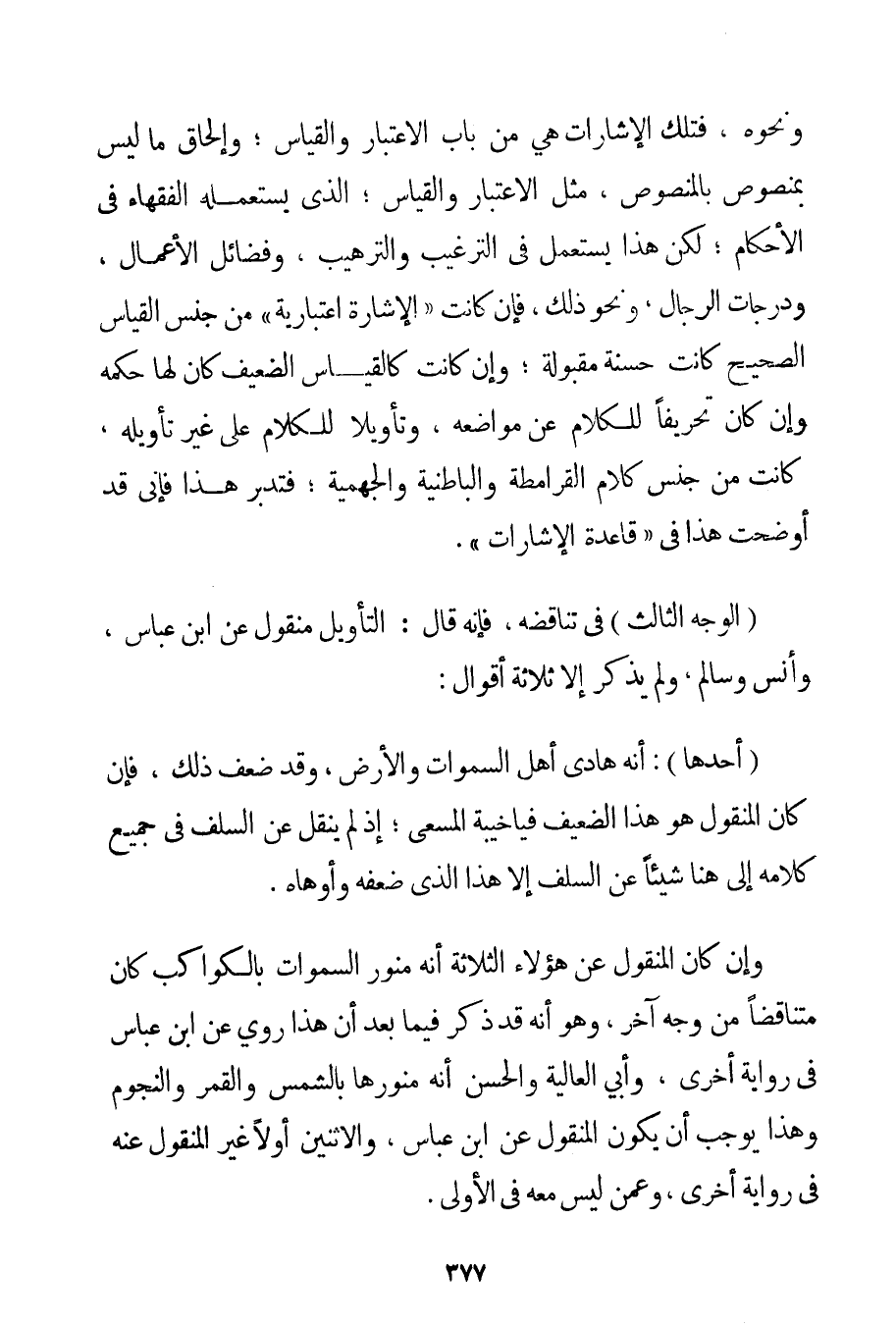 وَنَحْوِهِ فَتِلْكَ الْإِشَارَاتُ هِيَ مِنْ بَابِ الِاعْتِبَارِ وَالْقِيَاسِ؛ وَإِلْحَاقِ مَا لَيْسَ بِمَنْصُوصِ بِالْمَنْصُوصِ مِثْلُ الِاعْتِبَارِ وَالْقِيَاسِ؛ الَّذِي يَسْتَعْمِلُهُ الْفُقَهَاءُ فِي الْأَحْكَامِ؛ لَكِنَّ هَذَا يُسْتَعْمَلُ فِي التَّرْغِيبِ وَالتَّرْهِيبِ وَفَضَائِلِ الْأَعْمَالِ وَدَرَجَاتِ الرِّجَالِ وَنَحْوِ ذَلِكَ فَإِنْ كَانَتْ " الْإِشَارَةُ اعْتِبَارِيَّةً " مِنْ جِنْسِ الْقِيَاسِ الصَّحِيحِ كَانَتْ حَسَنَةً مَقْبُولَةً؛ وَإِنْ كَانَتْ كَالْقِيَاسِ الضَّعِيفِ كَانَ لَهَا حُكْمُهُ وَإِنْ كَانَ تَحْرِيفًا لِلْكَلَامِ عَنْ مَوَاضِعِهِ وَتَأْوِيلًا لِلْكَلَامِ عَلَى غَيْرِ تَأْوِيلِهِ كَانَتْ مِنْ جِنْسِ كَلَامِ الْقَرَامِطَةِ وَالْبَاطِنِيَّةِ وَالْجَهْمِيَّة؛ فَتَدَبَّرْ هَذَا فَإِنِّي قَدْ أَوْضَحْت هَذَا فِي " قَاعِدَةِ الْإِشَارَاتِ ". (الْوَجْهُ الثَّالِثُ) فِي تَنَاقُضِهِ فَإِنَّهُ قَالَ: التَّأْوِيلُ مَنْقُولٌ عَنْ ابْنِ عَبَّاسٍ وَأَنَسٍ وَسَالِمٍ وَلَمْ يَذْكُرْ إلَّا ثَلَاثَةَ أَقْوَالٍ: (أَحَدُهَا) : أَنَّهُ هَادِي أَهْلِ السَّمَوَاتِ وَالْأَرْضِ وَقَدْ ضَعَّفَ ذَلِكَ فَإِنْ كَانَ الْمَنْقُولُ هُوَ هَذَا الضَّعِيفَ فَيَا خَيْبَةَ الْمَسْعَى؛ إذْ لَمْ يَنْقُلْ عَنْ السَّلَفِ فِي جَمِيعِ كَلَامِهِ إلَى هُنَا شَيْئًا عَنْ السَّلَفِ إلَّا هَذَا الَّذِي ضَعَّفَهُ وَأَوْهَاهُ. وَإِنْ كَانَ الْمَنْقُولُ عَنْ هَؤُلَاءِ الثَّلَاثَةِ أَنَّهُ مُنَوِّرُ السَّمَوَاتِ بِالْكَوَاكِبِ كَانَ مُتَنَاقِضًا مِنْ وَجْهٍ آخَرَ وَهُوَ أَنَّهُ قَدْ ذَكَرَ فِيمَا بَعْدُ أَنَّ هَذَا رُوِيَ عَنْ ابْنِ عَبَّاسٍ فِي رِوَايَةٍ أُخْرَى وَأَبِي الْعَالِيَةِ وَالْحَسَنِ أَنَّهُ مُنَوِّرُهَا بِالشَّمْسِ وَالْقَمَرِ وَالنُّجُومِ وَهَذَا يُوجِبُ أَنْ يَكُونَ الْمَنْقُولُ عَنْ ابْنِ عَبَّاسٍ وَالِاثْنَيْنِ أَوَّلًا غَيْرَ الْمَنْقُولِ عَنْهُ فِي رِوَايَةٍ أُخْرَى وَعَمَّنْ لَيْسَ مَعَهُ فِي الْأُولَى.