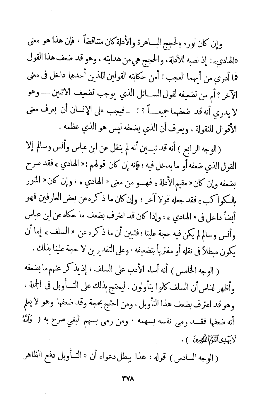 وَإِنْ كَانَ نَوَّرَهُ بِالْحُجَجِ الْبَاهِرَةِ وَالْأَدِلَّةِ كَانَ مُتَنَاقِضًا فَإِنَّ هَذَا هُوَ مَعْنَى " الْهَادِي ": إذْ نَصْبُهُ لِلْأَدِلَّةِ وَالْحُجَجِ هِيَ مِنْ هِدَايَتِهِ وَهُوَ قَدْ ضَعَّفَ هَذَا الْقَوْلَ فَمَا أَدْرِي مِنْ أَيِّهِمَا الْعَجَبُ أَمِنْ حِكَايَتِهِ الْقَوْلَيْنِ اللَّذَيْنِ أَحَدُهُمَا دَاخِلٌ فِي مَعْنَى الْآخَرِ؟ أَمْ مِنْ تَضْعِيفِهِ لِقَوْلِ السَّائِلِ الَّذِي يُوجِبُ تَضْعِيفَ الِاثْنَيْنِ - وَهُوَ لَا يَدْرِي أَنَّهُ قَدْ ضَعَّفَهُمَا جَمِيعًا - فَيَجِبُ عَلَى الْإِنْسَانِ أَنْ يَعْرِفَ مَعْنَى الْأَقْوَالِ الْمَنْقُولَةِ وَيَعْرِفَ أَنَّ الَّذِي يُضَعِّفُهُ لَيْسَ هُوَ الَّذِي عَظَّمَهُ. (الْوَجْهُ الرَّابِعُ) أَنَّهُ قَدْ تَبَيَّنَ أَنَّهُ لَمْ يَنْقُلْ عَنْ ابْنِ عَبَّاسٍ وَأَنَسٍ وَسَالِمٍ إلَّا الْقَوْلَ الَّذِي ضَعَّفَهُ أَوْ مَا يَدْخُلُ فِيهِ؛ فَإِنَّهُ إنْ كَانَ قَوْلُهُمْ: " الْهَادِي " فَقَدْ صَرَّحَ بِضَعْفِهِ وَإِنْ كَانَ " مُقِيمَ الْأَدِلَّةِ " فَهُوَ مِنْ مَعْنَى " الْهَادِي "؛ وَإِنْ كَانَ " الْمُنَوِّرَ بِالْكَوَاكِبِ " فَقَدْ جَعَلَهُ قَوْلًا آخَرَ؛ وَإِنْ كَانَ مَا ذَكَرَهُ عَنْ بَعْضِ الْعَارِفِينَ فَهُوَ أَيْضًا دَاخِلٌ فِي " الْهَادِي "؛ وَإِذَا كَانَ قَدْ اعْتَرَفَ بِضَعْفِ مَا حَكَاهُ عَنْ ابْنِ عَبَّاسٍ وَأَنَسٍ وَسَالِمٍ لَمْ يَكُنْ فِيهِ حُجَّةٌ عَلَيْنَا؛ فَتَبَيَّنَ أَنَّ مَا ذَكَرَهُ عَنْ " السَّلَفِ " إمَّا أَنْ يَكُونَ مُبْطِلًا فِي نَقْلِهِ أَوْ مُفْتَرِيًا بِتَضْعِيفِهِ وَعَلَى التَّقْدِيرَيْنِ لَا حُجَّةَ عَلَيْنَا بِذَلِكَ. (الْوَجْهُ الْخَامِسُ) أَنَّهُ أَسَاءَ الْأَدَبَ عَلَى السَّلَفِ؛ إذْ يَذْكُرُ عَنْهُمْ مَا يُضَعِّفُهُ وَأَظْهَرَ لِلنَّاسِ أَنَّ السَّلَفَ كَانُوا يَتَأَوَّلُونَ لِيَحْتَجَّ بِذَلِكَ عَلَى التَّأْوِيلِ فِي الْجُمْلَةِ وَهُوَ قَدْ اعْتَرَفَ بِضَعْفِ هَذَا التَّأْوِيلِ وَمَنْ احْتَجَّ بِحُجَّةِ وَقَدْ ضَعَّفَهَا وَهُوَ لَا يَعْلَمُ أَنَّهُ ضَعَّفَهَا فَقَدْ رَمَى نَفْسَهُ بِسَهْمِهِ وَمَنْ رَمَى بِسَهْمِ الْبَغْيِ صُرِعَ بِهِ {وَاللَّهُ لَا يَهْدِي الْقَوْمَ الظَّالِمِينَ} . (الْوَجْهُ السَّادِسُ) قَوْلُهُ: هَذَا يُبْطِلُ دَعْوَاهُ أَنَّ " التَّأْوِيلَ دَفَعَ الظَّاهِرَ