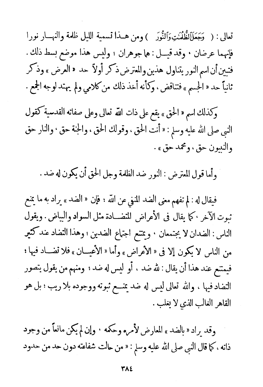 تَعَالَى: {وَجَعَلَ الظُّلُمَاتِ وَالنُّورَ} وَمِنْ هَذَا تَسْمِيَةُ اللَّيْلِ ظُلْمَةً وَالنَّهَارِ نُورًا فَإِنَّهُمَا عَرَضَانِ وَقَدْ قِيلَ: هَمَّا جَوْهَرَانِ؛ وَلَيْسَ هَذَا مَوْضِعَ بَسْطِ ذَلِكَ. فَتَبَيَّنَ أَنَّ اسْمَ النُّورِ يَتَنَاوَلُ هَذَيْنِ وَالْمُعْتَرِضُ ذَكَرَ أَوَّلًا حَدَّ " الْعَرَضِ " وَذَكَرَ ثَانِيًا حَدَّ " الْجِسْمِ " فَتَنَاقَضَ وَكَأَنَّهُ أَخَذَ ذَلِكَ مِنْ كَلَامِي وَلَمْ يَهْتَدِ لِوَجْهِ الْجَمْعِ. وَكَذَلِكَ اسْمُ " الْحَقِّ " يَقَعُ عَلَى ذَاتِ اللَّهِ تَعَالَى وَعَلَى صِفَاتِهِ الْقُدْسِيَّةِ كَقَوْلِ النَّبِيِّ صَلَّى اللَّهُ عَلَيْهِ وَسَلَّمَ {أَنْتَ الْحَقُّ وَقَوْلُك الْحَقُّ وَالْجَنَّةُ حَقٌّ وَالنَّارُ حَقٌّ وَالنَّبِيُّونَ حَقٌّ وَمُحَمَّدٌ حَقٌّ} .