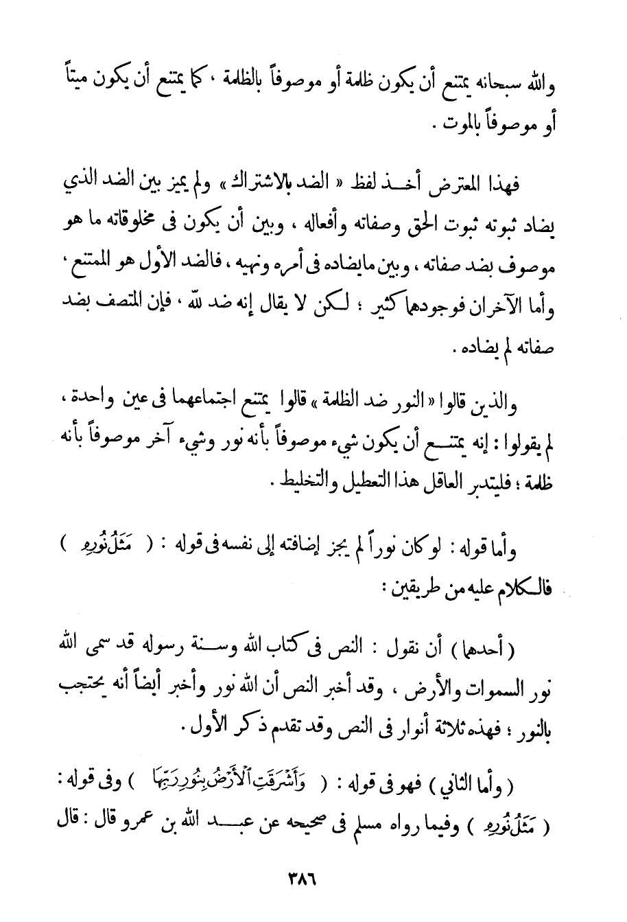 وَاَللَّهُ سُبْحَانَهُ يَمْتَنِعُ أَنْ يَكُونَ ظُلْمَةً أَوْ مَوْصُوفًا بِالظُّلْمَةِ كَمَا يَمْتَنِعُ أَنْ يَكُونَ مَيِّتًا أَوْ مَوْصُوفًا بِالْمَوْتِ. فَهَذَا الْمُعْتَرِضُ أَخَذَ لَفْظَ " الضِّدِّ بِالِاشْتِرَاكِ " وَلَمْ يُمَيِّزْ بَيْنَ الضِّدِّ الَّذِي يُضَادُّ ثُبُوتُهُ ثُبُوتَ الْحَقِّ وَصِفَاتِهِ وَأَفْعَالَهُ وَبَيْنَ أَنْ يَكُونَ فِي مَخْلُوقَاتِهِ مَا هُوَ مَوْصُوفٌ بِضِدِّ صِفَاتِهِ وَبَيْنَ مَا يُضَادُّهُ فِي أَمْرِهِ وَنَهْيِهِ فَالضِّدُّ الْأَوَّلُ هُوَ الْمُمْتَنِعُ وَأَمَّا الْآخَرَانِ فَوُجُودُهُمَا كَثِيرٌ؛ لَكِنْ لَا يُقَالُ إنَّهُ ضِدٌّ لِلَّهِ فَإِنَّ الْمُتَّصِفَ بِضِدِّ صِفَاتِهِ لَمْ يُضَادَّهُ. وَاَلَّذِينَ قَالُوا " النُّورُ ضِدُّ الظُّلْمَةِ " قَالُوا يَمْتَنِعُ اجْتِمَاعُهُمَا فِي عَيْنٍ وَاحِدَةٍ لَمْ يَقُولُوا: إنَّهُ يَمْتَنِعُ أَنْ يَكُونَ شَيْءٌ مَوْصُوفًا بِأَنَّهُ نُورٌ وَشَيْءٌ آخَرُ مَوْصُوفًا بِأَنَّهُ ظُلْمَةٌ؛ فَلْيَتَدَبَّرْ الْعَاقِلُ هَذَا التَّعْطِيلَ وَالتَّخْلِيطَ. وَأَمَّا قَوْلُهُ: لَوْ كَانَ نُورًا لَمْ يَجُزْ إضَافَتُهُ إلَى نَفْسِهِ فِي قَوْلِهِ: {مَثَلُ نُورِهِ} فَالْكَلَامُ عَلَيْهِ مِنْ طَرِيقَيْنِ: (أَحَدُهُمَا) أَنْ نَقُولَ: النَّصُّ فِي كِتَابِ اللَّهِ وَسُنَّةِ رَسُولِهِ قَدْ سَمَّى اللَّهَ نُورَ السَّمَوَاتِ وَالْأَرْضِ وَقَدْ أَخْبَرَ النَّصُّ أَنَّ اللَّهَ نُورٌ وَأَخْبَرَ أَيْضًا أَنَّهُ يَحْتَجِبُ بِالنُّورِ؛ فَهَذِهِ ثَلَاثَةُ أَنْوَارٍ فِي النَّصِّ وَقَدْ تَقَدَّمَ ذِكْرُ الْأَوَّلِ. (وَأَمَّا الثَّانِي) فَهُوَ فِي قَوْلِهِ: {وَأَشْرَقَتِ الْأَرْضُ بِنُورِ رَبِّهَا} وَفِي قَوْلِهِ: {مَثَلُ نُورِهِ} وَفِيمَا رَوَاهُ مُسْلِمٌ فِي صَحِيحِهِ عَنْ عَبْدِ اللَّهِ بْنِ عَمْرٍو قَالَ: قَالَ