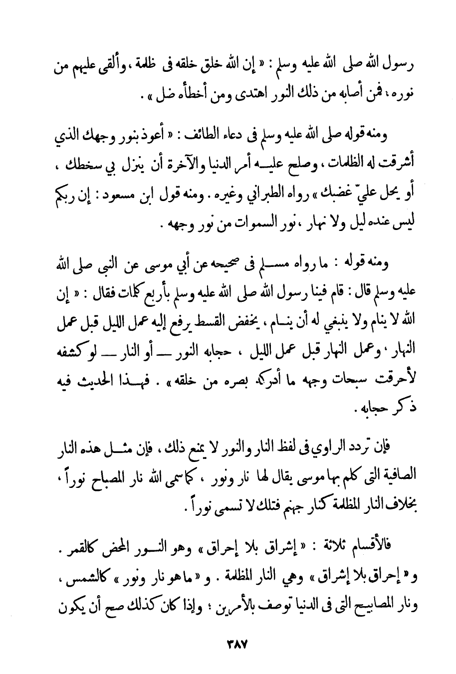 رَسُولُ اللَّهِ صَلَّى اللَّهُ عَلَيْهِ وَسَلَّمَ {إنَّ اللَّهَ خَلَقَ خَلْقَهُ فِي ظُلْمَةٍ وَأَلْقَى عَلَيْهِمْ مِنْ نُورِهِ فَمَنْ أَصَابَهُ مِنْ ذَلِكَ النُّورِ اهْتَدَى وَمَنْ أَخْطَأَهُ ضَلَّ.} وَمِنْهُ قَوْلُهُ صَلَّى اللَّهُ عَلَيْهِ وَسَلَّمَ فِي دُعَاءِ الطَّائِفِ: {أَعُوذُ بِنُورِ وَجْهِك الَّذِي أَشْرَقَتْ لَهُ الظُّلُمَاتُ وَصَلُحَ عَلَيْهِ أَمْرُ الدُّنْيَا وَالْآخِرَةِ أَنْ يَنْزِلَ بِي سَخَطُك أَوْ يَحِلَّ عَلَيَّ غَضَبُك} رَوَاهُ الطَّبَرَانِي وَغَيْرُهُ. وَمِنْهُ قَوْلُ ابْنِ مَسْعُودٍ: إنَّ رَبَّكُمْ لَيْسَ عِنْدَهُ لَيْلٌ وَلَا نَهَارٌ نُورُ السَّمَوَاتِ مِنْ نُورِ وَجْهِهِ. وَمِنْهُ قَوْلُهُ: مَا رَوَاهُ مُسْلِمٌ فِي صَحِيحِهِ عَنْ أَبِي مُوسَى عَنْ النَّبِيِّ صَلَّى اللَّهُ عَلَيْهِ وَسَلَّمَ قَالَ: {قَامَ فِينَا رَسُولُ اللَّهِ صَلَّى اللَّهُ عَلَيْهِ وَسَلَّمَ بِأَرْبَعِ كَلِمَاتٍ فَقَالَ: إنَّ اللَّهَ لَا يَنَامُ وَلَا يَنْبَغِي لَهُ أَنْ يَنَامَ يَخْفِضُ الْقِسْطَ يُرْفَعُ إلَيْهِ عَمَلُ اللَّيْلِ قَبْلَ عَمَلِ النَّهَارِ وَعَمَلُ النَّهَارِ قَبْلَ عَمَلِ اللَّيْلِ حِجَابُهُ النُّورُ - أَوْ النَّارُ - لَوْ كَشَفَهُ لَأَحْرَقَتْ سُبُحَاتُ وَجْهِهِ مَا أَدْرَكَهُ بَصَرُهُ مِنْ خَلْقِهِ} . فَهَذَا الْحَدِيثُ فِيهِ ذِكْرُ حِجَابِهِ. فَإِنَّ تَرَدُّدَ الرَّاوِي فِي لَفْظِ النَّارِ وَالنُّورِ لَا يَمْنَعُ ذَلِكَ فَإِنَّ مِثْلَ هَذِهِ النَّارِ الصَّافِيَةِ الَّتِي كَلَّمَ بِهَا مُوسَى يُقَالُ لَهَا نَارٌ وَنُورٌ كَمَا سَمَّى اللَّهُ نَارَ الْمِصْبَاحِ نُورًا بِخِلَافِ النَّارِ الْمُظْلِمَةِ كَنَارِ جَهَنَّمَ فَتِلْكَ لَا تُسَمَّى نُورًا. فَالْأَقْسَامُ ثَلَاثَةٌ: " إشْرَاقٌ بِلَا إحْرَاقٍ " وَهُوَ النُّورُ الْمَحْضُ كَالْقَمَرِ. وَ " إحْرَاقٌ بِلَا إشْرَاقٍ " وَهِيَ النَّارُ الْمُظْلِمَةُ. وَ " مَا هُوَ نَارٌ وَنُورٌ " كَالشَّمْسِ وَنَارِ الْمَصَابِيحِ الَّتِي فِي الدُّنْيَا تُوصَفُ بِالْأَمْرَيْنِ؛ وَإِذَا كَانَ كَذَلِكَ صَحَّ أَنْ يَكُونَ