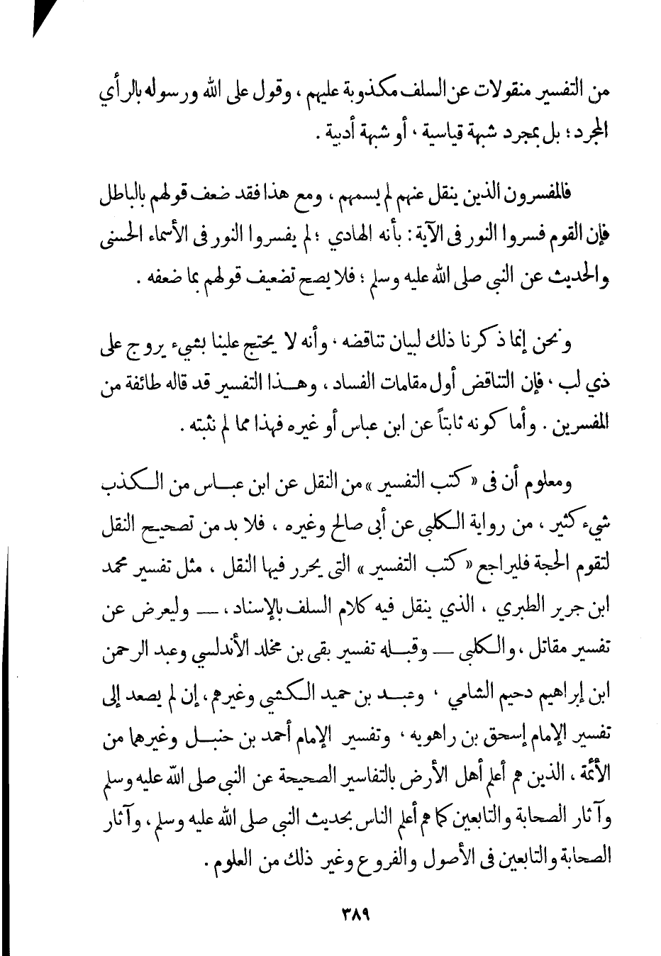 مِنْ التَّفْسِيرِ مَنْقُولَاتٌ عَنْ السَّلَفِ مَكْذُوبَةٌ عَلَيْهِمْ وَقَوْلٌ عَلَى اللَّهِ وَرَسُولِهِ بِالرَّأْيِ الْمُجَرَّدِ؛ بَلْ بِمُجَرَّدِ شُبْهَةٍ قِيَاسِيَّةٍ أَوْ شُبْهَةٍ أَدَبِيَّةٍ. فَالْمُفَسِّرُونَ الَّذِينَ يُنْقَلُ عَنْهُمْ لَمْ يُسَمِّهِمْ وَمَعَ هَذَا فَقَدَ ضَعَّفَ قَوْلَهُمْ بِالْبَاطِلِ فَإِنَّ الْقَوْمَ فَسَّرُوا النُّورَ فِي الْآيَةِ: بِأَنَّهُ الْهَادِي؛ لَمْ يُفَسِّرُوا النُّورَ فِي الْأَسْمَاءِ الْحُسْنَى وَالْحَدِيثِ عَنْ النَّبِيِّ صَلَّى اللَّهُ عَلَيْهِ وَسَلَّمَ فَلَا يَصِحُّ تَضْعِيفُ قَوْلِهِمْ بِمَا ضَعَّفَهُ. وَنَحْنُ إنَّمَا ذَكَرْنَا ذَلِكَ لِبَيَانِ تَنَاقُضِهِ وَأَنَّهُ لَا يَحْتَجُّ عَلَيْنَا بِشَيْءِ يَرُوجُ عَلَى ذِي لُبٍّ فَإِنَّ التَّنَاقُضَ أَوَّلُ مَقَامَاتِ الْفَسَادِ وَهَذَا التَّفْسِيرُ قَدْ قَالَهُ طَائِفَةٌ مِنْ الْمُفَسِّرِينَ.