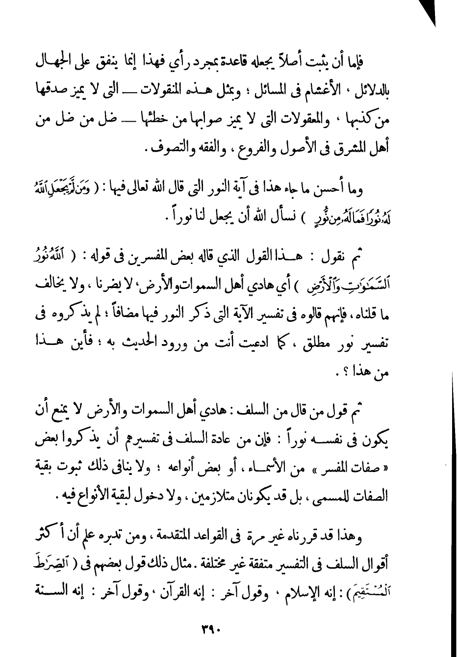 فَإِمَّا أَنْ يُثْبِتَ أَصْلًا يَجْعَلُهُ قَاعِدَةً بِمُجَرَّدِ رَأْيٍ فَهَذَا إنَّمَا يَنْفُقُ عَلَى الْجُهَّالِ بِالدَّلَائِلِ الأغشام فِي الْمَسَائِلِ؛ وَبِمِثْلِ هَذِهِ الْمَنْقُولَاتِ - الَّتِي لَا يُمَيَّزُ صِدْقُهَا مِنْ كَذِبِهَا وَالْمَعْقُولَاتِ الَّتِي لَا يُمَيَّزُ صَوَابُهَا مِنْ خَطَئِهَا - ضَلَّ مَنْ ضَلَّ مِنْ أَهْلِ الْمَشْرِقِ فِي الْأُصُولِ وَالْفُرُوعِ وَالْفِقْهِ وَالتَّصَوُّفِ. وَمَا أَحْسَنَ مَا جَاءَ هَذَا فِي آيَةِ النُّورِ الَّتِي قَالَ اللَّهُ تَعَالَى فِيهَا: {وَمَنْ لَمْ يَجْعَلِ اللَّهُ لَهُ نُورًا فَمَا لَهُ مِنْ نُورٍ} نَسْأَلُ اللَّهَ أَنْ يَجْعَلَ لَنَا نُورًا. ثُمَّ نَقُولُ: هَذَا الْقَوْلُ الَّذِي قَالَهُ بَعْضُ الْمُفَسِّرِينَ فِي قَوْلِهِ: {اللَّهُ نُورُ السَّمَاوَاتِ وَالْأَرْضِ} أَيْ هَادِي أَهْلِ السَّمَوَاتِ وَالْأَرْضِ لَا يَضُرُّنَا وَلَا يُخَالِفُ مَا قُلْنَاهُ فَإِنَّهُمْ قَالُوهُ فِي تَفْسِيرِ الْآيَةِ الَّتِي ذَكَرَ النُّورُ فِيهَا مُضَافًا؛ لَمْ يَذْكُرُوهُ فِي تَفْسِيرِ نُورٍ مُطْلَقٍ كَمَا ادَّعَيْت أَنْتَ مِنْ وُرُودِ الْحَدِيثِ بِهِ؛ فَأَيْنَ هَذَا مِنْ هَذَا؟ . ثُمَّ قَوْلُ مَنْ قَالَ مِنْ السَّلَفِ: هَادِي أَهْلِ السَّمَوَاتِ وَالْأَرْضِ لَا يَمْنَعُ أَنْ يَكُونَ فِي نَفْسِهِ نُورًا: فَإِنَّ مِنْ عَادَةِ السَّلَفِ فِي تَفْسِيرِهِمْ أَنْ يَذْكُرُوا بَعْضَ " صِفَاتِ الْمُفَسَّرِ " مِنْ الْأَسْمَاءِ أَوْ بَعْضَ أَنْوَاعِهِ؛ وَلَا يُنَافِي ذَلِكَ ثُبُوتَ بَقِيَّةِ الصِّفَات لِلْمُسَمَّى بَلْ قَدْ يَكُونَانِ مُتَلَازِمَيْنِ وَلَا دُخُولَ لِبَقِيَّةِ الْأَنْوَاعِ فِيهِ. وَهَذَا قَدْ قَرَّرْنَاهُ غَيْرَ مَرَّةٍ فِي الْقَوَاعِدِ الْمُتَقَدِّمَةِ وَمَنْ تَدَبَّرَهُ عَلِمَ أَنَّ أَكْثَرَ أَقْوَالِ السَّلَفِ فِي التَّفْسِيرِ مُتَّفِقَةٌ غَيْرُ مُخْتَلِفَةٍ. مِثَالُ ذَلِكَ قَوْل بَعْضِهِمْ فِي {الصِّرَاطَ الْمُسْتَقِيمَ} إنَّهُ الْإِسْلَامُ وَقَوْلٌ آخَرُ: إنَّهُ الْقُرْآنُ وَقَوْلٌ آخَرُ: إنَّهُ السُّنَّةُ