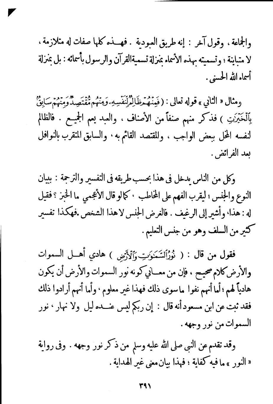 وَالْجَمَاعَةُ وَقَوْلٌ آخَرُ: إنَّهُ طَرِيقُ الْعُبُودِيَّةِ. فَهَذِهِ كُلُّهَا صِفَاتٌ لَهُ مُتَلَازِمَةٌ لَا مُتَبَايِنَةٌ؛ وَتَسْمِيَتُهُ بِهَذِهِ الْأَسْمَاءِ بِمَنْزِلَةِ تَسْمِيَةِ الْقُرْآنِ وَالرَّسُولِ بِأَسْمَائِهِ: بَلْ بِمَنْزِلَةِ أَسْمَاءِ اللَّهِ الْحُسْنَى. وَمِثَالُ " الثَّانِي " قَوْله تَعَالَى {فَمِنْهُمْ ظَالِمٌ لِنَفْسِهِ وَمِنْهُمْ مُقْتَصِدٌ وَمِنْهُمْ سَابِقٌ بِالْخَيْرَاتِ} فَذَكَرَ مِنْهُمْ صِنْفًا مِنْ الْأَصْنَافِ وَالْعَبْدُ يَعُمُّ الْجَمِيعَ. فَالظَّالِمُ لِنَفَسِهِ الْمُخِلُّ بِبَعْضِ الْوَاجِبِ وَالْمُقْتَصِدُ الْقَائِمُ بِهِ وَالسَّابِقُ الْمُتَقَرِّبُ بِالنَّوَافِلِ بَعْدَ الْفَرَائِضِ. وَكُلٌّ مِنْ النَّاسِ يَدْخُلُ فِي هَذَا بِحَسَبِ طَرِيقِهِ فِي التَّفْسِيرِ وَالتَّرْجَمَةِ: بِبَيَانِ النَّوْعِ وَالْجِنْسِ؛ لِيَقْرُبَ الْفَهْمُ عَلَى الْمُخَاطَبِ كَمَا لَوْ قَالَ الْأَعْجَمِيُّ مَا الْخُبْزُ؟ فَقِيلَ لَهُ: هَذَا وَأُشِيرَ إلَى الرَّغِيفِ. فَالْغَرَضُ الْجِنْسُ لَا هَذَا الشَّخْصُ. فَهَكَذَا تَفْسِيرُ كَثِيرٍ مِنْ السَّلَفِ وَهُوَ مِنْ جِنْسِ التَّعْلِيمِ. فَقَوْلُ مَنْ قَالَ: {اللَّهُ نُورُ السَّمَاوَاتِ وَالْأَرْضِ} هَادِي أَهْلِ السَّمَوَاتِ وَالْأَرْضِ كَلَامٌ صَحِيحٌ فَإِنَّ مِنْ مَعَانِي كَوْنِهِ نُورَ السَّمَوَاتِ وَالْأَرْضِ أَنْ يَكُونَ هَادِيًا لَهُمْ؛ أَمَّا إنَّهُمْ نَفَوْا مَا سِوَى ذَلِكَ فَهَذَا غَيْرُ مَعْلُومٍ وَأَمَّا إنَّهُمْ أَرَادُوا ذَلِكَ فَقَدْ ثَبَتَ عَنْ ابْنِ مَسْعُودٍ أَنَّهُ قَالَ: إنَّ رَبَّكُمْ لَيْسَ عِنْدَهُ لَيْلٌ وَلَا نَهَارٌ نُورُ السَّمَوَاتِ مِنْ نُورِ وَجْهِهِ. وَقَدْ تَقَدَّمَ عَنْ النَّبِيِّ صَلَّى اللَّهُ عَلَيْهِ وَسَلَّمَ مِنْ ذِكْرِ نُورِ وَجْهِهِ. وَفِي رِوَايَةِ " النُّورِ " مَا فِيهِ كِفَايَةٌ؛ فَهَذَا بَيَانُ مَعْنَى غَيْرِ الْهِدَايَةِ.