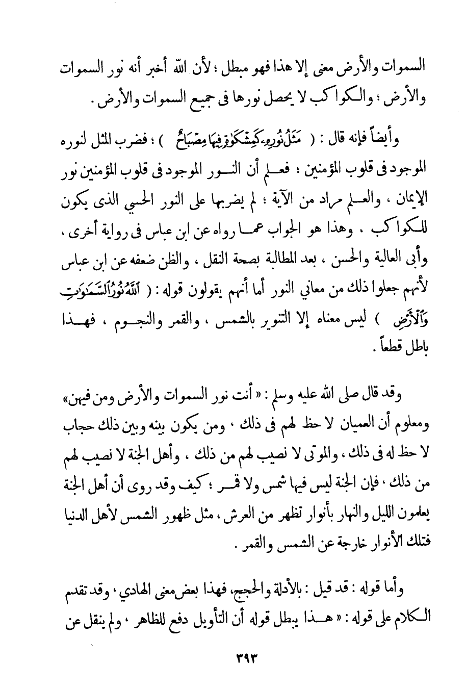 السَّمَوَاتِ وَالْأَرْضِ مَعْنًى إلَّا هَذَا فَهُوَ مُبْطِلٌ؛ لِأَنَّ اللَّهَ أَخْبَرَ أَنَّهُ نُورُ السَّمَوَاتِ وَالْأَرْضِ؛ وَالْكَوَاكِبُ لَا يَحْصُلُ نُورُهَا فِي جَمِيعِ السَّمَوَاتِ وَالْأَرْضِ. وَأَيْضًا فَإِنَّهُ قَالَ: {مَثَلُ نُورِهِ كَمِشْكَاةٍ فِيهَا مِصْبَاحٌ} فَضَرَبَ الْمَثَلَ لِنُورِهِ الْمَوْجُودِ فِي قُلُوبِ الْمُؤْمِنِينَ؛ فَعُلِمَ أَنَّ النُّورَ الْمَوْجُودَ فِي قُلُوبِ الْمُؤْمِنِينَ نُورُ الْإِيمَانِ وَالْعِلْمِ مُرَادٌ مِنْ الْآيَةِ؛ لَمْ يَضْرِبْهَا عَلَى النُّورِ الْحِسِّيِّ الَّذِي يَكُونُ لِلْكَوَاكِبِ وَهَذَا هُوَ الْجَوَابُ عَمَّا رَوَاهُ عَنْ ابْنِ عَبَّاسٍ فِي رِوَايَةٍ أُخْرَى وَأَبِي الْعَالِيَةِ وَالْحَسَنِ بَعْدَ الْمُطَالَبَةِ بِصِحَّةِ النَّقْلِ وَالظَّنِّ ضَعَّفَهُ عَنْ ابْنِ عَبَّاسٍ لِأَنَّهُمْ جَعَلُوا ذَلِكَ مِنْ مَعَانِي النُّورِ أَمَّا إنَّهُمْ يَقُولُونَ قَوْلَهُ: {اللَّهُ نُورُ السَّمَاوَاتِ وَالْأَرْضِ} لَيْسَ مَعْنَاهُ إلَّا التَّنْوِيرَ بِالشَّمْسِ وَالْقَمَرِ وَالنُّجُومِ فَهَذَا بَاطِلٌ قَطْعًا. وَقَدْ قَالَ صَلَّى اللَّهُ عَلَيْهِ وَسَلَّمَ {أَنْتَ نُورُ السَّمَوَاتِ وَالْأَرْضِ وَمَنْ فِيهِنَّ} وَمَعْلُومٌ أَنَّ الْعُمْيَانَ لَا حَظَّ لَهُمْ فِي ذَلِكَ وَمَنْ يَكُونُ بَيْنَهُ وَبَيْنَ ذَلِكَ حِجَابٌ لَا حَظَّ لَهُ فِي ذَلِكَ وَالْمَوْتَى لَا نَصِيبَ لَهُمْ مِنْ ذَلِكَ وَأَهْلُ الْجَنَّةِ لَا نَصِيبَ لَهُمْ مِنْ ذَلِكَ فَإِنَّ الْجَنَّةَ لَيْسَ فِيهَا شَمْسٌ وَلَا قَمَرٌ؛ كَيْفَ وَقَدْ رُوِيَ أَنَّ أَهْلَ الْجَنَّةِ يَعْلَمُونَ اللَّيْلَ وَالنَّهَارَ بِأَنْوَارِ تَظْهَرُ مِنْ الْعَرْشِ مِثْلُ ظُهُورِ الشَّمْسِ لِأَهْلِ الدُّنْيَا فَتِلْكَ الْأَنْوَارُ خَارِجَةٌ عَنْ الشَّمْسِ وَالْقَمَرِ. وَأَمَّا قَوْلُهُ: قَدْ قِيلَ: بِالْأَدِلَّةِ وَالْحُجَجِ فَهَذَا بَعْضُ مَعْنَى الْهَادِي وَقَدْ تَقَدَّمَ الْكَلَامُ عَلَى قَوْلِهِ: " هَذَا يُبْطِلُ قَوْلَهُ إنَّ التَّأْوِيلَ دَفْعٌ لِلظَّاهِرِ وَلَمْ يُنْقَلْ عَنْ