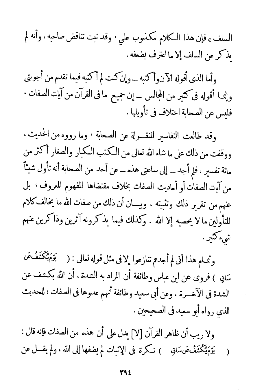السَّلَفِ " فَإِنَّ هَذَا الْكَلَامَ مَكْذُوبٌ عَلَيَّ وَقَدْ ثَبَتَ تَنَاقُضُ صَاحِبِهِ وَأَنَّهُ لَمْ يَذْكُرْ عَنْ السَّلَفِ إلَّا مَا اعْتَرَفَ بِضَعْفِهِ. وَأَمَّا الَّذِي أَقُولُهُ الْآنَ وَأَكْتُبُهُ - وَإِنْ كُنْت لَمْ أَكْتُبْهُ فِيمَا تَقَدَّمَ مِنْ أَجْوِبَتِي وَإِنَّمَا أَقُولُهُ فِي كَثِيرٍ مِنْ الْمَجَالِسِ - أَنَّ جَمِيعَ مَا فِي الْقُرْآنِ مِنْ آيَاتِ الصِّفَات فَلَيْسَ عَنْ الصَّحَابَةِ اخْتِلَافٌ فِي تَأْوِيلِهَا. وَقَدْ طَالَعْت التَّفَاسِيرَ الْمَنْقُولَةَ عَنْ الصَّحَابَةِ وَمَا رَوَوْهُ مِنْ الْحَدِيثِ وَوَقَفْت مِنْ ذَلِكَ عَلَى مَا شَاءَ اللَّهُ تَعَالَى مِنْ الْكُتُبِ الْكِبَارِ وَالصِّغَارِ أَكْثَرَ مِنْ مِائَةِ تَفْسِيرٍ فَلَمْ أَجِدْ - إلَى سَاعَتِي هَذِهِ - عَنْ أَحَدٍ مِنْ الصَّحَابَةِ أَنَّهُ تَأَوَّلَ شَيْئًا مِنْ آيَاتِ الصِّفَاتِ أَوْ أَحَادِيثِ الصِّفَاتِ بِخِلَافِ مُقْتَضَاهَا الْمَفْهُومِ الْمَعْرُوفِ؛ بَلْ عَنْهُمْ مِنْ تَقْرِيرِ ذَلِكَ وَتَثْبِيتِهِ وَبَيَانِ أَنَّ ذَلِكَ مِنْ صِفَاتِ اللَّهِ مَا يُخَالِفُ كَلَامَ الْمُتَأَوِّلِينَ مَا لَا يُحْصِيهِ إلَّا اللَّهُ. وَكَذَلِكَ فِيمَا يَذْكُرُونَهُ آثِرِينَ وَذَاكِرِينَ عَنْهُمْ شَيْئًا كَثِيرًا. وَتَمَامُ هَذَا أَنِّي لَمْ أَجِدْهُمْ تَنَازَعُوا إلَّا فِي مِثْلِ قَوْله تَعَالَى {يَوْمَ يُكْشَفُ عَنْ سَاقٍ} فَرُوِيَ عَنْ ابْنِ عَبَّاسٍ وَطَائِفَة أَنَّ الْمُرَادَ بِهِ الشِّدَّةُ أَنَّ اللَّهَ يَكْشِفُ عَنْ الشِّدَّةِ فِي الْآخِرَةِ وَعَنْ أَبِي سَعِيدٍ وَطَائِفَةٍ أَنَّهُمْ عَدُّوهَا فِي الصِّفَات؛ لِلْحَدِيثِ الَّذِي رَوَاهُ أَبُو سَعِيدٍ فِي الصَّحِيحَيْنِ. وَلَا رَيْبَ أَنَّ ظَاهِرَ الْقُرْآنِ لَا يَدُلُّ عَلَى أَنَّ هَذِهِ مِنْ الصِّفَات فَإِنَّهُ قَالَ: {يَوْمَ يُكْشَفُ عَنْ سَاقٍ} نَكِرَةٌ فِي الْإِثْبَاتِ لَمْ يُضِفْهَا إلَى اللَّهِ وَلَمْ يَقُلْ عَنْ