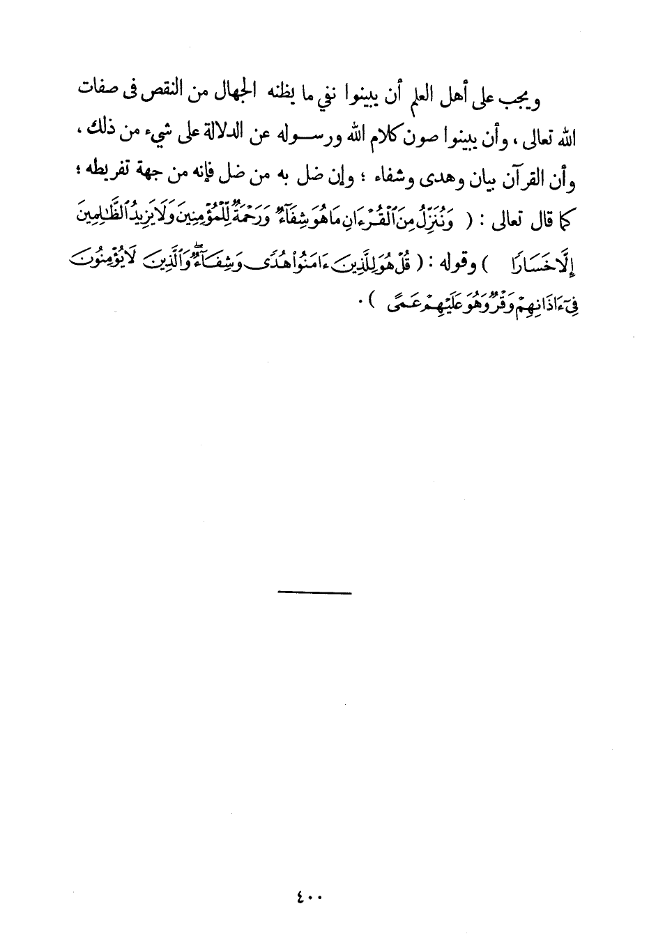 وَيَجِبُ عَلَى أَهْلِ الْعِلْمِ أَنْ يُبَيِّنُوا نَفْيَ مَا يَظُنُّهُ الْجُهَّالُ مِنْ النَّقْصِ فِي صِفَاتِ اللَّهِ تَعَالَى وَأَنْ يُبَيِّنُوا صَوْنَ كَلَامِ اللَّهِ وَرَسُولِهِ عَنْ الدَّلَالَةِ عَلَى شَيْءٍ مِنْ ذَلِكَ وَأَنَّ الْقُرْآنَ بَيَانٌ وَهُدًى وَشِفَاءٌ؛ وَإِنْ ضَلَّ بِهِ مَنْ ضَلَّ فَإِنَّهُ مِنْ جِهَةِ تَفْرِيطِهِ؛ كَمَا قَالَ تَعَالَى: {وَنُنَزِّلُ مِنَ الْقُرْآنِ مَا هُوَ شِفَاءٌ وَرَحْمَةٌ لِلْمُؤْمِنِينَ وَلَا يَزِيدُ الظَّالِمِينَ إلَّا خَسَارًا} وَقَوْلُهُ: {قُلْ هُوَ لِلَّذِينَ آمَنُوا هُدًى وَشِفَاءٌ وَالَّذِينَ لَا يُؤْمِنُونَ فِي آذَانِهِمْ وَقْرٌ وَهُوَ عَلَيْهِمْ عَمًى} .