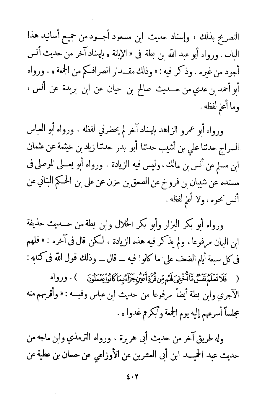 التَّصْرِيحُ بِذَلِكَ؛ وَإِسْنَادُ حَدِيثِ ابْنِ مَسْعُودٍ أَجْوَدُ مِنْ جَمِيعِ أَسَانِيدِ هَذَا الْبَابِ. وَرَوَاهُ أَبُو عَبْدِ اللَّهِ بْنُ بَطَّةَ فِي " الْإِبَانَةِ " بِإِسْنَادِ آخَرَ مِنْ حَدِيثِ أَنَسٍ أَجْوَدَ مِنْ غَيْرِهِ وَذَكَرَ فِيهِ: {وَذَلِكَ مِقْدَارُ انْصِرَافِكُمْ مِنْ الْجُمُعَةِ} . وَرَوَاهُ أَبُو أَحْمَد بْنُ عَدِيٍّ مِنْ حَدِيثِ صَالِحِ بْن حَيَّانَ عَنْ ابْنِ بريدة عَنْ أَنَسٍ وَمَا أَعْلَمُ لَفْظَهُ. وَرَوَاهُ أَبُو عَمْرو الزَّاهِدُ بِإِسْنَادِ آخَرَ لَمْ يَحْضُرْنِي لَفْظُهُ. وَرَوَاهُ أَبُو الْعَبَّاسِ السَّرَّاجُ حَدَّثَنَا عَلِيُّ بْنُ أَشْيَبَ حَدَّثَنَا أَبُو بَدْرٍ حَدَّثَنَا زِيَادُ بْن خيثمة عَنْ عُثْمَانَ بْنِ مُسْلِمٍ عَنْ أَنَسِ بْنِ مَالِكٍ وَلَيْسَ فِيهِ الزِّيَادَةُ. وَرَوَاهُ أَبُو يَعْلَى الموصلي فِي مُسْنَدِهِ عَنْ شيبان بْنِ فَرُّوخٍ عَنْ الصَّعْقِ بْنِ حَزْنٍ عَنْ عَلِيِّ بْنِ الْحَكَمِ البناني عَنْ أَنَسٍ نَحْوَهُ وَلَا أَعْلَمُ لَفْظَهُ. وَرَوَاهُ أَبُو بَكْرٍ الْبَزَّارُ وَأَبُو بَكْرٍ الْخَلَّالُ وَابْنُ بَطَّةَ مِنْ حَدِيثِ حُذَيْفَةَ بْنِ الْيَمَانِ مَرْفُوعًا وَلَمْ يَذْكُرْ فِيهِ هَذِهِ الزِّيَادَةَ لَكِنْ قَالَ فِي آخِرِهِ: {فَلَهُمْ فِي كُلِّ سَبْعَةِ أَيَّامٍ الضِّعْفُ عَلَى مَا كَانُوا فِيهِ} - قَالَ - وَذَلِكَ قَوْلُ اللَّهِ فِي كِتَابِهِ: {فَلَا تَعْلَمُ نَفْسٌ مَا أُخْفِيَ لَهُمْ مِنْ قُرَّةِ أَعْيُنٍ جَزَاءً بِمَا كَانُوا يَعْمَلُونَ} . وَرَوَاهُ الآجري وَابْنُ بَطَّةَ أَيْضًا مَرْفُوعًا مِنْ حَدِيثِ ابْنِ عَبَّاسٍ وَفِيهِ: {وَأَقْرَبُهُمْ مِنْهُ مَجْلِسًا أَسْرَعُهُمْ إلَيْهِ يَوْمَ الْجُمُعَةِ وَأَبْكَرُهُمْ غُدُوًّا} . وَلَهُ طَرِيقٌ آخَرُ مِنْ حَدِيثِ أَبِي هُرَيْرَةَ وَرَوَاهُ التِّرْمِذِيُّ وَابْنُ مَاجَه مِنْ حَدِيثِ عَبْدِ الْحَمِيدِ بْنِ أَبِي الْعِشْرِينَ عَنْ الأوزاعي عَنْ حَسَّانِ بْنِ عَطِيَّةَ عَنْ