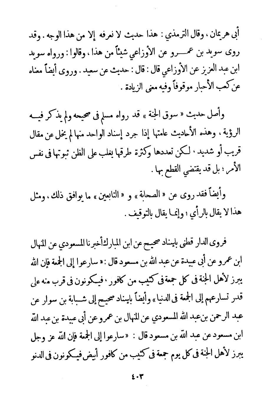 أَبِي هُرَيْرَةَ وَقَالَ التِّرْمِذِيُّ: هَذَا حَدِيثٌ لَا نَعْرِفُهُ إلَّا مِنْ هَذَا الْوَجْهِ. وَقَدْ رَوَى سويد بْنُ عَمْرٍو عَنْ الأوزاعي شَيْئًا مِنْ هَذَا وَقَالُوا: وَرَوَاهُ سويد بْنُ عَبْدِ الْعَزِيزِ عَنْ الأوزاعي قَالَ: قَالَ: حَدِيثٌ عَنْ سَعِيدٍ. وَرُوِيَ أَيْضًا مَعْنَاهُ عَنْ كَعْبِ الْأَحْبَارِ مَوْقُوفًا وَفِيهِ مَعْنَى الزِّيَادَةِ. وَأَصْلُ حَدِيثِ {سُوقِ الْجَنَّةِ} قَدْ رَوَاهُ مُسْلِمٌ فِي صَحِيحِهِ وَلَمْ يَذْكُرْ فِيهِ الرُّؤْيَةَ وَهَذِهِ الْأَحَادِيثُ عَامَّتُهَا إذَا جُرِّدَ إسْنَادُ الْوَاحِدِ مِنْهَا لَمْ يَخْلُ عَنْ مَقَالٍ قَرِيبٍ أَوْ شَدِيدٍ لَكِنَّ تَعَدُّدَهَا وَكَثْرَةَ طُرُقِهَا يُغَلِّبُ عَلَى الظَّنِّ ثُبُوتَهَا فِي نَفْسِ الْأَمْرِ؛ بَلْ قَدْ يَقْتَضِي الْقَطْعَ بِهَا. وَأَيْضًا فَقَدْ رُوِيَ عَنْ " الصَّحَابَةِ " وَ " التَّابِعِينَ " مَا يُوَافِقُ ذَلِكَ وَمِثْلُ هَذَا لَا يُقَالُ بِالرَّأْيِ؛ وَإِنَّمَا يُقَالُ بِالتَّوْقِيفِ. فَرَوَى الدارقطني بِإِسْنَادِ صَحِيحٍ عَنْ ابْنِ الْمُبَارَكِ أَخْبَرَنَا الْمَسْعُودِيُّ عَنْ الْمِنْهَالِ بْنِ عَمْرٍو عَنْ أَبِي عُبَيْدَةَ عَنْ عَبْدِ اللَّهِ بْنِ مَسْعُودٍ قَالَ: {سَارِعُوا إلَى الْجُمُعَةِ فَإِنَّ اللَّهَ يَبْرُزُ لِأَهْلِ الْجَنَّةِ فِي كُلِّ جُمُعَةٍ فِي كَثِيبٍ مِنْ كَافُورٍ فَيَكُونُونَ فِي قُرْبٍ مِنْهُ عَلَى قَدْرِ تَسَارُعِهِمْ إلَى الْجُمُعَةِ فِي الدُّنْيَا} وَأَيْضًا بِإِسْنَادِ صَحِيحٍ إلَى شَبَّابَةَ بْنِ سَوَّارٍ عَنْ عَبْدِ الرَّحْمَنِ بْنِ عَبْدِ اللَّهِ الْمَسْعُودِيِّ عَنْ الْمِنْهَالِ بْنِ عَمْرٍو عَنْ أَبِي عُبَيْدَةَ بْنِ عَبْدِ اللَّهِ بْنِ مَسْعُودٍ عَنْ عَبْدِ اللَّهِ بْنِ مَسْعُودٍ قَالَ: {سَارِعُوا إلَى الْجُمُعَةِ فَإِنَّ اللَّهَ عَزَّ وَجَلَّ يَبْرُزُ لِأَهْلِ الْجَنَّةِ فِي كُلِّ يَوْمِ جُمُعَةٍ فِي كَثِيبٍ مِنْ كَافُورٍ أَبْيَضَ فَيَكُونُونَ فِي الدُّنُوِّ