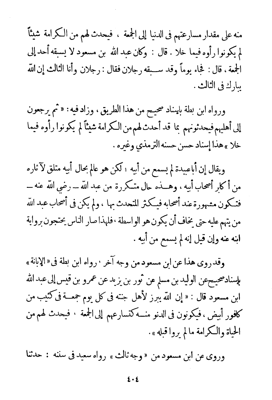 مِنْهُ عَلَى مِقْدَارِ مُسَارَعَتِهِمْ فِي الدُّنْيَا إلَى الْجُمُعَةِ فَيُحْدِثُ لَهُمْ مِنْ الْكَرَامَةِ شَيْئًا لَمْ يَكُونُوا رَأَوْهُ فِيمَا خَلَا.} قَالَ: وَكَانَ عَبْدُ اللَّهِ بْنُ مَسْعُودٍ لَا يَسْبِقُهُ أَحَدٌ إلَى الْجُمُعَةِ قَالَ: فَجَاءَ يَوْمًا وَقَدْ سَبَقَهُ رَجُلَانِ فَقَالَ: رَجُلَانِ وَأَنَا الثَّالِثُ إنَّ اللَّهَ يُبَارِكُ فِي الثَّالِثِ. وَرَوَاهُ ابْنُ بَطَّةَ بِإِسْنَادِ صَحِيحٍ مِنْ هَذَا الطَّرِيقِ وَزَادَ فِيهِ: {ثُمَّ يَرْجِعُونَ إلَى أَهْلِيهِمْ فَيُحَدِّثُونَهُمْ بِمَا قَدْ أَحْدَثَ لَهُمْ مِنْ الْكَرَامَةِ شَيْئًا لَمْ يَكُونُوا رَأَوْهُ فِيمَا خَلَا} هَذَا إسْنَادٌ حَسَنٌ حَسَّنَهُ التِّرْمِذِيُّ وَغَيْرُهُ. وَيُقَالُ إنَّ أَبَا عُبَيْدَةَ لَمْ يَسْمَعْ مِنْ أَبِيهِ؛ لَكِنْ هُوَ عَالِمٌ بِحَالِ أَبِيهِ مُتَلَقٍّ لِآثَارِهِ مَنْ أَكَابِرِ أَصْحَابِ أَبِيهِ وَهَذِهِ حَالٌ مُتَكَرِّرَةٌ مِنْ عَبْدِ اللَّهِ - رَضِيَ اللَّهُ عَنْهُ - فَتَكُونُ مَشْهُورَةً عِنْدَ أَصْحَابِهِ فَيَكْثُرُ الْمُتَحَدِّثُ بِهَا وَلَمْ يَكُنْ فِي أَصْحَابِ عَبْدِ اللَّهِ مَنْ يُتَّهَمُ عَلَيْهِ حَتَّى يَخَافَ أَنْ يَكُونَ هُوَ الْوَاسِطَةَ فَلِهَذَا صَارَ النَّاسُ يَحْتَجُّونَ بِرِوَايَةِ ابْنِهِ عَنْهُ وَإِنْ قِيلَ إنَّهُ لَمْ يَسْمَعْ مِنْ أَبِيهِ. وَقَدْ رُوِيَ هَذَا عَنْ ابْنِ مَسْعُودٍ مِنْ وَجْهٍ آخَرَ رَوَاهُ ابْنُ بَطَّةَ فِي " الْإِبَانَةِ " بِإِسْنَادِ صَحِيحٍ عَنْ الْوَلِيدِ بْنِ مُسْلِمٍ عَنْ ثَوْرِ بْنِ يَزِيدَ عَنْ عَمْرِو بْنِ قَيْسٍ إلَى عَبْدِ اللَّهِ بْنِ مَسْعُودٍ قَالَ: {إنَّ اللَّهَ يَبْرُزُ لِأَهْلِ جَنَّتِهِ فِي كُلِّ يَوْمِ جُمُعَةٍ فِي كَثِيبٍ مِنْ كَافُورٍ أَبْيَضَ فَيَكُونُونَ فِي الدُّنُوِّ مِنْهُ كَتَسَارُعِهِمْ إلَى الْجُمُعَةِ فَيُحْدِثُ لَهُمْ مِنْ الْحَيَاةِ وَالْكَرَامَةِ مَا لَمْ يَرَوْا قَبْلَهُ} . وَرُوِيَ عَنْ ابْنِ مَسْعُودٍ مِنْ " وَجْهٍ ثَالِثٍ " رَوَاهُ سَعِيدٌ فِي سُنَنِهِ: حَدَّثَنَا