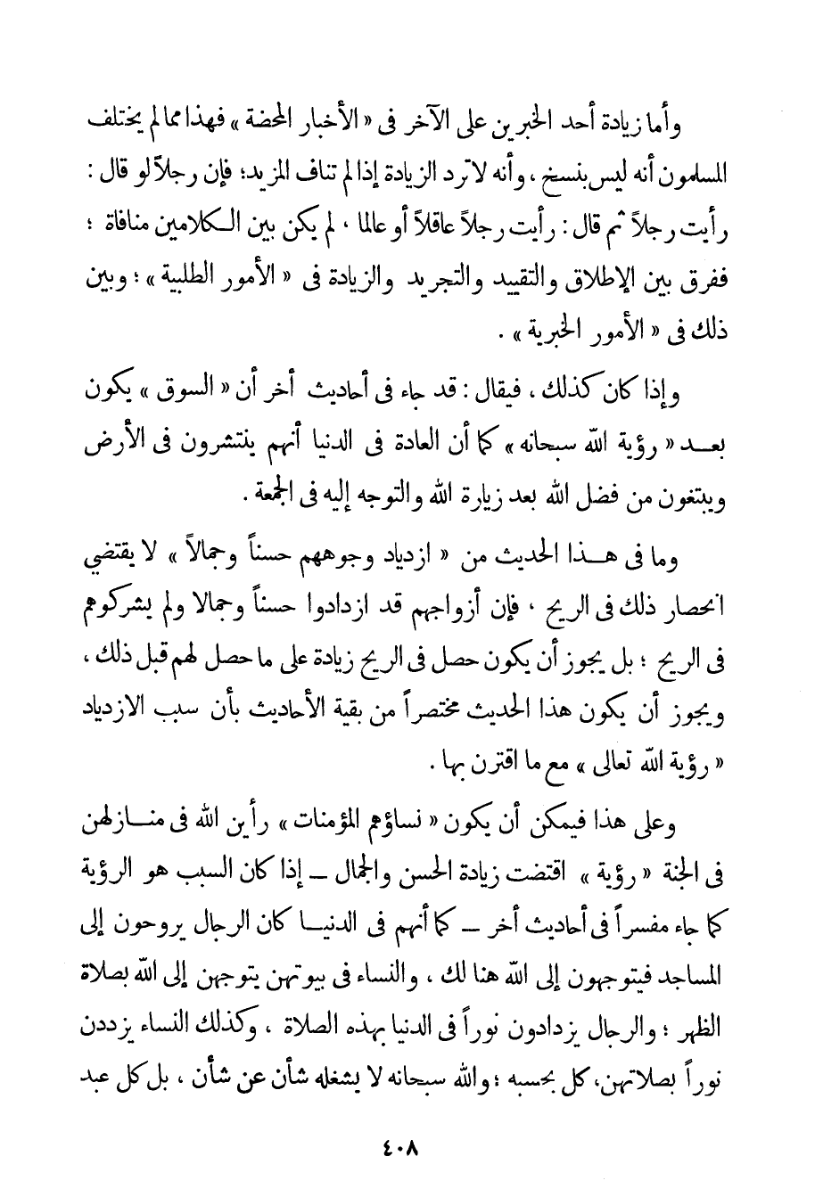 وَأَمَّا زِيَادَةُ أَحَدِ الْخَبَرَيْنِ عَلَى الْآخَرِ فِي " الْأَخْبَارِ الْمَحْضَةِ " فَهَذَا مِمَّا لَمْ يَخْتَلِفْ الْمُسْلِمُونَ أَنَّهُ لَيْسَ بِنَسْخٍ وَأَنَّهُ لَا تُرَدُّ الزِّيَادَةُ إذَا لَمْ تُنَافِ الْمَزِيدَ؛ فَإِنَّ رَجُلًا لَوْ قَالَ: رَأَيْت رَجُلًا ثُمَّ قَالَ: رَأَيْت رَجُلًا عَاقِلًا أَوْ عَالِمًا لَمْ يَكُنْ بَيْنَ الْكَلَامَيْنِ مُنَافَاةٌ؛ فَفُرِّقَ بَيْنَ الْإِطْلَاقِ وَالتَّقْيِيدِ وَالتَّجْرِيدِ وَالزِّيَادَةِ فِي " الْأُمُورِ الطَّلَبِيَّةِ "؛ وَبَيْنَ ذَلِكَ فِي " الْأُمُورِ الْخَبَرِيَّةِ ". وَإِذَا كَانَ كَذَلِكَ فَيُقَالُ: قَدْ جَاءَ فِي أَحَادِيثَ أُخَرَ أَنَّ " السُّوقَ " يَكُونُ بَعْدَ " رُؤْيَةِ اللَّهِ سُبْحَانَهُ " كَمَا أَنَّ الْعَادَةَ فِي الدُّنْيَا أَنَّهُمْ يَنْتَشِرُونَ فِي الْأَرْضِ وَيَبْتَغُونَ مِنْ فَضْلِ اللَّهِ بَعْدَ زِيَارَةِ اللَّهِ وَالتَّوَجُّهِ إلَيْهِ فِي الْجُمُعَةِ. وَمَا فِي هَذَا الْحَدِيثِ مِنْ " ازْدِيَادِ وُجُوهِهِمْ حُسْنًا وَجَمَالًا " لَا يَقْتَضِي انْحِصَارَ ذَلِكَ فِي الرِّيحِ فَإِنَّ أَزْوَاجَهُمْ قَدْ ازْدَادُوا حُسْنًا وَجَمَالًا وَلَمْ يَشْرَكُوهُمْ فِي الرِّيحِ؛ بَلْ يَجُوزُ أَنْ يَكُونَ حَصَلَ فِي الرِّيحِ زِيَادَةٌ عَلَى مَا حَصَلَ لَهُمْ قَبْلَ ذَلِكَ وَيَجُوزُ أَنْ يَكُونَ هَذَا الْحَدِيثُ مُخْتَصَرًا مِنْ بَقِيَّةِ الْأَحَادِيثِ بِأَنَّ سَبَبَ الِازْدِيَادِ " رُؤْيَةُ اللَّهِ تَعَالَى " مَعَ مَا اقْتَرَنَ بِهَا. وَعَلَى هَذَا فَيُمْكِنُ أَنْ يَكُونَ " نِسَاؤُهُمْ الْمُؤْمِنَاتُ " رَأَيْنَ اللَّهَ فِي مَنَازِلِهِنَّ فِي الْجَنَّةِ " رُؤْيَةً " اقْتَضَتْ زِيَادَةَ الْحُسْنِ وَالْجَمَالِ - إذَا كَانَ السَّبَبُ هُوَ الرُّؤْيَةَ كَمَا جَاءَ مُفَسَّرًا فِي أَحَادِيثَ أُخَرَ - كَمَا أَنَّهُمْ فِي الدُّنْيَا كَانَ الرِّجَالُ يَرُوحُونَ إلَى الْمَسَاجِدِ فَيَتَوَجَّهُونَ إلَى اللَّهِ هُنَالِكَ وَالنِّسَاءُ فِي بُيُوتِهِنَّ يَتَوَجَّهْنَ إلَى اللَّهِ بِصَلَاةِ الظُّهْرِ؛ وَالرِّجَالُ يَزْدَادُونَ نُورًا فِي الدُّنْيَا بِهَذِهِ الصَّلَاةِ وَكَذَلِكَ النِّسَاءُ يَزْدَدْنَ نُورًا بِصَلَاتِهِنَّ كَلٌّ بِحَسَبِهِ؛ وَاَللَّهُ سُبْحَانَهُ لَا يَشْغَلُهُ شَأْنٌ عَنْ شَأْنٍ بَلْ كُلُّ عَبْدٍ