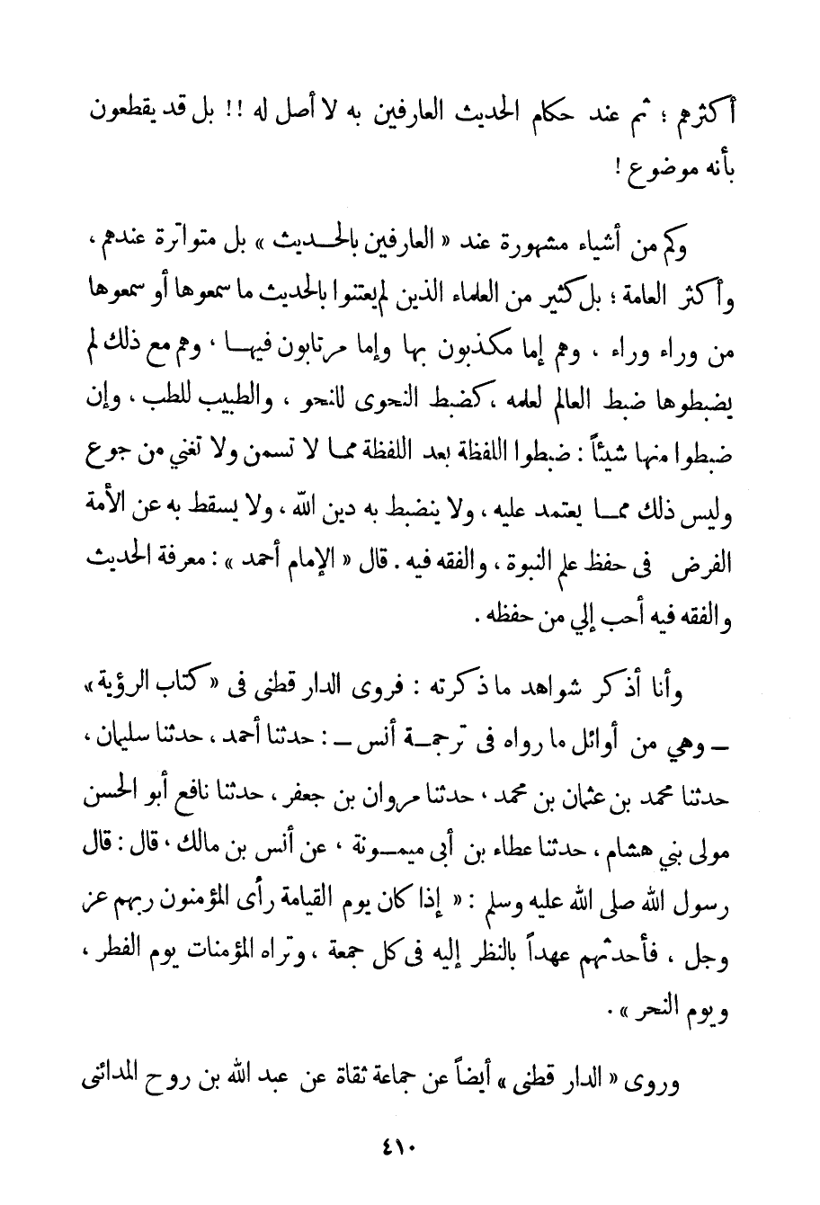 أَكْثَرِهِمْ؛ ثُمَّ عِنْدَ حُكَّامِ الْحَدِيثِ الْعَارِفِينَ بِهِ لَا أَصْلَ لَهُ بَلْ قَدْ يَقْطَعُونَ بِأَنَّهُ مَوْضُوعٌ وَكَمْ مِنْ أَشْيَاءَ مَشْهُورَةٍ عِنْدَ " الْعَارِفِينَ بِالْحَدِيثِ " بَلْ مُتَوَاتِرَةٍ عِنْدَهُمْ وَأَكْثَرُ الْعَامَّةِ؛ بَلْ كَثِيرٌ مِنْ الْعُلَمَاءِ الَّذِينَ لَمْ يَعْتَنُوا بِالْحَدِيثِ مَا سَمِعُوهَا أَوْ سَمِعُوهَا مِنْ وَرَاءِ وَرَاءَ وَهُمْ إمَّا مُكَذِّبُونَ بِهَا وَإِمَّا مُرْتَابُونَ فِيهَا وَهُمْ مَعَ ذَلِكَ لَمْ يَضْبِطُوهَا ضَبْطَ الْعَالِمِ لِعِلْمِهِ كَضَبْطِ النَّحْوِيِّ لِلنَّحْوِ وَالطَّبِيبِ لِلطِّبِّ وَإِنْ ضَبَطُوا مِنْهَا شَيْئًا: ضَبَطُوا اللَّفْظَةَ بَعْدَ اللَّفْظَةِ مِمَّا لَا تُسْمِنُ وَلَا تُغْنِي مِنْ جُوعٍ وَلَيْسَ ذَلِكَ مِمَّا يُعْتَمَدُ عَلَيْهِ وَلَا يَنْضَبِطُ بِهِ دِينُ اللَّهِ وَلَا يَسْقُطُ بِهِ عَنْ الْأُمَّةِ الْفَرْضُ فِي حِفْظِ عِلْمِ النُّبُوَّةِ وَالْفِقْهِ فِيهِ. قَالَ " الْإِمَامُ أَحْمَد ": مَعْرِفَةُ الْحَدِيثِ وَالْفِقْهِ فِيهِ أَحَبُّ إلَيَّ مِنْ حِفْظِهِ. وَأَنَا أَذْكُرُ شَوَاهِدَ مَا ذَكَرْته: فَرَوَى الدارقطني فِي " كِتَابِ الرُّؤْيَةِ " - وَهِيَ مِنْ أَوَائِلِ مَا رَوَاهُ فِي تَرْجَمَةِ أَنَسٍ -: حَدَّثَنَا أَحْمَد حَدَّثَنَا سُلَيْمَانُ حَدَّثَنَا مُحَمَّدُ بْنُ عُثْمَانَ بْنِ مُحَمَّدٍ حَدَّثَنَا مَرْوَانُ بْنُ جَعْفَرٍ حَدَّثَنَا نَافِعٌ أَبُو الْحَسَنِ مَوْلَى بَنِي هِشَامٍ حَدَّثَنَا عَطَاءُ بْنُ أَبِي مَيْمُونَةَ عَنْ أَنَسِ بْنِ مَالِكٍ قَالَ: {قَالَ رَسُولُ اللَّهِ صَلَّى اللَّهُ عَلَيْهِ وَسَلَّمَ إذَا كَانَ يَوْمُ الْقِيَامَةِ رَأَى الْمُؤْمِنُونَ رَبَّهُمْ عَزَّ وَجَلَّ فَأَحْدَثُهُمْ عَهْدًا بِالنَّظَرِ إلَيْهِ فِي كُلِّ جُمُعَةٍ وَتَرَاهُ الْمُؤْمِنَاتُ يَوْمَ الْفِطْرِ وَيَوْمَ النَّحْرِ} . وَرَوَى " الدارقطني " أَيْضًا عَنْ جَمَاعَةٍ ثِقَاتٍ عَنْ عَبْدِ اللَّهِ بْنِ رَوْحٍ الْمَدَائِنِيِّ