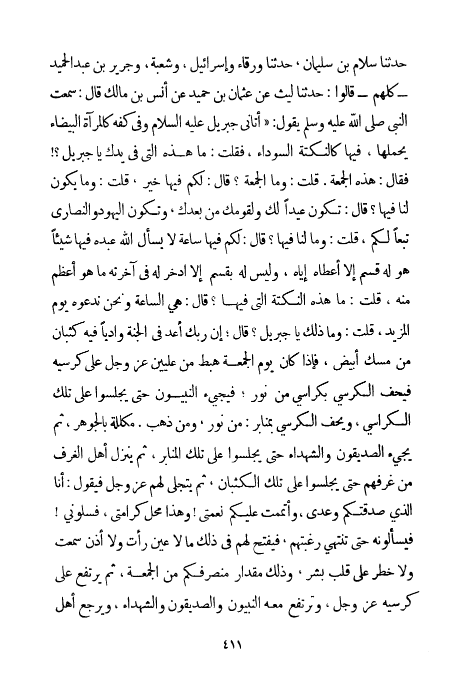 حَدَّثَنَا سلام بْنُ سُلَيْمَانَ حَدَّثَنَا وَرْقَاءُ وَإِسْرَائِيلُ وَشُعْبَةُ وَجَرِيرُ بْنُ عَبْدِ الْحَمِيدِ - كُلُّهُمْ - قَالُوا: حَدَّثَنَا لَيْثٌ عَنْ عُثْمَانَ بْنِ حميد عَنْ {أَنَسِ بْنِ مَالِكٍ قَالَ: سَمِعْت النَّبِيَّ صَلَّى اللَّهُ عَلَيْهِ وَسَلَّمَ يَقُولُ: أَتَانِي جِبْرِيلُ عَلَيْهِ السَّلَامُ وَفِي كَفِّهِ كَالْمِرْآةِ الْبَيْضَاءِ يَحْمِلُهَا فِيهَا كَالنُّكْتَةِ السَّوْدَاءِ فَقُلْت: مَا هَذِهِ الَّتِي فِي يَدِك يَا جِبْرِيلُ فَقَالَ: هَذِهِ الْجُمُعَةُ. قُلْت: وَمَا الْجُمُعَةُ؟ قَالَ: لَكُمْ فِيهَا خَيْرٌ قُلْت: وَمَا يَكُونُ لَنَا فِيهَا؟ قَالَ: تَكُونُ عِيدًا لَك وَلِقَوْمِك مِنْ بَعْدِك وَتَكُونُ الْيَهُودُ وَالنَّصَارَى تَبَعًا لَكُمْ قُلْت: وَمَا لَنَا فِيهَا؟ قَالَ لَكُمْ فِيهَا سَاعَةٌ لَا يَسْأَلُ اللَّهَ عَبْدُهُ فِيهَا شَيْئًا هُوَ لَهُ قَسْمٌ إلَّا أَعْطَاهُ إيَّاهُ وَلَيْسَ لَهُ بِقَسْمٍ إلَّا ادَّخَرَ لَهُ فِي آخِرَتِهِ مَا هُوَ أَعْظَم مِنْهُ قُلْت: مَا هَذِهِ النُّكْتَةُ الَّتِي فِيهَا؟ قَالَ: هِيَ السَّاعَةُ وَنَحْنُ نَدْعُوهُ يَوْمَ الْمَزِيدِ قُلْت: وَمَا ذَلِكَ يَا جِبْرِيلُ؟ قَالَ؛ إنَّ رَبَّك أَعَدَّ فِي الْجَنَّةِ وَادِيًا فِيهِ كُثْبَانٌ مِنْ مِسْكٍ أَبْيَضَ فَإِذَا كَانَ يَوْمُ الْجُمُعَةِ هَبَطَ مِنْ عِلِّيِّينَ عَزَّ وَجَلَّ عَلَى كُرْسِيِّهِ فَيُحَفُّ الْكُرْسِيُّ بِكَرَاسِيّ مِنْ نُورٍ؛ فَيَجِيءُ النَّبِيُّونَ حَتَّى يَجْلِسُوا عَلَى تِلْكَ الْكَرَاسِيِّ وَيُحَفُّ الْكُرْسِيُّ بِمَنَابِرَ: مِنْ نُورٍ وَمِنْ ذَهَبٍ. مُكَلَّلَةٍ بِالْجَوْهَرِ ثُمَّ يَجِيءُ الصِّدِّيقُونَ وَالشُّهَدَاءُ حَتَّى يَجْلِسُوا عَلَى تِلْكَ الْمَنَابِرِ ثُمَّ يَنْزِلُ أَهْلُ الْغُرَفِ مِنْ غُرَفِهِمْ حَتَّى يَجْلِسُوا عَلَى تِلْكَ الْكُثْبَانِ ثُمَّ يَتَجَلَّى لَهُمْ عَزَّ وَجَلَّ فَيَقُولُ: أَنَا الَّذِي صَدَقْتُكُمْ وَعْدِي وَأَتْمَمْت عَلَيْكُمْ نِعْمَتِي وَهَذَا مَحَلُّ كَرَامَتِي فَسَلُونِي فَيَسْأَلُونَهُ حَتَّى تَنْتَهِيَ رَغْبَتُهُمْ فَيَفْتَحُ لَهُمْ فِي ذَلِكَ مَا لَا عَيْنٌ رَأَتْ وَلَا أُذُنٌ سَمِعَتْ وَلَا خَطَرَ عَلَى قَلْبِ بَشَرٍ وَذَلِكَ مِقْدَارُ مُنْصَرَفِكُمْ مِنْ الْجُمُعَةِ ثُمَّ يَرْتَفِعُ عَلَى كُرْسِيِّهِ عَزَّ وَجَلَّ وَتَرْتَفِعُ مَعَهُ النَّبِيُّونَ وَالصِّدِّيقُونَ وَالشُّهَدَاءُ وَيَرْجِعُ أَهْلُ