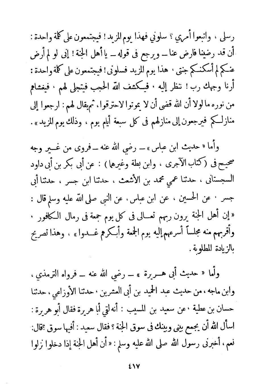 رُسُلِي وَاتَّبَعُوا أَمْرِي؟ سَلُونِي فَهَذَا يَوْمُ الْمَزِيدِ فَيَجْتَمِعُونَ عَلَى كَلِمَةٍ وَاحِدَةٍ: أَنْ قَدْ رَضِينَا فَارْضَ عَنَّا - وَيَرْجِعُ فِي قَوْلِهِ - يَا أَهْلَ الْجَنَّةِ إنِّي لَوْ لَمْ أَرْضَ عَنْكُمْ لَمْ أُسْكِنْكُمْ جَنَّتِي هَذَا يَوْمُ الْمَزِيدِ فَسَلُونِي فَيَجْتَمِعُونَ عَلَى كَلِمَةٍ وَاحِدَةٍ: أَرِنَا وَجْهَك رَبُّ نَنْظُرْ إلَيْهِ فَيَكْشِفُ اللَّهُ الْحُجُبَ فَيَتَجَلَّى لَهُمْ فَيَغْشَاهُمْ مِنْ نُورِهِ مَا لَوْلَا أَنَّ اللَّهَ قَضَى أَنْ لَا يَمُوتُوا لَاحْتَرَقُوا ثُمَّ يُقَالُ لَهُمْ: ارْجِعُوا إلَى مَنَازِلِكُمْ فَيَرْجِعُونَ إلَى مَنَازِلِهِمْ فِي كُلِّ سَبْعَةِ أَيَّامٍ يَوْمٌ وَذَلِكَ يَوْمُ الْمَزِيدِ} . وَأَمَّا " حَدِيثُ ابْنِ عَبَّاسٍ " - رَضِيَ اللَّهُ عَنْهُ - فَرُوِيَ مِنْ غَيْرِ وَجْهٍ صَحِيحٍ فِي (كِتَابِ الآجري) وَابْنِ بَطَّةَ وَغَيْرِهِمَا: عَنْ أَبِي بَكْرِ بْنِ أَبِي دَاوُد السجستاني حَدَّثَنَا عَمِّي مُحَمَّدُ بْنُ الْأَشْعَثِ حَدَّثَنَا ابْنُ جِسْرٍ حَدَّثَنَا أَبِي جِسْرٌ عَنْ الْحُسَيْنِ عَنْ ابْنِ عَبَّاسٍ عَنْ {النَّبِيِّ صَلَّى اللَّهُ عَلَيْهِ وَسَلَّمَ قَالَ: إنَّ أَهْلَ الْجَنَّةِ يَرَوْنَ رَبَّهُمْ تَعَالَى فِي كُلِّ يَوْمِ جُمُعَةٍ فِي رِمَالِ الْكَافُورِ وَأَقْرَبُهُمْ مِنْهُ مَجْلِسًا أَسْرَعُهُمْ إلَيْهِ يَوْمَ الْجُمُعَةِ وَأَبْكَرُهُمْ غُدُوًّا} وَهَذَا تَصْرِيحٌ بِالزِّيَادَةِ الْمَطْلُوبَةِ. وَأَمَّا " حَدِيثُ أَبِي هُرَيْرَةَ " - رَضِيَ اللَّهُ عَنْهُ - فَرَوَاهُ التِّرْمِذِيُّ وَابْنُ مَاجَه مِنْ حَدِيثِ عَبْدِ الْحَمِيدِ بْنِ أَبِي الْعِشْرِينَ حَدَّثَنَا الأوزاعي حَدَّثَنَا حَسَّانُ بْنُ عَطِيَّةَ عَنْ {سَعِيدِ بْنِ الْمُسَيِّبِ: أَنَّهُ لَقِيَ أَبَا هُرَيْرَةَ فَقَالَ أَبُو هُرَيْرَةَ: أَسْأَلُ اللَّهَ أَنْ يَجْمَعَ بَيْنِي وَبَيْنَك فِي سُوقِ الْجَنَّةِ؟ فَقَالَ سَعِيدٌ: أَفِيهَا سُوقٌ؟ قَالَ: نَعَمْ أَخْبَرَنِي رَسُولُ اللَّهِ صَلَّى اللَّهُ عَلَيْهِ وَسَلَّمَ أَنَّ أَهْلَ الْجَنَّةِ إذَا دَخَلُوا نَزَلُوا