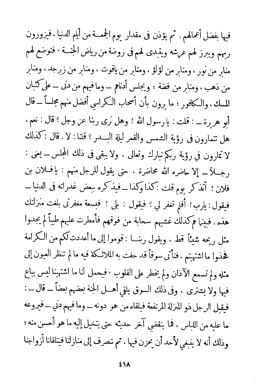 فِيهَا بِفَضْلِ أَعْمَالِهِمْ ثُمَّ يُؤْذَنُ فِي مِقْدَارِ يَوْمِ الْجُمُعَةِ مِنْ أَيَّامِ الدُّنْيَا فَيَزُورُونَ رَبَّهُمْ وَيُبْرِزُ لَهُمْ عَرْشَهُ وَيَتَبَدَّى لَهُمْ فِي رَوْضَةٍ مِنْ رِيَاضِ الْجَنَّةِ فَتُوضَعُ لَهُمْ مَنَابِرُ مِنْ نُورٍ وَمَنَابِرُ مِنْ لُؤْلُؤٍ وَمَنَابِرُ مِنْ يَاقُوتٍ وَمَنَابِرُ مِنْ زَبَرْجَدٍ وَمَنَابِرُ مَنْ ذَهَبٍ وَمَنَابِرُ مِنْ فِضَّةٍ؛ وَيَجْلِسُ أَدْنَاهُمْ - وَمَا فِيهِمْ مَنْ دَنِيٍّ - عَلَى كُثْبَانِ الْمِسْكِ وَالْكَافُورِ؛ مَا يَرَوْنَ بِأَنَّ أَصْحَابَ الْكَرَاسِيِّ أَفْضَلُ مِنْهُمْ مَجْلِسًا - قَالَ أَبُو هُرَيْرَةَ -: قُلْت: يَا رَسُولَ اللَّهِ وَهَلْ نَرَى رَبَّنَا عَزَّ وَجَلَّ؟ قَالَ: نَعَمْ هَلْ تَتَمَارَوْنَ فِي رُؤْيَةِ الشَّمْسِ وَالْقَمَرِ لَيْلَةَ الْبَدْرِ؟ قُلْنَا: لَا. قَالَ: كَذَلِكَ لَا تُمَارُونَ فِي رُؤْيَةِ رَبِّكُمْ تَبَارَكَ وَتَعَالَى وَلَا يَبْقَى فِي ذَلِكَ الْمَجْلِسِ - يَعْنِي: رَجُلًا - إلَّا حَاضَرَهُ اللَّهُ مُحَاضَرَةً حَتَّى يَقُولَ لِلرَّجُلِ مِنْهُمْ: يَا فُلَانُ بْنَ فُلَانٍ أَتَذْكُرُ يَوْمَ قُلْت: كَذَا وَكَذَا - فَيُذَكِّرُهُ بِبَعْضِ غَدَرَاتِهِ فِي الدُّنْيَا - فَيَقُولُ: يَا رَبِّ؟ أَفَلَمْ تَغْفِرْ لِي؟ فَيَقُولُ: بَلَى فَبِسَعَةِ مَغْفِرَتِي بَلَغْت مَنْزِلَتَك هَذِهِ. فَبَيْنَمَا هُمْ كَذَلِكَ غَشِيَهُمْ سَحَابَةٌ مِنْ فَوْقِهِمْ فَأَمْطَرَتْ عَلَيْهِمْ طِيبًا لَمْ يَجِدُوا مِثْلَ رِيحِهِ شَيْئًا قَطُّ وَيَقُول رَبُّنَا: قُومُوا إلَى مَا أَعْدَدْت لَكُمْ مِنْ الْكَرَامَةِ فَخُذُوا مَا اشْتَهَيْتُمْ فَنَأْتِي سُوقًا قَدْ حَفَّتْ بِهِ الْمَلَائِكَةُ فِيهِ مَا لَمْ تَنْظُرْ الْعُيُونُ إلَى مِثْلِهِ وَلَمْ تَسْمَعْ الْآذَانُ وَلَمْ يَخْطُرْ عَلَى الْقُلُوبِ فَيَحْمِلُ لَنَا مَا اشْتَهَيْنَا لَيْسَ يُبَاعُ فِيهَا وَلَا يُشْتَرَى وَفِي ذَلِكَ السُّوقِ يَلْقَى أَهْلُ الْجَنَّةِ بَعْضُهُمْ بَعْضًا - قَالَ -: فَيُقْبِلُ الرَّجُلُ ذُو الْمَنْزِلَةِ الْمُرْتَفِعَةِ فَيَلْقَاهُ مَنْ هُوَ دُونَهُ - وَمَا فِيهِمْ دَنِيٌّ - فَيَرُوعُهُ مَا عَلَيْهِ مِنْ اللِّبَاسِ فَمَا يَنْقَضِي آخِرُ حَدِيثِهِ حَتَّى يَتَخَيَّلَ إلَيْهِ مَا هُوَ أَحْسَنُ مِنْهُ؛ وَذَلِكَ أَنَّهُ لَا يَنْبَغِي لِأَحَدِ أَنْ يَحْزَنَ فِيهَا ثُمَّ نَنْصَرِفُ إلَى مَنَازِلِنَا فَيَتَلَقَّانَا أَزْوَاجُنَا