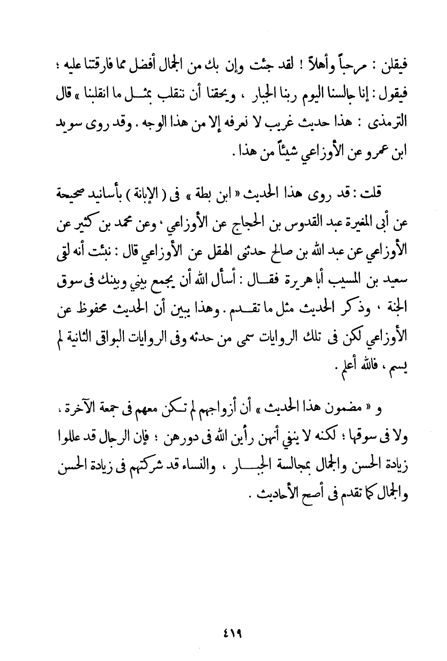 فَيَقُلْنَ: مَرْحَبًا وَأَهْلًا لَقَدْ جِئْت وَإِنَّ بِك مِنْ الْجَمَالِ أَفْضَلَ مِمَّا فَارَقْتنَا عَلَيْهِ؛ فَيَقُولُ: إنَّا جَالَسْنَا الْيَوْمَ رَبَّنَا الْجَبَّارَ وَيَحِقُّنَا أَنْ نَنْقَلِبَ بِمِثْلِ مَا انْقَلَبْنَا} قَالَ التِّرْمِذِيُّ: هَذَا حَدِيثٌ غَرِيبٌ لَا نَعْرِفُهُ إلَّا مِنْ هَذَا الْوَجْهِ. وَقَدْ رَوَى سويد بْنُ عَمْرٍو عَنْ الأوزاعي شَيْئًا مِنْ هَذَا. قُلْت: قَدْ رَوَى هَذَا الْحَدِيثَ " ابْنُ بَطَّةَ " فِي (الْإِبَانَةِ) بِأَسَانِيدَ صَحِيحَةٍ عَنْ أَبِي الْمُغِيرَةِ عَبْدِ الْقُدُّوسِ بْنِ الْحَجَّاجِ عَنْ الأوزاعي وَعَنْ مُحَمَّدِ بْنِ كَثِيرٍ عَنْ الأوزاعي عَنْ عَبْدِ اللَّهِ بْنِ صَالِحٍ حَدَّثَنِي الْهِقْلُ عَنْ الأوزاعي قَالَ: نُبِّئْت أَنَّهُ لَقِيَ سَعِيدُ بْنُ الْمُسَيِّبِ أَبَا هُرَيْرَةَ فَقَالَ: أَسْأَلُ اللَّهَ أَنْ يَجْمَعَ بَيْنِي وَبَيْنَك فِي سُوقِ الْجَنَّةِ وَذَكَرَ الْحَدِيثَ مِثْلَ مَا تَقَدَّمَ. وَهَذَا يُبَيِّنُ أَنَّ الْحَدِيثَ مَحْفُوظٌ عَنْ الأوزاعي لَكِنْ فِي تِلْكَ الرِّوَايَاتِ سَمَّى مَنْ حَدَّثَهُ وَفِي الرِّوَايَاتِ الْبَوَاقِي الثَّانِيَةِ لَمْ يُسَمِّ فَاَللَّهُ أَعْلَمُ. وَ " مَضْمُونُ هَذَا الْحَدِيثِ " أَنَّ أَزْوَاجَهُمْ لَمْ تَكُنْ مَعَهُمْ فِي جُمُعَةِ الْآخِرَةِ وَلَا فِي سُوقِهَا؛ لَكِنَّهُ لَا يَنْفِي أَنَّهُنَّ رَأَيْنَ اللَّهَ فِي دُورِهِنَّ؛ فَإِنَّ الرِّجَالَ قَدْ عَلَّلُوا زِيَادَةَ الْحُسْنِ وَالْجَمَالِ بِمُجَالَسَةِ الْجَبَّارِ وَالنِّسَاءُ قَدْ شَرِكَتْهُمْ فِي زِيَادَةِ الْحُسْنِ وَالْجَمَالِ كَمَا تَقَدَّمَ فِي أَصَحِّ الْأَحَادِيثِ.