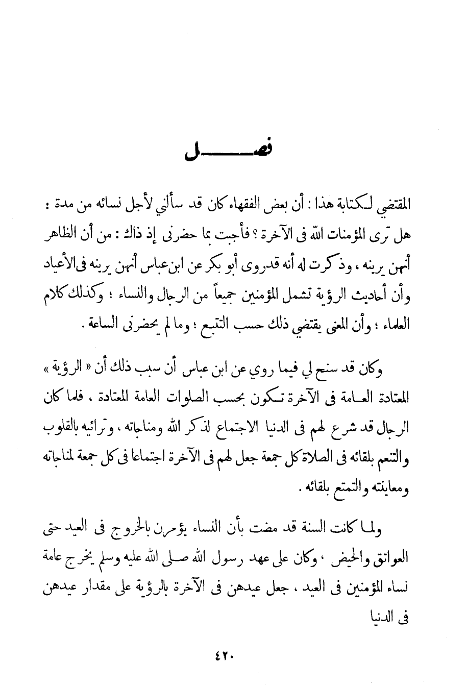 فَأَجَبْت بِمَا حَضَرَنِي إذْ ذَاكَ: مِنْ أَنَّ الظَّاهِرَ أَنَّهُنَّ يَرَيْنَهُ وَذَكَرْت لَهُ أَنَّهُ قَدْ رَوَى أَبُو بَكْرٍ عَنْ ابْنِ عَبَّاسٍ أَنَّهُنَّ يَرَيْنَهُ فِي الْأَعْيَادِ وَأَنَّ أَحَادِيثَ الرُّؤْيَةِ تَشْمَلُ الْمُؤْمِنِينَ جَمِيعًا مِنْ الرِّجَالِ وَالنِّسَاءِ وَكَذَلِكَ كَلَامُ الْعُلَمَاءِ؛ وَأَنَّ الْمَعْنَى يَقْتَضِي ذَلِكَ حَسَبَ التَّتَبُّعِ؛ وَمَا لَمْ يَحْضُرْنِي السَّاعَةَ. وَكَانَ قَدْ سَنَحَ لِي فِيمَا رُوِيَ عَنْ ابْنِ عَبَّاسٍ أَنَّ سَبَبَ ذَلِكَ أَنَّ " الرُّؤْيَةَ " الْمُعْتَادَةَ الْعَامَّةَ فِي الْآخِرَةِ تَكُونُ بِحَسَبِ الصَّلَوَاتِ الْعَامَّةِ الْمُعْتَادَةِ فَلَمَّا كَانَ الرِّجَالُ قَدْ شُرِعَ لَهُمْ فِي الدُّنْيَا الِاجْتِمَاعُ لِذِكْرِ اللَّهِ وَمُنَاجَاتِهِ وَتَرَائِيِهِ بِالْقُلُوبِ وَالتَّنَعُّمِ بِلِقَائِهِ فِي الصَّلَاةِ كُلَّ جُمُعَةٍ جَعَلَ لَهُمْ فِي الْآخِرَةِ اجْتِمَاعًا فِي كُلِّ جُمُعَةٍ لِمُنَاجَاتِهِ وَمُعَايَنَتِهِ وَالتَّمَتُّعِ بِلِقَائِهِ. وَلَمَّا كَانَتْ السُّنَّةُ قَدْ مَضَتْ بِأَنَّ النِّسَاءَ يُؤْمَرْنَ بِالْخُرُوجِ فِي الْعِيدِ حَتَّى الْعَوَاتِقَ وَالْحُيَّضَ وَكَانَ عَلَى عَهْدِ رَسُولِ اللَّهِ صَلَّى اللَّهُ عَلَيْهِ وَسَلَّمَ يَخْرُجُ عَامَّةُ نِسَاءِ الْمُؤْمِنِينَ فِي الْعِيدِ جُعِلَ عِيدُهُنَّ فِي الْآخِرَةِ بِالرُّؤْيَةِ عَلَى مِقْدَارِ عِيدِهِنَّ فِي الدُّنْيَا.