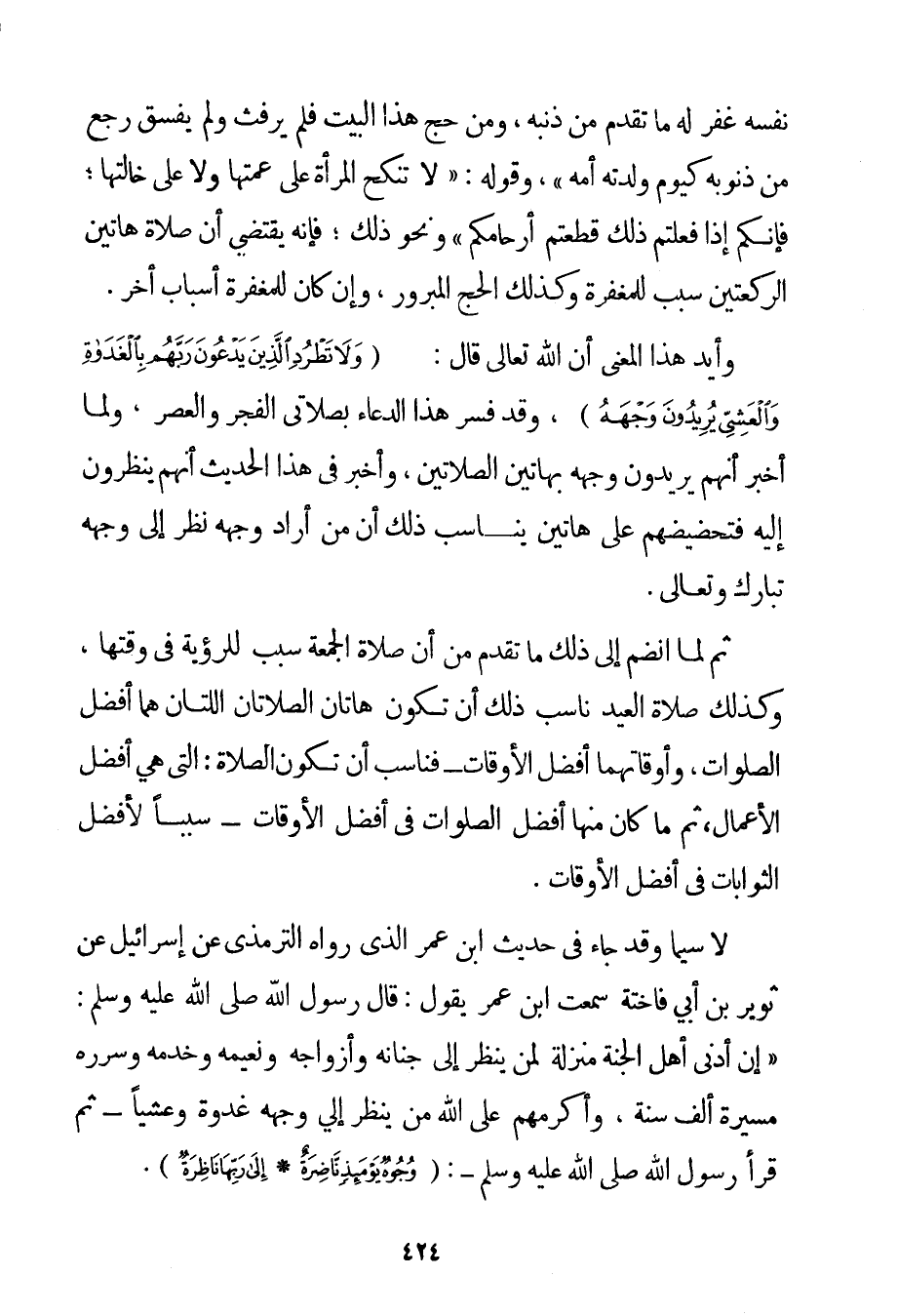 نَفْسَهُ غُفِرَ لَهُ مَا تَقَدَّمَ مِنْ ذَنْبِهِ وَمَنْ حَجَّ هَذَا الْبَيْتَ فَلَمْ يَرْفُثْ وَلَمْ يَفْسُقْ رَجَعَ مِنْ ذُنُوبِهِ كَيَوْمِ وَلَدَتْهُ أُمُّهُ} وَقَوْلِهِ: {لَا تُنْكَحُ الْمَرْأَةُ عَلَى عَمَّتِهَا وَلَا عَلَى خَالَتِهَا؛ فَإِنَّكُمْ إذَا فَعَلْتُمْ ذَلِكَ قَطَّعْتُمْ أَرْحَامَكُمْ} وَنَحْوِ ذَلِكَ؛ فَإِنَّهُ يَقْتَضِي أَنَّ صَلَاةَ هَاتَيْنِ الرَّكْعَتَيْنِ سَبَبٌ لِلْمَغْفِرَةِ وَكَذَلِكَ الْحَجُّ الْمَبْرُورُ وَإِنْ كَانَ لِلْمَغْفِرَةِ أَسْبَابٌ أُخَرُ. وَأَيَّدَ هَذَا الْمَعْنَى أَنَّ اللَّهَ تَعَالَى قَالَ: {وَلَا تَطْرُدِ الَّذِينَ يَدْعُونَ رَبَّهُمْ بِالْغَدَاةِ وَالْعَشِيِّ يُرِيدُونَ وَجْهَهُ} وَقَدْ فُسِّرَ هَذَا الدُّعَاءُ بِصَلَاتَيْ الْفَجْرِ وَالْعَصْرِ وَلِمَا أَخْبَرَ أَنَّهُمْ يُرِيدُونَ وَجْهَهُ بِهَاتَيْنِ الصَّلَاتَيْنِ وَأَخْبَرَ فِي هَذَا الْحَدِيثِ أَنَّهُمْ يَنْظُرُونَ إلَيْهِ فَتَحْضِيضُهُمْ عَلَى هَاتَيْنِ يُنَاسِبُ ذَلِكَ أَنَّ مَنْ أَرَادَ وَجْهَهُ نَظَرَ إلَى وَجْهِهِ تَبَارَكَ وَتَعَالَى. ثُمَّ لَمَّا انْضَمَّ إلَى ذَلِكَ مَا تَقَدَّمَ مِنْ أَنَّ صَلَاةَ الْجُمُعَةِ سَبَبٌ لِلرُّؤْيَةِ فِي وَقْتِهَا وَكَذَلِكَ صَلَاةُ الْعِيدِ نَاسَبَ ذَلِكَ أَنْ تَكُونَ هَاتَانِ الصَّلَاتَانِ اللَّتَانِ هُمَا أَفْضَلُ الصَّلَوَاتِ وَأَوْقَاتُهُمَا أَفْضَلُ الْأَوْقَاتِ فَنَاسَبَ أَنْ تَكُونَ الصَّلَاةُ: الَّتِي هِيَ أَفْضَلُ الْأَعْمَالِ ثُمَّ مَا كَانَ مِنْهَا أَفْضَلَ الصَّلَوَاتِ فِي أَفْضَلِ الْأَوْقَاتِ سَبَبًا لِأَفْضَلِ الثَّوَابَاتِ فِي أَفْضَلِ الْأَوْقَاتِ.