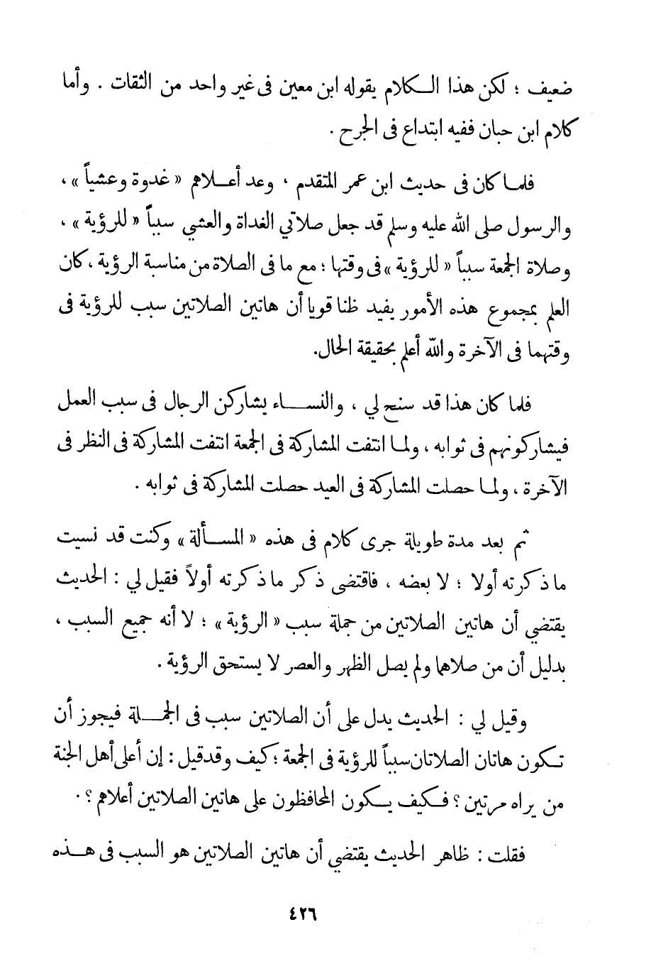 ضَعِيفٌ؛ لَكِنَّ هَذَا الْكَلَامَ يَقُولُهُ ابْنُ مَعِينٍ فِي غَيْرِ وَاحِدٍ مِنْ الثِّقَاتِ. وَأَمَّا كَلَامُ ابْنِ حِبَّانَ فَفِيهِ ابْتِدَاعٌ فِي الْجَرْحِ. فَلَمَّا كَانَ فِي حَدِيثِ ابْنِ عُمَرَ الْمُتَقَدِّمِ وَعْدُ أَعْلَاهُمْ " غُدْوَةً وَعَشِيًّا " وَالرَّسُولُ صَلَّى اللَّهُ عَلَيْهِ وَسَلَّمَ قَدّ جَعَلَ صَلَاتَيْ الْغَدَاةِ وَالْعَشِيِّ سَبَبًا " لِلرُّؤْيَةِ " وَصَلَاةَ الْجُمُعَةِ سَبَبًا " لِلرُّؤْيَةِ " فِي وَقْتِهَا؛ مَعَ مَا فِي الصَّلَاةِ مِنْ مُنَاسَبَةِ الرُّؤْيَةِ كَانَ الْعِلْمُ بِمَجْمُوعِ هَذِهِ الْأُمُورِ يُفِيدُ ظَنًّا قَوِيًّا أَنَّ هَاتَيْنِ الصَّلَاتَيْنِ سَبَبٌ لِلرُّؤْيَةِ فِي وَقْتِهِمَا فِي الْآخِرَةِ وَاَللَّهُ أَعْلَمُ بِحَقِيقَةِ الْحَالِ. فَلَمَّا كَانَ هَذَا قَدْ سَنَحَ لِي وَالنِّسَاءُ يُشَارِكْنَ الرِّجَالَ فِي سَبَبِ الْعَمَلِ فَيُشَارِكُونَهُمْ فِي ثَوَابِهِ وَلَمَّا انْتَفَتْ الْمُشَارَكَةُ فِي الْجُمُعَةِ انْتَفَتْ الْمُشَارَكَةُ فِي النَّظَرِ فِي الْآخِرَةِ وَلَمَّا حَصَلَتْ الْمُشَارَكَةُ فِي الْعِيدِ حَصَلَتْ الْمُشَارَكَةُ فِي ثَوَابِهِ. ثُمَّ بَعْدَ مُدَّةٍ طَوِيلَةٍ جَرَى كَلَامٌ فِي هَذِهِ " الْمَسْأَلَةِ " وَكُنْت قَدْ نَسِيت مَا ذَكَرْته أَوَّلًا؛ لَا بَعْضَهُ فَاقْتَضَى ذِكْرَ مَا ذَكَرْته أَوَّلًا فَقِيلَ لِي: الْحَدِيثُ يَقْتَضِي أَنَّ هَاتَيْنِ الصَّلَاتَيْنِ مِنْ جُمْلَةِ سَبَبِ " الرُّؤْيَةِ "؛ لَا أَنَّهُ جَمِيعُ السَّبَبِ بِدَلِيلِ أَنَّ مَنْ صَلَّاهُمَا وَلَمْ يُصَلِّ الظُّهْرَ وَالْعَصْرَ لَا يَسْتَحِقُّ الرُّؤْيَةَ. وَقِيلَ لِي: الْحَدِيثُ يَدُلُّ عَلَى أَنَّ الصَّلَاتَيْنِ سَبَبٌ فِي الْجُمْلَةِ فَيَجُوزُ أَنْ تَكُونَ هَاتَانِ الصَّلَاتَانِ سَبَبًا لِلرُّؤْيَةِ فِي الْجُمُعَةِ؛ كَيْفَ وَقَدْ قِيلَ: إنَّ أَعْلَى أَهْلِ الْجَنَّةِ مَنْ يَرَاهُ مَرَّتَيْنِ؟ فَكَيْفَ يَكُونُ الْمُحَافِظُونَ عَلَى هَاتَيْنِ الصَّلَاتَيْنِ أَعْلَاهُمْ؟ . فَقُلْت: ظَاهِرُ الْحَدِيثِ يَقْتَضِي أَنَّ هَاتَيْنِ الصَّلَاتَيْنِ هُوَ السَّبَبُ فِي هَذِهِ