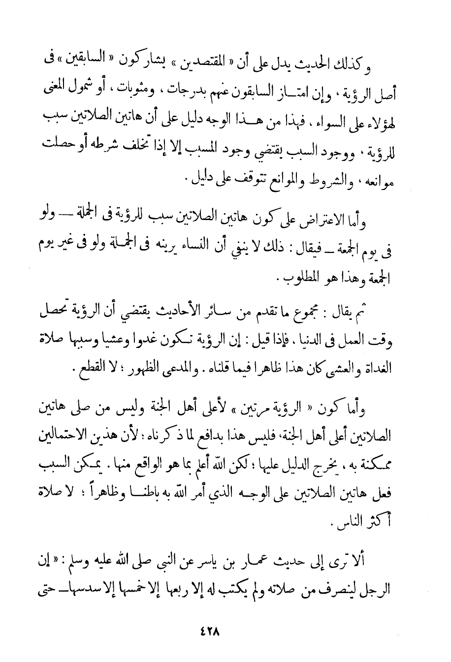 وَكَذَلِكَ الْحَدِيثُ يَدُلُّ عَلَى أَنَّ " الْمُقْتَصِدِينَ " يُشَارِكُونَ " السَّابِقِينَ " فِي أَصْلِ الرُّؤْيَةِ وَإِنْ امْتَازَ السَّابِقُونَ عَنْهُمْ بِدَرَجَاتِ وَمَثُوبَاتٍ أَوْ شُمُولِ الْمَعْنَى لِهَؤُلَاءِ عَلَى السَّوَاءِ فَهَذَا مِنْ هَذَا الْوَجْهِ دَلِيلٌ عَلَى أَنَّ هَاتَيْنِ الصَّلَاتَيْنِ سَبَبٌ لِلرُّؤْيَةِ وَوُجُودُ السَّبَبِ يَقْتَضِي وُجُودَ الْمُسَبَّبِ إلَّا إذَا تَخَلَّفَ شَرْطُهُ أَوْ حَصَلَتْ مَوَانِعُهُ وَالشُّرُوطُ وَالْمَوَانِعُ تَتَوَقَّفُ عَلَى دَلِيلٍ. وَأَمَّا الِاعْتِرَاضُ عَلَى كَوْنِ هَاتَيْنِ الصَّلَاتَيْنِ سَبَبًا لِلرُّؤْيَةِ فِي الْجُمْلَةِ - وَلَوْ فِي يَوْمِ الْجُمُعَةِ - فَيُقَالُ: ذَلِكَ لَا يَنْفِي أَنَّ النِّسَاءَ يَرَيْنَهُ فِي الْجُمْلَةِ وَلَوْ فِي غَيْرِ يَوْمِ الْجُمُعَةِ وَهَذَا هُوَ الْمَطْلُوبُ. ثُمَّ يُقَالُ: مَجْمُوعُ مَا تَقَدَّمَ مِنْ سَائِرِ الْأَحَادِيثِ يَقْتَضِي أَنَّ الرُّؤْيَةَ تَحْصُلُ وَقْتَ الْعَمَلِ فِي الدُّنْيَا فَإِذَا قِيلَ: إنَّ الرُّؤْيَةَ تَكُونُ غُدُوًّا وَعَشِيًّا وَسَبَبُهَا صَلَاةُ الْغَدَاةِ وَالْعَشِيِّ كَانَ هَذَا ظَاهِرًا فِيمَا قُلْنَاهُ. وَالْمُدَّعَى الظُّهُورُ؛ لَا الْقَطْعُ. وَأَمَّا كَوْنُ " الرُّؤْيَةِ مَرَّتَيْنِ " لِأَعْلَى أَهْلِ الْجَنَّةِ وَلَيْسَ مَنْ صَلَّى هَاتَيْنِ الصَّلَاتَيْنِ أَعْلَى أَهْلِ الْجَنَّةِ فَلَيْسَ هَذَا بِدَافِعِ لِمَا ذَكَرْنَاهُ؛ لِأَنَّ هَذَيْنِ الِاحْتِمَالَيْنِ مُمْكِنَةٌ بِهِ يَخْرُجُ الدَّلِيلُ عَلَيْهَا؛ لَكِنَّ اللَّهَ أَعْلَمُ بِمَا هُوَ الْوَاقِعُ مِنْهَا. يُمْكِنُ السَّبَبَ فِعْلُ هَاتَيْنِ الصَّلَاتَيْنِ عَلَى الْوَجْهِ الَّذِي أَمَرَ اللَّهُ بِهِ بَاطِنًا وَظَاهِرًا؛ لَا صَلَاةِ أَكْثَرِ النَّاسِ. أَلَا تَرَى إلَى حَدِيثِ عَمَّارِ بْنِ يَاسِرٍ عَنْ النَّبِيِّ صَلَّى اللَّهُ عَلَيْهِ وَسَلَّمَ {إنَّ الرَّجُلَ لَيَنْصَرِفُ مِنْ صَلَاتِهِ وَلَمْ يُكْتَبْ لَهُ إلَّا رُبُعُهَا إلَّا خُمُسُهَا إلَّا سُدُسُهَا - حَتَّى
