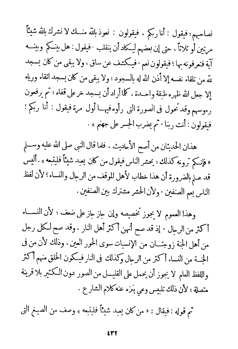 نُصَاحِبْهُمْ؛ فَيَقُولُ: أَنَا رَبُّكُمْ فَيَقُولُونَ: نَعُوذُ بِاَللَّهِ مِنْك لَا نُشْرِكُ بِاَللَّهِ شَيْئًا مَرَّتَيْنِ أَوْ ثَلَاثًا حَتَّى إنَّ بَعْضَهُمْ لَيَكَادُ أَنْ يَنْقَلِبَ فَيَقُولَ: هَلْ بَيْنَكُمْ وَبَيْنَهُ آيَةٌ فَتَعْرِفُونَهُ بِهَا؟ فَيَقُولُونَ نَعَمْ فَيُكْشَفُ عَنْ سَاقٍ وَلَا يَبْقَى مَنْ كَانَ يَسْجُدُ لِلَّهِ مِنْ تِلْقَاءِ نَفْسِهِ إلَّا أَذِنَ اللَّهُ لَهُ بِالسُّجُودِ؛ وَلَا يَبْقَى مَنْ كَانَ يَسْجُدُ اتِّقَاءً وَرِيَاءً إلَّا جَعَلَ اللَّهُ ظَهْرَهُ طَبَقَةً وَاحِدَةً كُلَّمَا أَرَادَ أَنْ يَسْجُدَ خَرَّ عَلَى قَفَاهُ؛ ثُمَّ يَرْفَعُونَ رُءُوسَهُمْ وَقَدْ تَحَوَّلَ فِي الصُّورَةِ الَّتِي رَأَوْهُ فِيهَا أَوَّلَ مَرَّةٍ فَيَقُولُ: أَنَا رَبُّكُمْ فَيَقُولُونَ: أَنْتَ رَبُّنَا ثُمَّ يُضْرَبُ الْجِسْرُ عَلَى جَهَنَّمَ} . هَذَانِ الْحَدِيثَانِ مِنْ أَصَحِّ الْأَحَادِيثِ فَلَمَّا {قَالَ النَّبِيُّ صَلَّى اللَّهُ عَلَيْهِ وَسَلَّمَ فَإِنَّكُمْ تَرَوْنَهُ كَذَلِكَ؛ يُحْشَرُ النَّاسُ فَيَقُولُ مَنْ كَانَ يَعْبُدُ شَيْئًا فَلْيَتْبَعْهُ} . أَلَيْسَ قَدْ عُلِمَ بِالضَّرُورَةِ أَنَّ هَذَا خِطَابٌ لِأَهْلِ الْمَوْقِفِ مِنْ الرِّجَالِ وَالنِّسَاءِ؟ لِأَنَّ لَفْظَ النَّاسِ يَعُمُّ الصِّنْفَيْنِ وَلِأَنَّ الْحَشْرَ مُشْتَرَكٌ بَيْنَ الصِّنْفَيْنِ. وَهَذَا الْعُمُومُ لَا يَجُوزُ تَخْصِيصُهُ وَإِنْ جَازَ جَازَ عَلَى ضَعْفٍ؛ لِأَنَّ النِّسَاءَ أَكْثَرُ مِنْ الرِّجَالِ إذْ قَدْ صَحَّ أَنَّهُنَّ أَكْثَرُ أَهْلِ النَّارِ وَقَدْ صَحَّ لِكُلِّ رَجُلٍ مِنْ أَهْلِ الْجَنَّةِ زَوْجَتَانِ مِنْ الْإِنْسِيَّاتِ سِوَى الْحُورِ الْعِينِ وَذَلِكَ لِأَنَّ مَنْ فِي الْجَنَّةِ مِنْ النِّسَاءِ أَكْثَرُ مِنْ الرِّجَالِ وَكَذَلِكَ فِي النَّارِ فَيَكُونُ الْخَلْقُ مِنْهُمْ أَكْثَرَ وَاللَّفْظُ الْعَامُّ لَا يَجُوزُ أَنْ يُحْمَلَ عَلَى الْقَلِيلِ مِنْ الصُّوَرِ دُونَ الْكَثِيرِ بِلَا قَرِينَةٍ مُتَّصِلَةٍ؛ لِأَنَّ ذَلِكَ تَلْبِيسٌ وَعِيٌّ يُنَزَّهُ عَنْهُ كَلَامُ الشَّارِعِ. ثُمَّ قَوْلُهُ: فَيُقَالُ {: مَنْ كَانَ يَعْبُدُ شَيْئًا فَلْيَتْبَعْهُ} وَصْفٌ مِنْ الصِّيَغِ الَّتِي