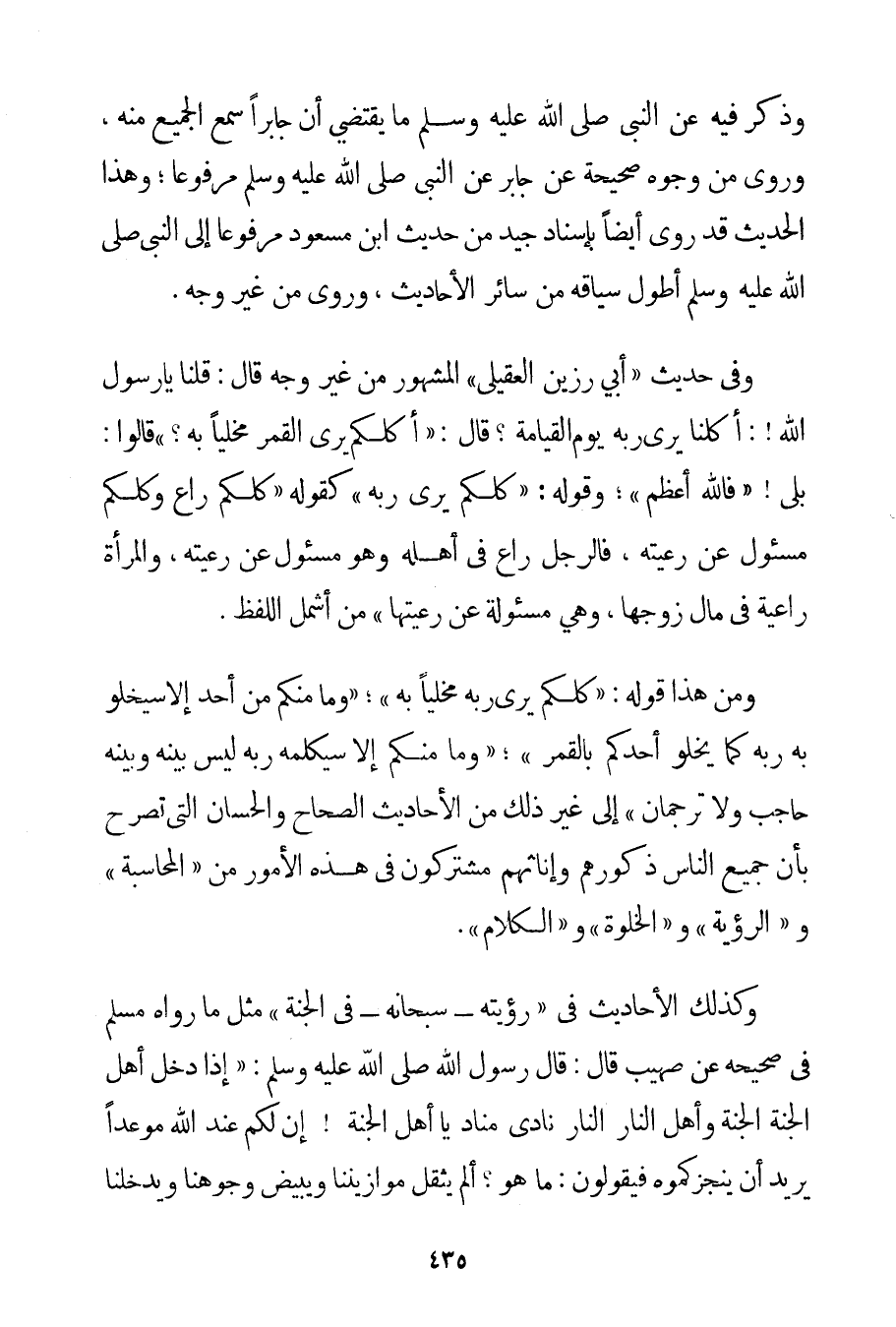 وَذَكَرَ فِيهِ عَنْ النَّبِيِّ صَلَّى اللَّهُ عَلَيْهِ وَسَلَّمَ مَا يَقْتَضِي أَنَّ جَابِرًا سَمِعَ الْجَمِيعَ مِنْهُ وَرُوِيَ مِنْ وُجُوهٍ صَحِيحَةٍ عَنْ جَابِرٍ عَنْ النَّبِيِّ صَلَّى اللَّهُ عَلَيْهِ وَسَلَّمَ مَرْفُوعًا؛ وَهَذَا الْحَدِيثُ قَدْ رُوِيَ أَيْضًا بِإِسْنَادِ جَيِّدٍ مِنْ حَدِيثِ ابْنِ مَسْعُودٍ مَرْفُوعًا إلَى النَّبِيِّ صَلَّى اللَّهُ عَلَيْهِ وَسَلَّمَ أَطْوَلُ سِيَاقِهِ مِنْ سَائِرِ الْأَحَادِيثِ وَرُوِيَ مِنْ غَيْرِ وَجْهٍ. وَفِي حَدِيثِ {أَبِي رَزِينٍ العقيلي الْمَشْهُورِ مِنْ غَيْرِ وَجْهٍ قَالَ: قُلْنَا يَا رَسُولَ اللَّهِ: أَكُلُّنَا يَرَى رَبَّهُ يَوْمَ الْقِيَامَةِ؟ قَالَ: أَكُلُّكُمْ يَرَى الْقَمَرَ مَخْلِيًّا بِهِ؟ قَالُوا: بَلَى فَاَللَّهُ أَعْظَمُ} وَقَوْلُهُ: {كُلُّكُمْ يَرَى رَبَّهُ} كَقَوْلِهِ {كُلُّكُمْ رَاعٍ وَكُلُّكُمْ مَسْئُولٌ عَنْ رَعِيَّتِهِ فَالرَّجُلُ رَاعٍ فِي أَهْلِهِ وَهُوَ مَسْئُولٌ عَنْ رَعِيَّتِهِ وَالْمَرْأَةُ رَاعِيَةٌ فِي مَالِ زَوْجِهَا وَهِيَ مَسْئُولَةٌ عَنْ رَعِيَّتِهَا} مِنْ أَشْمَلِ اللَّفْظِ. وَمِنْ هَذَا قَوْلُهُ: {كُلُّكُمْ يَرَى رَبَّهُ مَخْلِيًّا بِهِ} {وَمَا مِنْكُمْ مِنْ أَحَدٍ إلَّا سَيَخْلُو بِهِ رَبُّهُ كَمَا يَخْلُو أَحَدُكُمْ بِالْقَمَرِ} {وَمَا مِنْكُمْ إلَّا سَيُكَلِّمُهُ رَبُّهُ لَيْسَ بَيْنَهُ وَبَيْنَهُ حَاجِبٌ وَلَا تُرْجُمَانٌ} إلَى غَيْرِ ذَلِكَ مِنْ الْأَحَادِيثِ الصِّحَاحِ وَالْحِسَانِ الَّتِي تُصَرِّحُ بِأَنَّ جَمِيعَ النَّاسِ ذُكُورِهِمْ وَإِنَاثِهِمْ مُشْتَرِكُونَ فِي هَذِهِ الْأُمُورِ مِنْ " الْمُحَاسَبَةِ " وَ " الرُّؤْيَةِ " وَ " الْخَلْوَةِ " وَ " الْكَلَامِ ". وَكَذَلِكَ الْأَحَادِيثُ فِي " رُؤْيَتِهِ - سُبْحَانَهُ - فِي الْجَنَّةِ " مِثْلُ مَا رَوَاهُ مُسْلِمٌ فِي صَحِيحِهِ عَنْ صهيب قَالَ: {قَالَ رَسُولُ اللَّهِ صَلَّى اللَّهُ عَلَيْهِ وَسَلَّمَ إذَا دَخَلَ أَهْلُ الْجَنَّةِ الْجَنَّةَ وَأَهْلُ النَّارِ النَّارَ نَادَى مُنَادٍ يَا أَهْلَ الْجَنَّةِ إنَّ لَكُمْ عِنْدَ اللَّهِ مَوْعِدًا يُرِيدُ أَنْ ينجزكموه فَيَقُولُونَ: مَا هُوَ؟ أَلَمْ يُثَقِّلْ مَوَازِينَنَا وَيُبَيِّضْ وُجُوهَنَا وَيُدْخِلْنَا