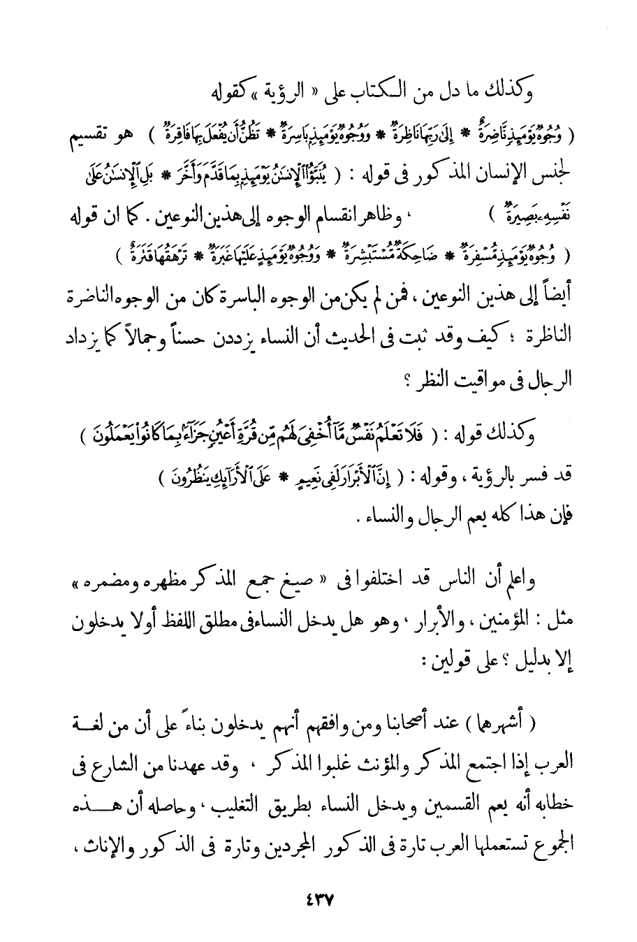 وَكَذَلِكَ مَا دَلَّ مِنْ الْكِتَابِ عَلَى " الرُّؤْيَةِ " كَقَوْلِهِ {وُجُوهٌ يَوْمَئِذٍ نَاضِرَةٌ} {إلَى رَبِّهَا نَاظِرَةٌ} {وَوُجُوهٌ يَوْمَئِذٍ بَاسِرَةٌ} {تَظُنُّ أَنْ يُفْعَلَ بِهَا فَاقِرَةٌ} هُوَ تَقْسِيمٌ لِجِنْسِ الْإِنْسَانِ الْمَذْكُورِ فِي قَوْلِهِ: {يُنَبَّأُ الْإِنْسَانُ يَوْمَئِذٍ بِمَا قَدَّمَ وَأَخَّرَ} {بَلِ الْإِنْسَانُ عَلَى نَفْسِهِ بَصِيرَةٌ} وَظَاهِرُ انْقِسَامِ الْوُجُوهِ إلَى هَذَيْنِ النَّوْعَيْنِ. كَمَا أَنَّ قَوْلَهُ {وُجُوهٌ يَوْمَئِذٍ مُسْفِرَةٌ} {ضَاحِكَةٌ مُسْتَبْشِرَةٌ} {وَوُجُوهٌ يَوْمَئِذٍ عَلَيْهَا غَبَرَةٌ} {تَرْهَقُهَا قَتَرَةٌ} أَيْضًا إلَى هَذَيْنِ النَّوْعَيْنِ فَمَنْ لَمْ يَكُنْ مِنْ الْوُجُوهِ الْبَاسِرَةِ كَانَ مِنْ الْوُجُوهِ النَّاضِرَةِ النَّاظِرَةِ؛ كَيْفَ وَقَدْ ثَبَتَ فِي الْحَدِيثِ أَنَّ النِّسَاءَ يَزْدَدْنَ حُسْنًا وَجَمَالًا كَمَا يَزْدَادُ الرِّجَالُ فِي مَوَاقِيتِ النَّظَرِ؟ وَكَذَلِكَ قَوْلُهُ: {فَلَا تَعْلَمُ نَفْسٌ مَا أُخْفِيَ لَهُمْ مِنْ قُرَّةِ أَعْيُنٍ جَزَاءً بِمَا كَانُوا يَعْمَلُونَ} قَدْ فُسِّرَ بِالرُّؤْيَةِ وَقَوْلُهُ: {إنَّ الْأَبْرَارَ لَفِي نَعِيمٍ} {عَلَى الْأَرَائِكِ يَنْظُرُونَ} فَإِنَّ هَذَا كُلَّهُ يَعُمُّ الرِّجَالَ وَالنِّسَاءَ. وَاعْلَمْ أَنَّ النَّاسَ قَدْ اخْتَلَفُوا فِي " صِيَغِ جَمْعِ الْمُذَكَّرِ مُظْهَرِهِ وَمُضْمَرِهِ " مِثْلُ: الْمُؤْمِنِينَ وَالْأَبْرَارِ وَهُوَ هَلْ يَدْخُلُ النِّسَاءُ فِي مُطْلَقِ اللَّفْظِ أَوْ لَا يَدْخُلُونَ إلَّا بِدَلِيلِ؟ عَلَى قَوْلَيْنِ: (أَشْهَرُهُمَا عِنْدَ أَصْحَابِنَا وَمَنْ وَافَقَهُمْ أَنَّهُمْ يَدْخُلُونَ بِنَاءً عَلَى أَنَّ مِنْ لُغَةِ الْعَرَبِ إذَا اجْتَمَعَ الْمُذَكَّرُ وَالْمُؤَنَّثُ غَلَّبُوا الْمُذَكَّرَ وَقَدْ عَهِدْنَا مِنْ الشَّارِعِ فِي خِطَابِهِ أَنَّهُ يَعُمُّ الْقِسْمَيْنِ وَيَدْخُلُ النِّسَاءُ بِطَرِيقِ التَّغْلِيبِ وَحَاصِلُهُ أَنَّ هَذِهِ الْجُمُوعَ تَسْتَعْمِلُهَا الْعَرَبُ تَارَةً فِي الذُّكُورِ الْمُجَرَّدِينَ وَتَارَةً فِي الذُّكُورِ وَالْإِنَاثِ