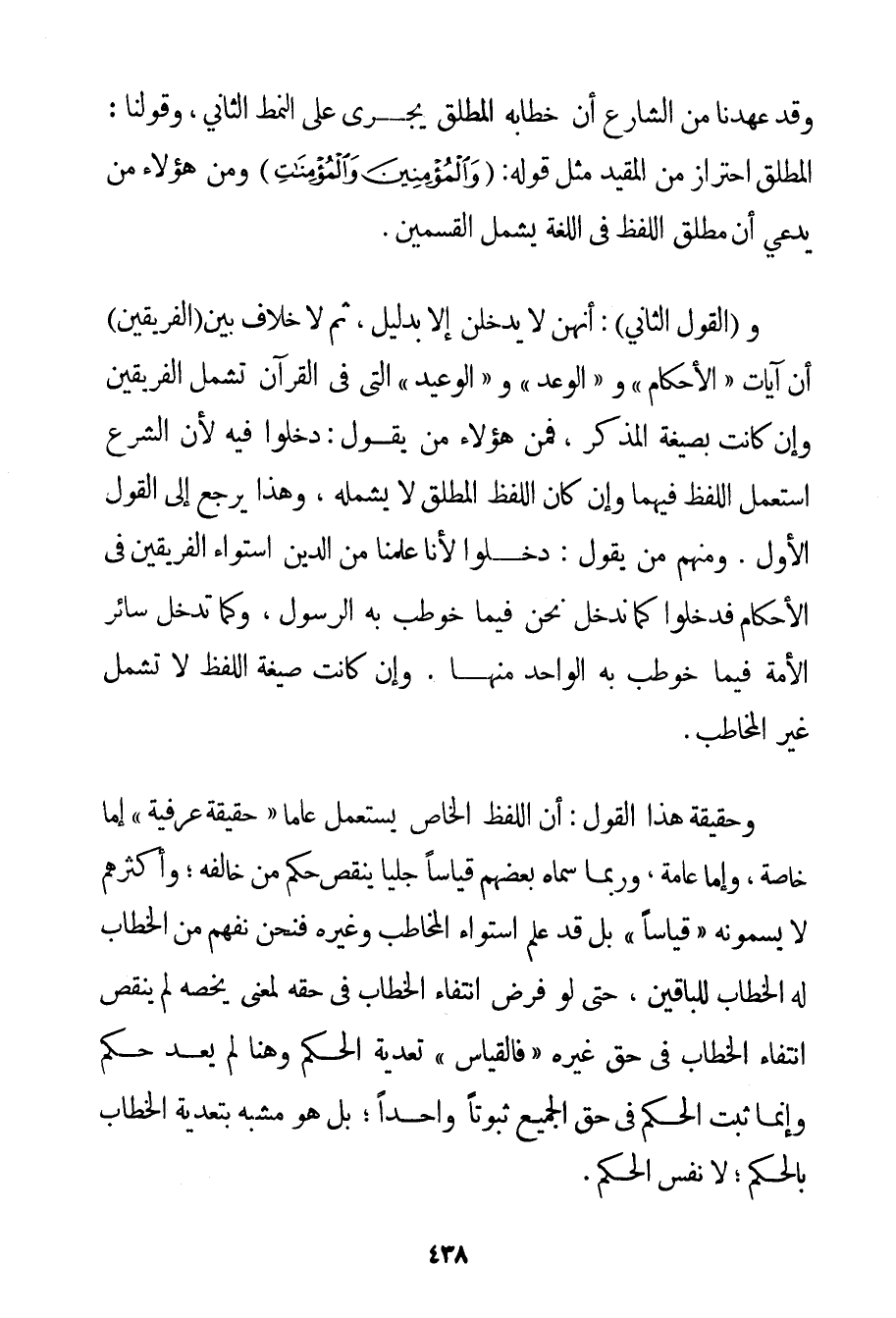 وَقَدْ عَهِدْنَا مِنْ الشَّارِعِ أَنَّ خِطَابَهُ الْمُطْلَقَ يَجْرِي عَلَى النَّمَطِ الثَّانِي وَقَوْلُنَا: الْمُطْلَقَ احْتِرَازٌ مِنْ الْمُقَيَّدِ مِثْلُ قَوْلِهِ: {وَالْمُؤْمِنِينَ وَالْمُؤْمِنَاتِ} وَمِنْ هَؤُلَاءِ مَنْ يَدَّعِي أَنَّ مُطْلَقَ اللَّفْظِ فِي اللُّغَةِ يَشْمَلُ الْقِسْمَيْنِ. وَ (الْقَوْلُ الثَّانِي: إنَّهُنَّ لَا يَدْخُلْنَ إلَّا بِدَلِيلِ ثُمَّ لَا خِلَافَ بَيْنَ الْفَرِيقَيْنِ أَنَّ آيَاتِ " الْأَحْكَامِ " وَ " الْوَعْدِ " وَ " الْوَعِيدِ " الَّتِي فِي الْقُرْآنِ تَشْمَلُ الْفَرِيقَيْنِ وَإِنْ كَانَتْ بِصِيغَةِ الْمُذَكَّرِ فَمِنْ هَؤُلَاءِ مَنْ يَقُولُ: دَخَلُوا فِيهِ لِأَنَّ الشَّرْعَ اسْتَعْمَلَ اللَّفْظَ فِيهِمَا وَإِنْ كَانَ اللَّفْظُ الْمُطْلَقُ لَا يَشْمَلُهُ وَهَذَا يَرْجِعُ إلَى الْقَوْلِ الْأَوَّلِ. وَمِنْهُمْ مَنْ يَقُولُ: دَخَلُوا لِأَنَّا عَلِمْنَا مِنْ الدِّينِ اسْتِوَاءَ الْفَرِيقَيْنِ فِي الْأَحْكَامِ فَدَخَلُوا كَمَا نَدْخُلُ نَحْنُ فِيمَا خُوطِبَ بِهِ الرَّسُولُ وَكَمَا تَدْخُلُ سَائِرُ الْأُمَّةِ فِيمَا خُوطِبَ بِهِ الْوَاحِدُ مِنْهَا. وَإِنْ كَانَتْ صِيغَةُ اللَّفْظِ لَا تَشْمَلُ غَيْرَ الْمُخَاطَبِ. وَحَقِيقَةُ هَذَا الْقَوْلِ: أَنَّ اللَّفْظَ الْخَاصَّ يُسْتَعْمَلُ عَامًّا " حَقِيقَةً عُرْفِيَّةً " إمَّا خَاصَّةً وَإِمَّا عَامَّةً وَرُبَّمَا سَمَّاهُ بَعْضُهُمْ قِيَاسًا جَلِيًّا يَنْقُصُ حُكْمَ مَنْ خَالَفَهُ؛ وَأَكْثَرُهُمْ لَا يُسَمُّونَهُ " قِيَاسًا " بَلْ قَدْ عُلِمَ اسْتِوَاءُ الْمُخَاطَبِ وَغَيْرِهِ فَنَحْنُ نَفْهَمُ مِنْ الْخِطَابِ لَهُ الْخِطَابَ لِلْبَاقِينَ حَتَّى لَوْ فُرِضَ انْتِفَاءُ الْخِطَابِ فِي حَقِّهِ لِمَعْنَى يَخُصُّهُ لَمْ يَنْقُصْ انْتِفَاءَ الْخِطَابِ فِي حَقِّ غَيْرِهِ " فَالْقِيَاسُ " تَعْدِيَةُ الْحُكْمِ وَهُنَا لَمْ يُعَدَّ حُكْمٌ وَإِنَّمَا ثَبَتَ الْحُكْمُ فِي حَقِّ الْجَمِيعِ ثُبُوتًا وَاحِدًا؛ بَلْ هُوَ مُشَبَّهٌ بِتَعْدِيَةِ الْخِطَابِ بِالْحُكْمِ؛ لَا نَفْسِ الْحُكْمِ.
