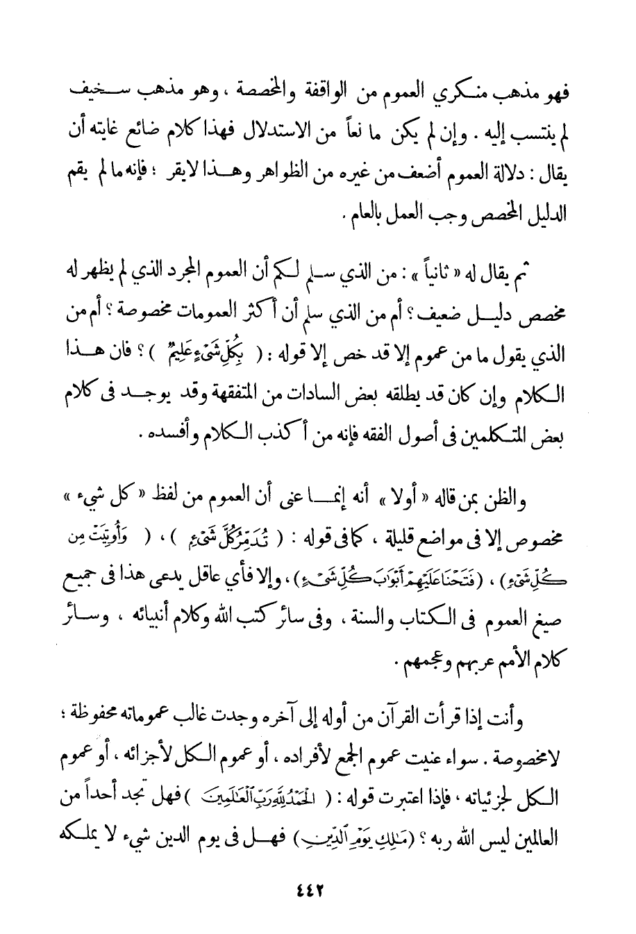 فَهُوَ مَذْهَبُ مُنْكِرِي الْعُمُومِ مِنْ الْوَاقِفَةِ وَالْمُخَصِّصَةِ وَهُوَ مَذْهَبٌ سَخِيفٌ لَمْ يُنْتَسَبْ إلَيْهِ. وَإِنْ لَمْ يَكُنْ مَانِعًا مِنْ الِاسْتِدْلَالِ فَهَذَا كَلَامٌ ضَائِعٌ غَايَتُهُ أَنْ يُقَالَ: دَلَالَةُ الْعُمُومِ أَضْعَفُ مِنْ غَيْرِهِ مِنْ الظَّوَاهِرِ وَهَذَا لَا يُقَرُّ؛ فَإِنَّهُ مَا لَمْ يَقُمْ الدَّلِيلُ الْمُخَصِّصُ وَجَبَ الْعَمَلُ بِالْعَامِّ. ثُمَّ يُقَالَ " ثَانِيًا ": مَنْ الَّذِي سَلَّمَ لَكُمْ أَنَّ الْعُمُومَ الْمُجَرَّدَ الَّذِي لَمْ يَظْهَرْ لَهُ مُخَصِّصٌ دَلِيلٌ ضَعِيفٌ؟ أَمْ مَنْ الَّذِي سَلَّمَ أَنَّ أَكْثَرَ العمومات مَخْصُوصَةٌ؟ أَمْ مَنْ الَّذِي يَقُولُ مَا مِنْ عُمُومٍ إلَّا قَدْ خُصَّ إلَّا قَوْلَهُ: {بِكُلِّ شَيْءٍ عَلِيمٌ} ؟ فَإِنَّ هَذَا الْكَلَامَ وَإِنْ كَانَ قَدْ يُطْلِقُهُ بَعْضُ السَّادَاتِ مِنْ الْمُتَفَقِّهَةِ وَقَدْ يُوجَدُ فِي كَلَامِ بَعْضِ الْمُتَكَلِّمِينَ فِي أُصُولِ الْفِقْهِ فَإِنَّهُ مِنْ أَكْذَبِ الْكَلَامِ وَأَفْسَدِهِ. وَالظَّنُّ بِمَنْ قَالَهُ " أَوَّلًا " أَنَّهُ إنَّمَا عَنَى أَنَّ الْعُمُومَ مِنْ لَفْظِ " كُلِّ شَيْءٍ " مَخْصُوصٌ إلَّا فِي مَوَاضِعَ قَلِيلَةٍ كَمَا فِي قَوْلِهِ: {تُدَمِّرُ كُلَّ شَيْءٍ} {وَأُوتِيَتْ مِنْ كُلِّ شَيْءٍ} {فَتَحْنَا عَلَيْهِمْ أَبْوَابَ كُلِّ شَيْءٍ} وَإِلَّا فَأَيُّ عَاقِلٍ يَدَّعِي هَذَا فِي جَمِيعِ صِيَغِ الْعُمُومِ فِي الْكِتَابِ وَالسُّنَّةِ وَفِي سَائِرِ كُتُبِ اللَّهِ وَكَلَامِ أَنْبِيَائِهِ وَسَائِرِ كَلَامِ الْأُمَمِ عَرَبِهِمْ وَعَجَمِهِمْ. وَأَنْتَ إذَا قَرَأْت الْقُرْآنَ مِنْ أَوَّلِهِ إلَى آخِرِهِ وَجَدْت غَالِبَ عموماته مَحْفُوظَةً؛ لَا مَخْصُوصَةً. سَوَاءٌ عَنَيْت عُمُومَ الْجَمْعِ لِأَفْرَادِهِ أَوْ عُمُومَ الْكُلِّ لِأَجْزَائِهِ أَوْ عُمُومَ الْكُلِّ لِجُزَيْئَاتِهِ فَإِذَا اعْتَبَرْت قَوْلَهُ: {الْحَمْدُ لِلَّهِ رَبِّ الْعَالَمِينَ} فَهَلْ تَجِدُ أَحَدًا مِنْ الْعَالَمِينَ لَيْسَ اللَّهُ رَبَّهُ؟ {مَالِكِ يَوْمِ الدِّينِ} فَهَلْ فِي يَوْمِ الدِّينِ شَيْءٌ لَا يَمْلِكُهُ