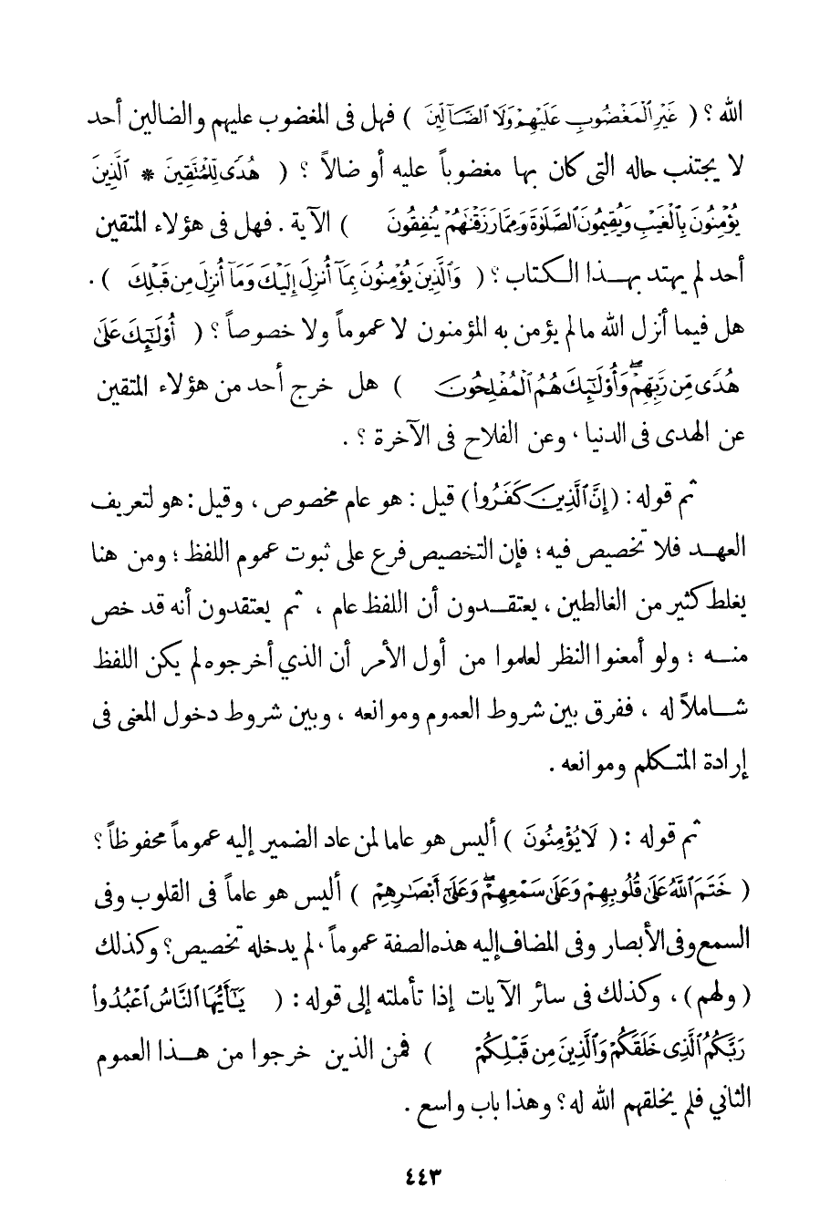 اللَّهُ؟ {غَيْرِ الْمَغْضُوبِ عَلَيْهِمْ وَلَا الضَّالِّينَ} فَهَلْ فِي الْمَغْضُوبِ عَلَيْهِمْ وَالضَّالِّينَ أَحَدٌ لَا يُجْتَنَبُ حَالُهُ الَّتِي كَانَ بِهَا مَغْضُوبًا عَلَيْهِ أَوْ ضَالًّا؟ {هُدًى لِلْمُتَّقِينَ} {الَّذِينَ يُؤْمِنُونَ بِالْغَيْبِ وَيُقِيمُونَ الصَّلَاةَ وَمِمَّا رَزَقْنَاهُمْ يُنْفِقُونَ} الْآيَةَ. فَهَلْ فِي هَؤُلَاءِ الْمُتَّقِينَ أَحَدٌ لَمْ يَهْتَدِ بِهَذَا الْكِتَابِ؟ {وَالَّذِينَ يُؤْمِنُونَ بِمَا أُنْزِلَ إلَيْكَ وَمَا أُنْزِلَ مِنْ قَبْلِكَ} . هَلْ فِيمَا أَنْزَلَ اللَّهُ مَا لَمْ يُؤْمِنْ بِهِ الْمُؤْمِنُونَ لَا عُمُومًا وَلَا خُصُوصًا؟ {أُولَئِكَ عَلَى هُدًى مِنْ رَبِّهِمْ وَأُولَئِكَ هُمُ الْمُفْلِحُونَ} هَلْ خَرَجَ أَحَدٌ مِنْ هَؤُلَاءِ الْمُتَّقِينَ عَنْ الْهُدَى فِي الدُّنْيَا وَعَنْ الْفَلَاحِ فِي الْآخِرَةِ؟ . ثُمَّ قَوْلُهُ: {إنَّ الَّذِينَ كَفَرُوا} قِيلَ: هُوَ عَامٌّ مَخْصُوصٌ وَقِيلَ: هُوَ لِتَعْرِيفِ الْعَهْدِ فَلَا تَخْصِيصَ فِيهِ؛ فَإِنَّ التَّخْصِيصَ فَرْعٌ عَلَى ثُبُوتِ عُمُومِ اللَّفْظِ؛ وَمِنْ هُنَا يَغْلَطُ كَثِيرٌ مِنْ الغالطين يَعْتَقِدُونَ أَنَّ اللَّفْظَ عَامٌّ ثُمَّ يَعْتَقِدُونَ أَنَّهُ قَدْ خُصَّ مِنْهُ؛ وَلَوْ أَمْعَنُوا النَّظَرَ لَعَلِمُوا مِنْ أَوَّلِ الْأَمْرِ أَنَّ الَّذِي أَخْرَجُوهُ لَمْ يَكُنْ اللَّفْظُ شَامِلًا لَهُ فَفُرِّقَ بَيْنَ شُرُوطِ الْعُمُومِ وَمَوَانِعِهِ وَبَيْنَ شُرُوطِ دُخُولِ الْمَعْنَى فِي إرَادَةِ الْمُتَكَلِّمِ وَمَوَانِعِهِ. ثُمَّ قَوْلُهُ: {لَا يُؤْمِنُونَ} أَلَيْسَ هُوَ عَامًّا لِمَنْ عَادَ الضَّمِيرُ إلَيْهِ عُمُومًا مَحْفُوظًا؟ {خَتَمَ اللَّهُ عَلَى قُلُوبِهِمْ وَعَلَى سَمْعِهِمْ وَعَلَى أَبْصَارِهِمْ} أَلَيْسَ هُوَ عَامًّا فِي الْقُلُوبِ وَفِي السَّمْعِ وَفِي الْأَبْصَارِ وَفِي الْمُضَافِ إلَيْهِ هَذِهِ الصِّفَةُ عُمُومًا لَمْ يَدْخُلْهُ تَخْصِيصٌ؟ وَكَذَلِكَ (وَلَهُمْ) وَكَذَلِكَ فِي سَائِرِ الْآيَاتِ إذَا تَأَمَّلْته إلَى قَوْلِهِ: {يَا أَيُّهَا النَّاسُ اعْبُدُوا رَبَّكُمُ الَّذِي خَلَقَكُمْ وَالَّذِينَ مِنْ قَبْلِكُمْ} فَمَنْ الَّذِينَ خَرَجُوا مِنْ هَذَا الْعُمُومِ الثَّانِي فَلَمْ يَخْلُقْهُمْ اللَّهُ لَهُ؟ وَهَذَا بَابٌ وَاسِعٌ.
