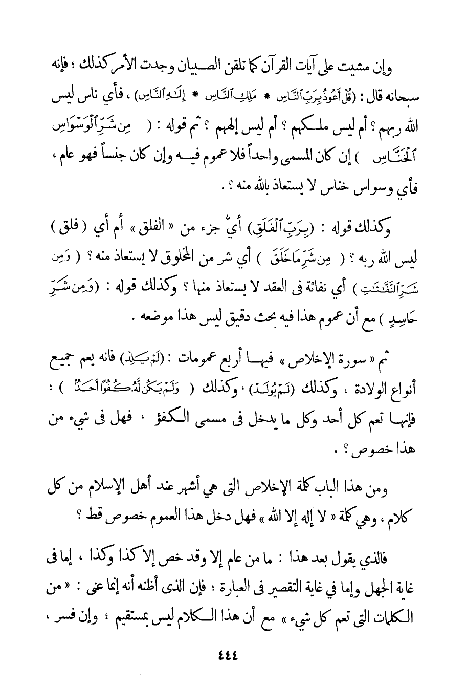 وَإِنْ مَشَيْت عَلَى آيَاتِ الْقُرْآنِ كَمَا تُلَقَّنُ الصِّبْيَانُ وَجَدْت الْأَمْرَ كَذَلِكَ؛ فَإِنَّهُ سُبْحَانَهُ قَالَ: {قُلْ أَعُوذُ بِرَبِّ النَّاسِ} {مَلِكِ النَّاسِ} {إلَهِ النَّاسِ} فَأَيُّ نَاسٍ لَيْسَ اللَّهُ رَبَّهُمْ؟ أَمْ لَيْسَ مَلِكَهُمْ؟ أَمْ لَيْسَ إلَهَهُمْ؟ ثُمَّ قَوْلُهُ: {مِنْ شَرِّ الْوَسْوَاسِ الْخَنَّاسِ} إنْ كَانَ الْمُسَمَّى وَاحِدًا فَلَا عُمُومَ فِيهِ وَإِنْ كَانَ جِنْسًا فَهُوَ عَامٌّ فَأَيُّ وَسْوَاسٍ خَنَّاسٍ لَا يُسْتَعَاذُ بِاَللَّهِ مِنْهُ؟ . وَكَذَلِكَ قَوْلُهُ: {بِرَبِّ الْفَلَقِ} أَيُّ جُزْءٍ مِنْ " الْفَلَقِ " أَمْ أَيُّ (فَلَقٍ لَيْسَ اللَّهُ رَبَّهُ؟ {مِنْ شَرِّ مَا خَلَقَ} أَيُّ شَرٍّ مِنْ الْمَخْلُوقِ لَا يُسْتَعَاذُ مِنْهُ؟ {وَمِنْ شَرِّ النَّفَّاثَاتِ} أَيُّ نَفَّاثَةٍ فِي الْعُقَدِ لَا يُسْتَعَاذُ مِنْهَا؟ وَكَذَلِكَ قَوْلُهُ: {وَمِنْ شَرِّ حَاسِدٍ} مَعَ أَنَّ عُمُومَ هَذَا فِيهِ بَحْثٌ دَقِيقٌ لَيْسَ هَذَا مَوْضِعَهُ. ثُمَّ " سُورَةُ الْإِخْلَاصِ " فِيهَا أَرْبَعُ عمومات: {لَمْ يَلِدْ} فَإِنَّهُ يَعُمُّ جَمِيعَ أَنْوَاعِ الْوِلَادَةِ وَكَذَلِكَ {وَلَمْ يُولَدْ} وَكَذَلِكَ {وَلَمْ يَكُنْ لَهُ كُفُوًا أَحَدٌ} فَإِنَّهَا تَعُمُّ كُلَّ أَحَدٍ وَكُلَّ مَا يَدْخُلُ فِي مُسَمَّى الْكُفُؤِ فَهَلْ فِي شَيْءٍ مِنْ هَذَا خُصُوصٌ؟ . وَمِنْ هَذَا الْبَابِ كَلِمَةُ الْإِخْلَاصِ الَّتِي هِيَ أَشْهَرُ عِنْدَ أَهْلِ الْإِسْلَامِ مِنْ كُلِّ كَلَامٍ وَهِيَ كَلِمَةُ " لَا إلَهَ إلَّا اللَّهُ " فَهَلْ دَخَلَ هَذَا الْعُمُومَ خُصُوصٌ قَطُّ؟ فَاَلَّذِي يَقُولُ بَعْدَ هَذَا: مَا مِنْ عَامٍّ إلَّا وَقَدْ خُصَّ إلَّا كَذَا وَكَذَا إمَّا فِي غَايَةِ الْجَهْلِ وَإِمَّا فِي غَايَةِ التَّقْصِيرِ فِي الْعِبَارَةِ؛ فَإِنَّ الَّذِي أَظُنُّهُ أَنَّهُ إنَّمَا عَنَى: " مِنْ الْكَلِمَاتِ الَّتِي تَعُمُّ كُلَّ شَيْءٍ " مَعَ أَنَّ هَذَا الْكَلَامَ لَيْسَ بِمُسْتَقِيمِ؛ وَإِنْ فُسِّرَ