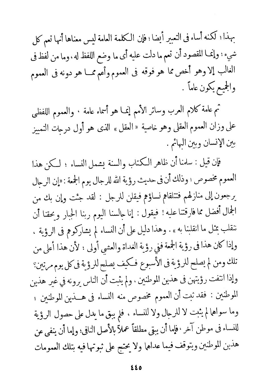 بِهَذَا؛ لَكِنَّهُ أَسَاءَ فِي التَّعْبِيرِ أَيْضًا؛ فَإِنَّ الْكَلِمَةَ الْعَامَّةَ لَيْسَ مَعْنَاهَا أَنَّهَا تَعُمُّ كُلَّ شَيْءٍ؛ وَإِنَّمَا الْمَقْصُودُ أَنْ تَعُمَّ مَا دَلَّتْ عَلَيْهِ أَيْ مَا وُضِعَ اللَّفْظُ لَهُ وَمَا مِنْ لَفْظٍ فِي الْغَالِبِ إلَّا وَهُوَ أَخَصُّ مِمَّا هُوَ فَوْقَهُ فِي الْعُمُومِ وَأَعَمُّ مِمَّا هُوَ دُونَهُ فِي الْعُمُومِ وَالْجَمِيعُ يَكُونُ عَامًّا. ثُمَّ عَامَّةُ كَلَامِ الْعَرَبِ وَسَائِرِ الْأُمَمِ إنَّمَا هُوَ أَسْمَاءٌ عَامَّةٌ وَالْعُمُومُ اللَّفْظِيُّ عَلَى وِزَانِ الْعُمُومِ الْعَقْلِيِّ وَهُوَ خَاصِّيَّةُ " الْعَقْلِ " الَّذِي هُوَ أَوَّلُ دَرَجَاتِ التَّمْيِيزِ بَيْنَ الْإِنْسَانِ وَبَيْنَ الْبَهَائِمِ. فَإِنْ قِيلَ: سَلَّمْنَا أَنَّ ظَاهِرَ الْكِتَابِ وَالسُّنَّةِ يَشْمَلُ النِّسَاءَ؛ لَكِنَّ هَذَا الْعُمُومَ مَخْصُوصٌ؛ وَذَلِكَ أَنَّ فِي حَدِيثِ رُؤْيَةِ اللَّهِ لِلرِّجَالِ يَوْمَ الْجُمُعَةِ: {إنَّ الرِّجَالَ يَرْجِعُونَ إلَى مَنَازِلِهِمْ فَتَتَلَقَّاهُمْ نِسَاؤُهُمْ فَيَقُلْنَ لِلرَّجُلِ: لَقَدْ جِئْت وَإِنَّ بِك مِنْ الْجَمَالِ أَفْضَلَ مِمَّا فَارَقْتنَا عَلَيْهِ فَيَقُولُ: إنَّا جَالَسْنَا الْيَوْمَ رَبَّنَا الْجَبَّارَ وَيُحِقُّنَا أَنْ نَنْقَلِبَ بِمِثْلِ مَا انْقَلَبْنَا بِهِ} . وَهَذَا دَلِيلٌ عَلَى أَنَّ النِّسَاءَ لَمْ يُشَارِكُوهُمْ فِي الرُّؤْيَةِ وَإِذَا كَانَ هَذَا فِي رُؤْيَةِ الْجُمُعَةِ فَفِي رُؤْيَةِ الْغَدَاةِ وَالْعَشِيِّ أَوْلَى؛ لِأَنَّ هَذَا أَعْلَى مِنْ تِلْكَ وَمَنْ لَمْ يَصْلُحْ لِلرُّؤْيَةِ فِي الْأُسْبُوعِ فَكَيْفَ يَصْلُحُ لِلرُّؤْيَةِ فِي كُلِّ يَوْمٍ مَرَّتَيْنِ؟ وَإِذَا انْتَفَتْ رُؤْيَتُهُنَّ فِي هَذَيْنِ الْمَوْطِنَيْنِ وَلَمْ يَثْبُتْ أَنَّ النَّاسَ يَرَوْنَهُ فِي غَيْرِ هَذَيْنِ الْمَوْطِنَيْنِ: فَقَدْ ثَبَتَ أَنَّ الْعُمُومَ مَخْصُوصٌ مِنْهُ النِّسَاءُ فِي هَذَيْنِ الْمَوْطِنَيْنِ؛ وَمَا سِوَاهُمَا لَمْ يَثْبُتْ لَا لِلرِّجَالِ وَلَا لِلنِّسَاءِ فَلَمْ يَبْقَ مَا يَدُلُّ عَلَى حُصُولِ الرُّؤْيَةِ لِلنِّسَاءِ فِي مَوْطِنٍ آخَرَ فَإِمَّا أَنْ يَبْقَى مُطْلَقًا عَمَلًا بِالْأَصْلِ النَّافِي؛ وَإِمَّا أَنْ يُنْفَى عَنْ هَذَيْنِ الْمَوْطِنَيْنِ وَيُتَوَقَّفَ فِيمَا عَدَاهُمَا وَلَا يُحْتَجَّ عَلَى ثُبُوتِهَا فِيهِ بِتِلْكَ العمومات
